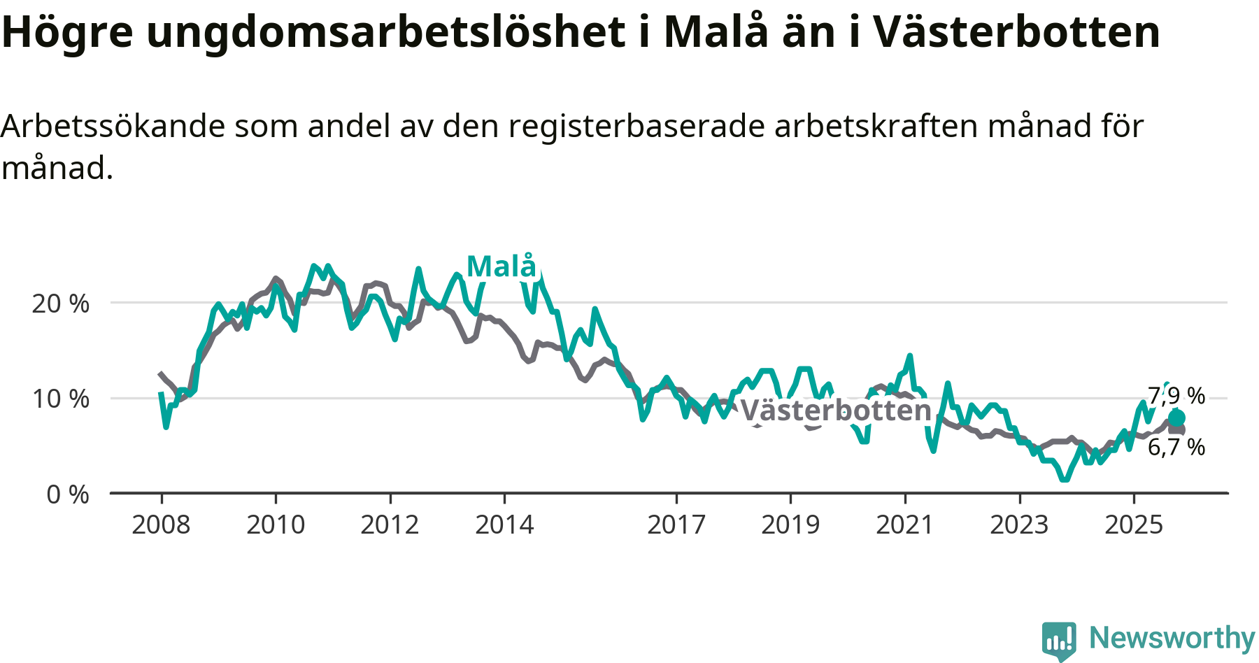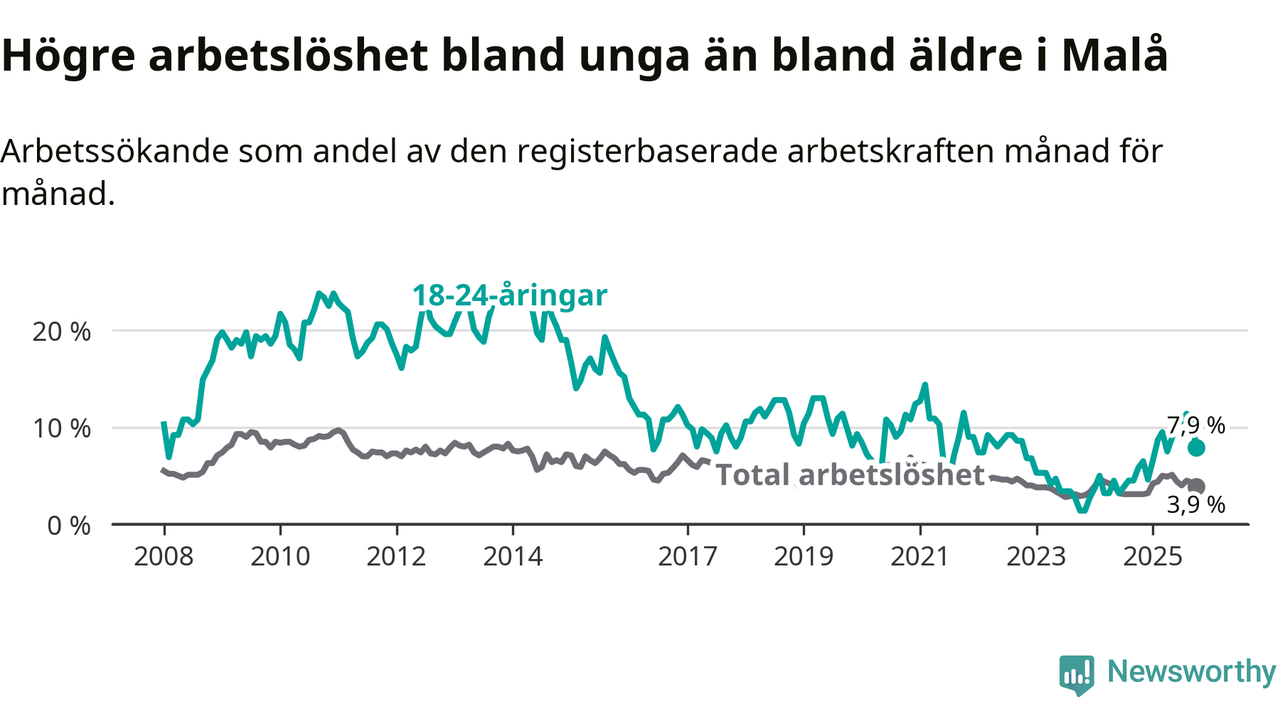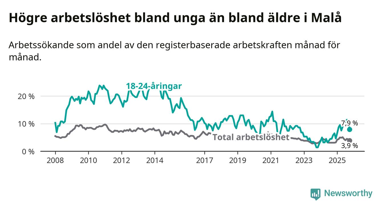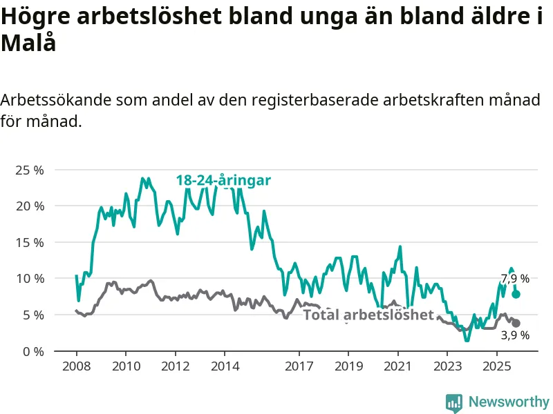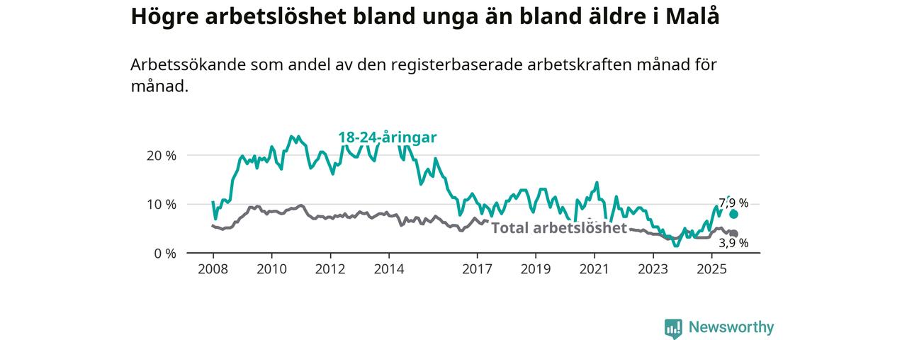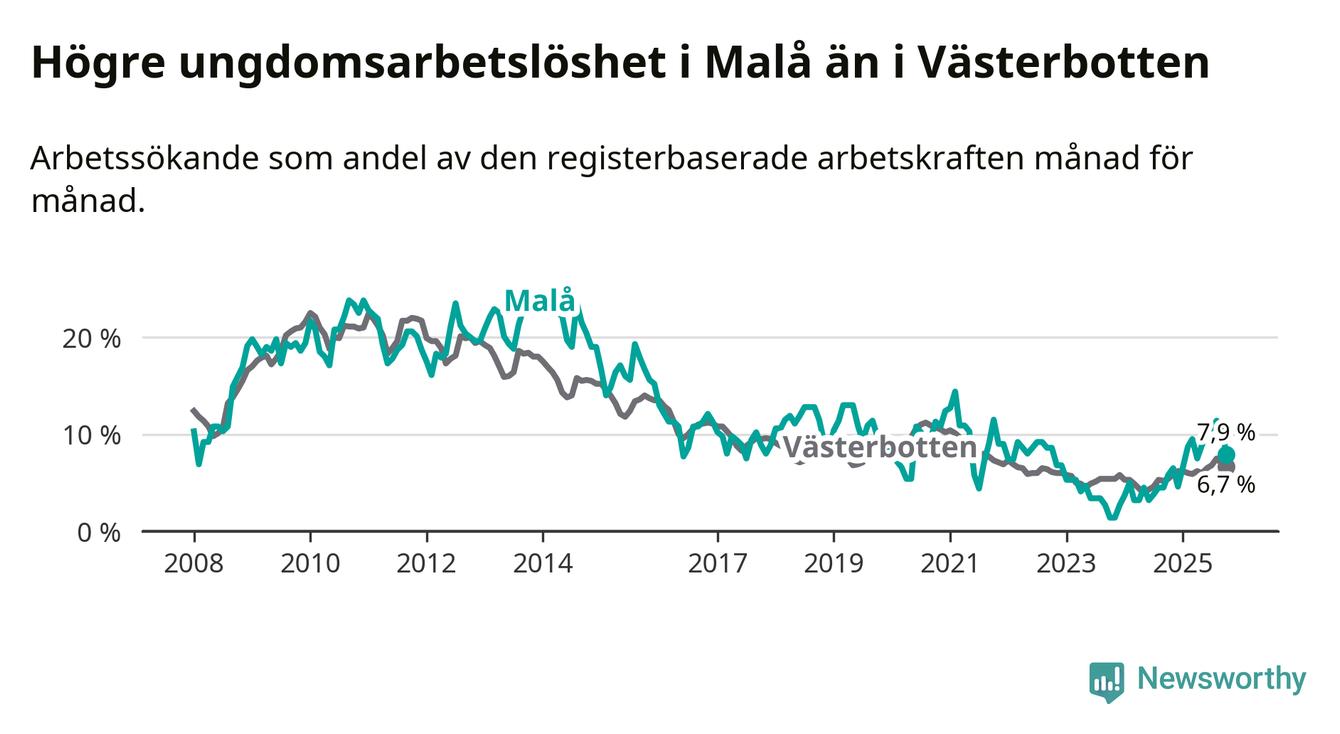 Medan Malå har lägre total arbetslöshet än Västerbotten, ligger ungdomsarbetslösheten 1,2 procentenheter högre i Malå.