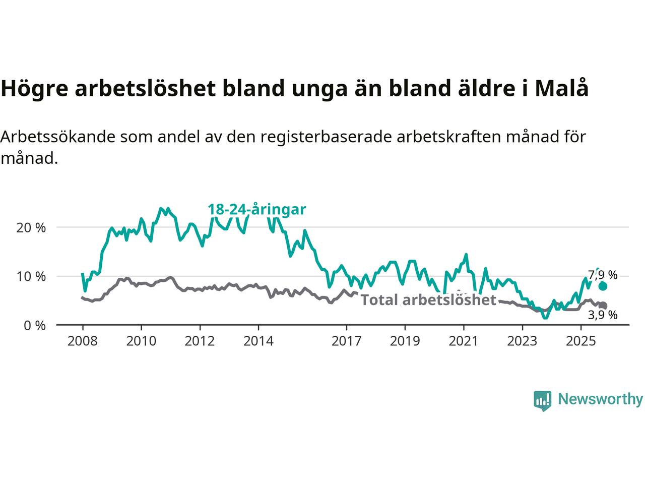 I och med den senaste månadens uppgång har de ungas arbetslöshet i Malå stigit 16 månader i följd (upp från 3,2 procent i juni 2024 till 7,9 procent nu).