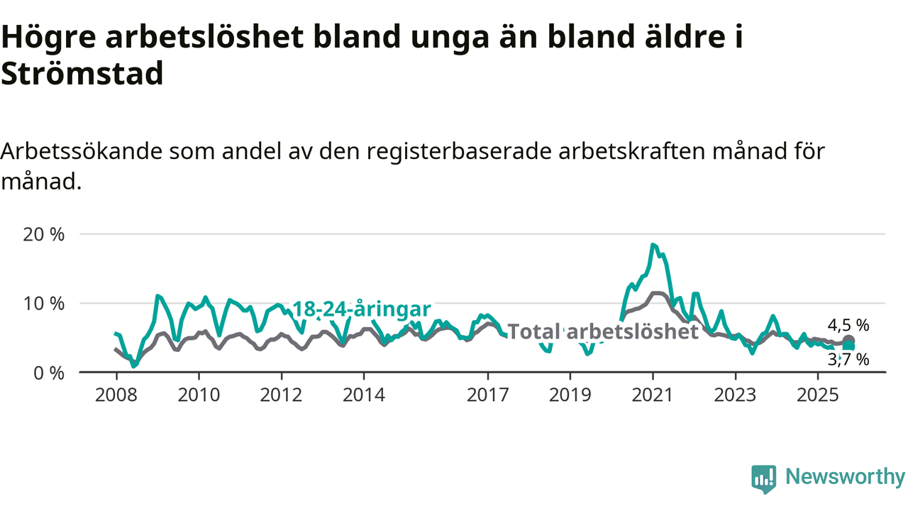 I och med den senaste månadens nedgång har de ungas arbetslöshet i Strömstad sjunkit 13 månader i följd (ner från 5,5 procent i september 2024 till 3,7 procent nu).