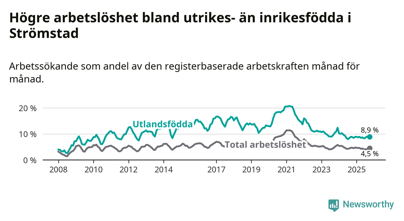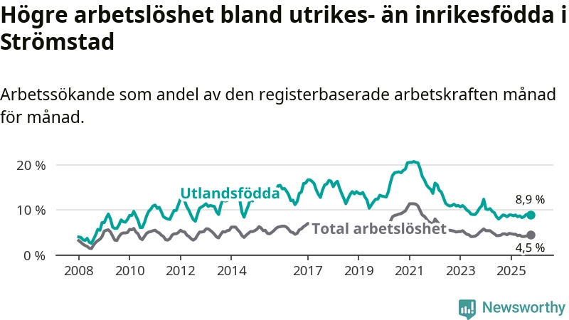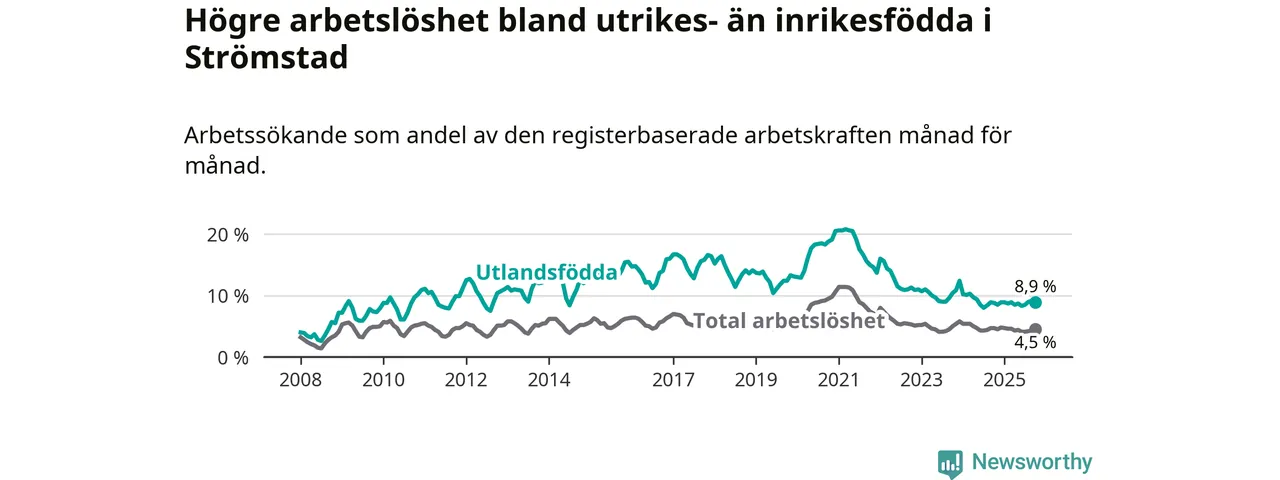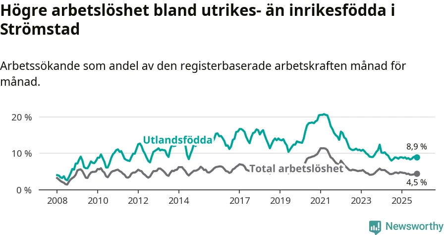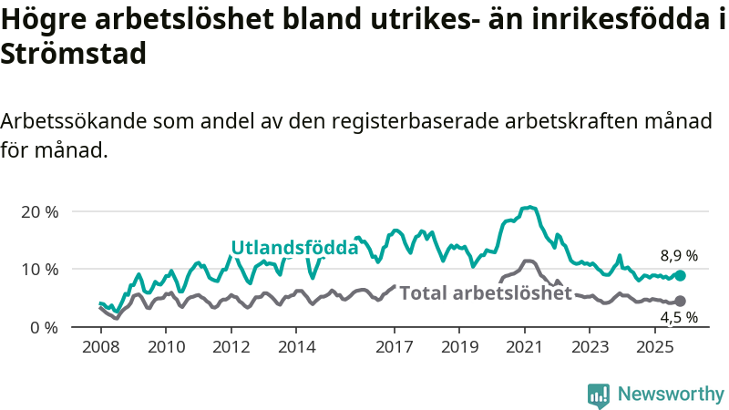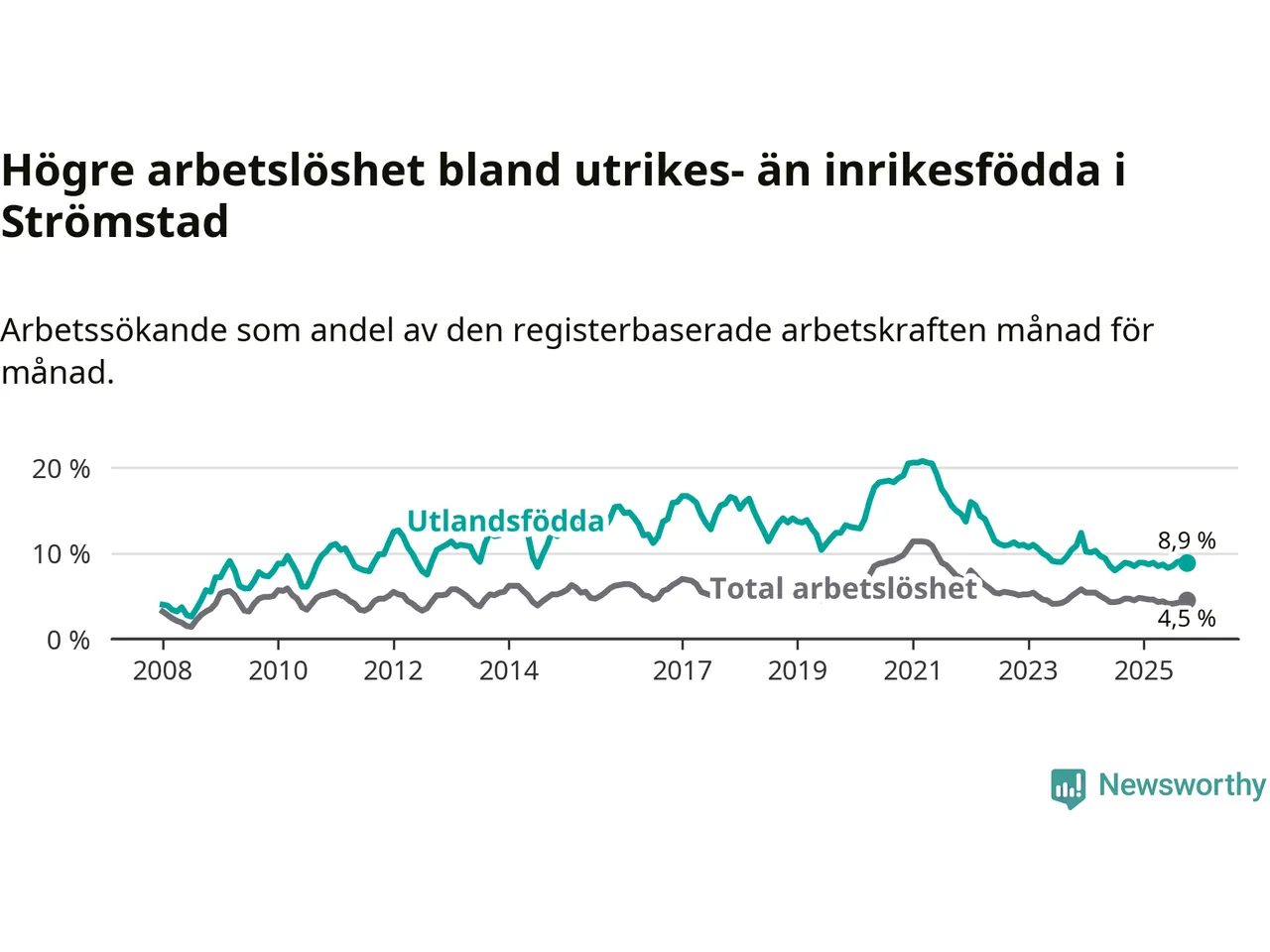 Arbetslösheten bland utlandsfödda var 8,9 procent i Strömstad under oktober månad, motsvarande 194 av 2 180 personer. Det är 0,1 procentenheter fler än vid samma tidpunkt i fjol (+6 om man räknar personer).