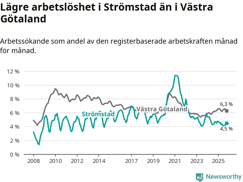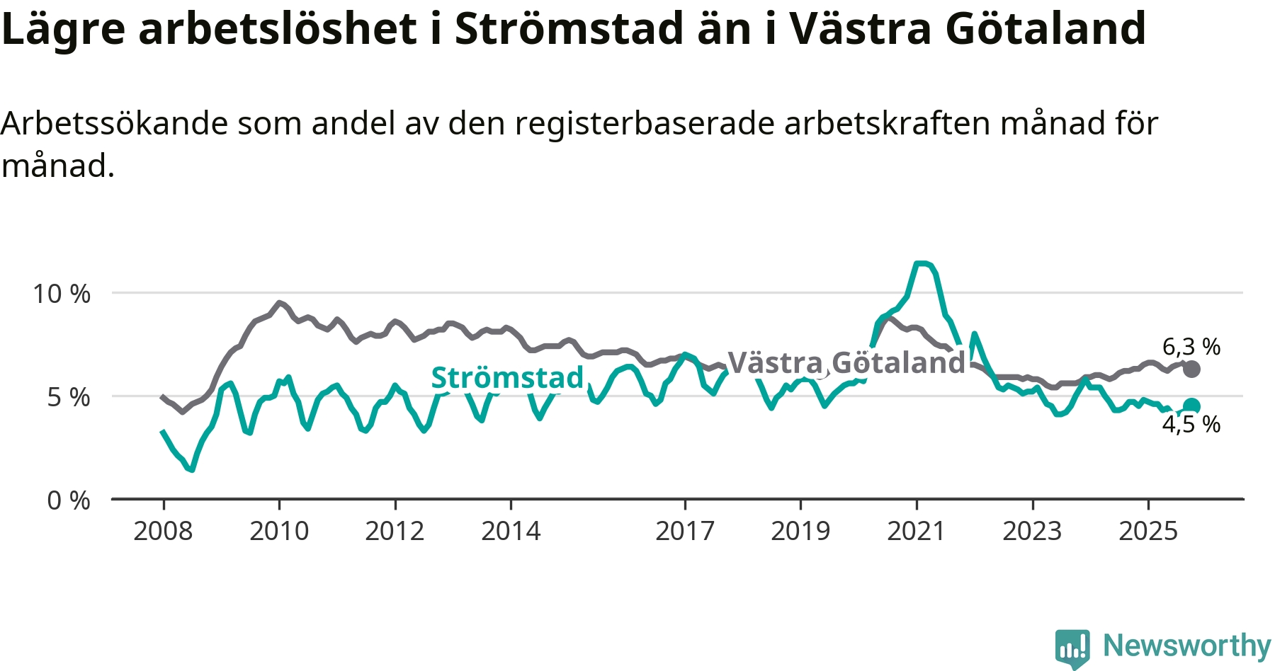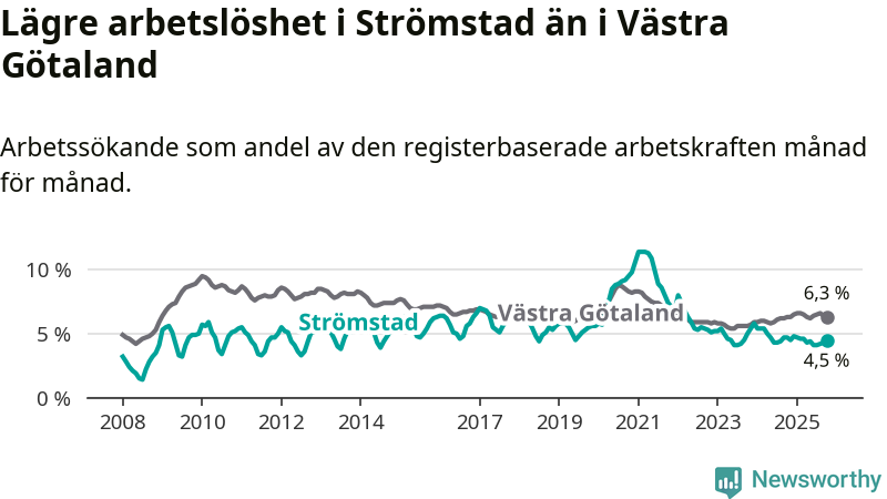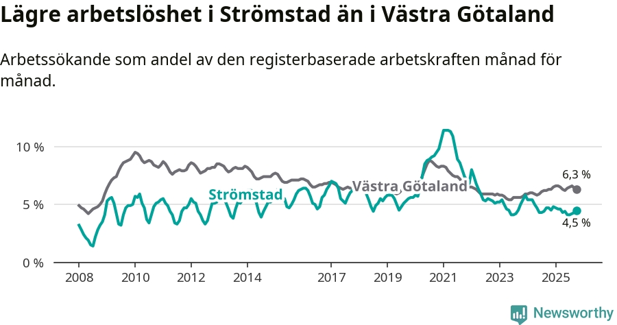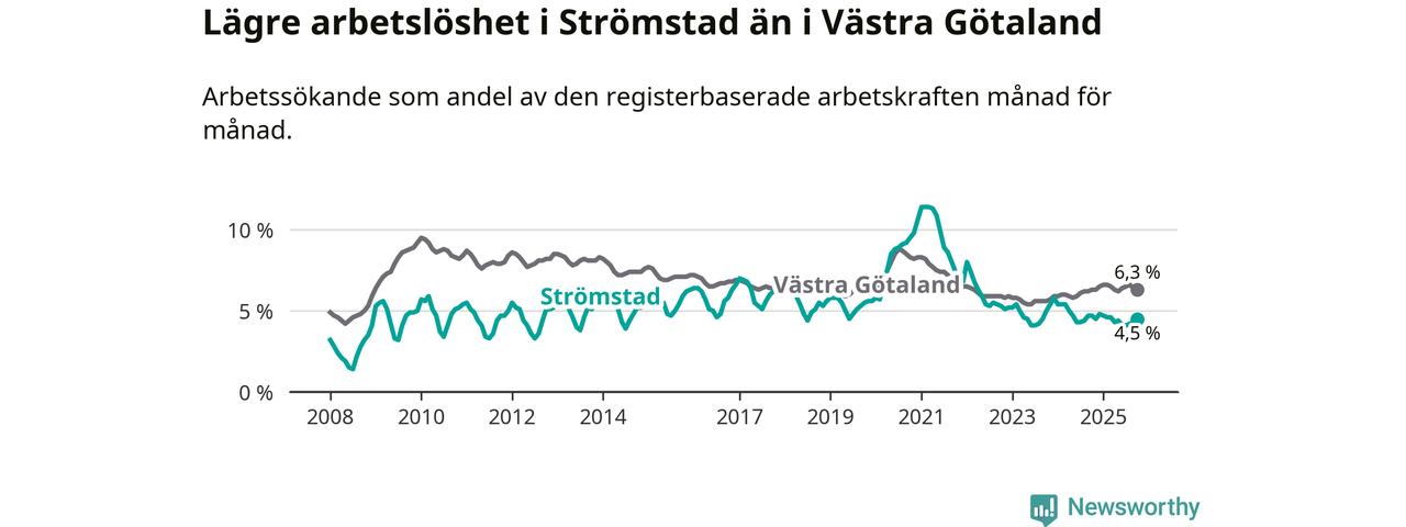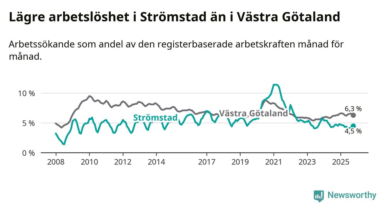Under oktober månad rapporterade Strömstads kommun en total arbetslöshet på 4,5 procent. Det är en minskning jämfört med samma tidpunkt i fjol (−0,2 procentenheter). I Västra Götalands län däremot står arbetslösheten stilla.