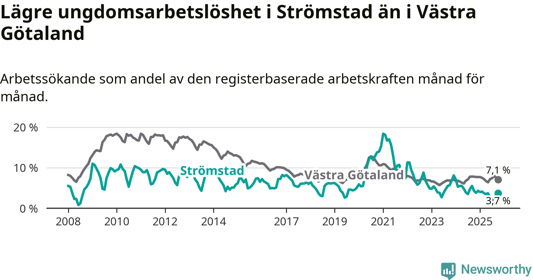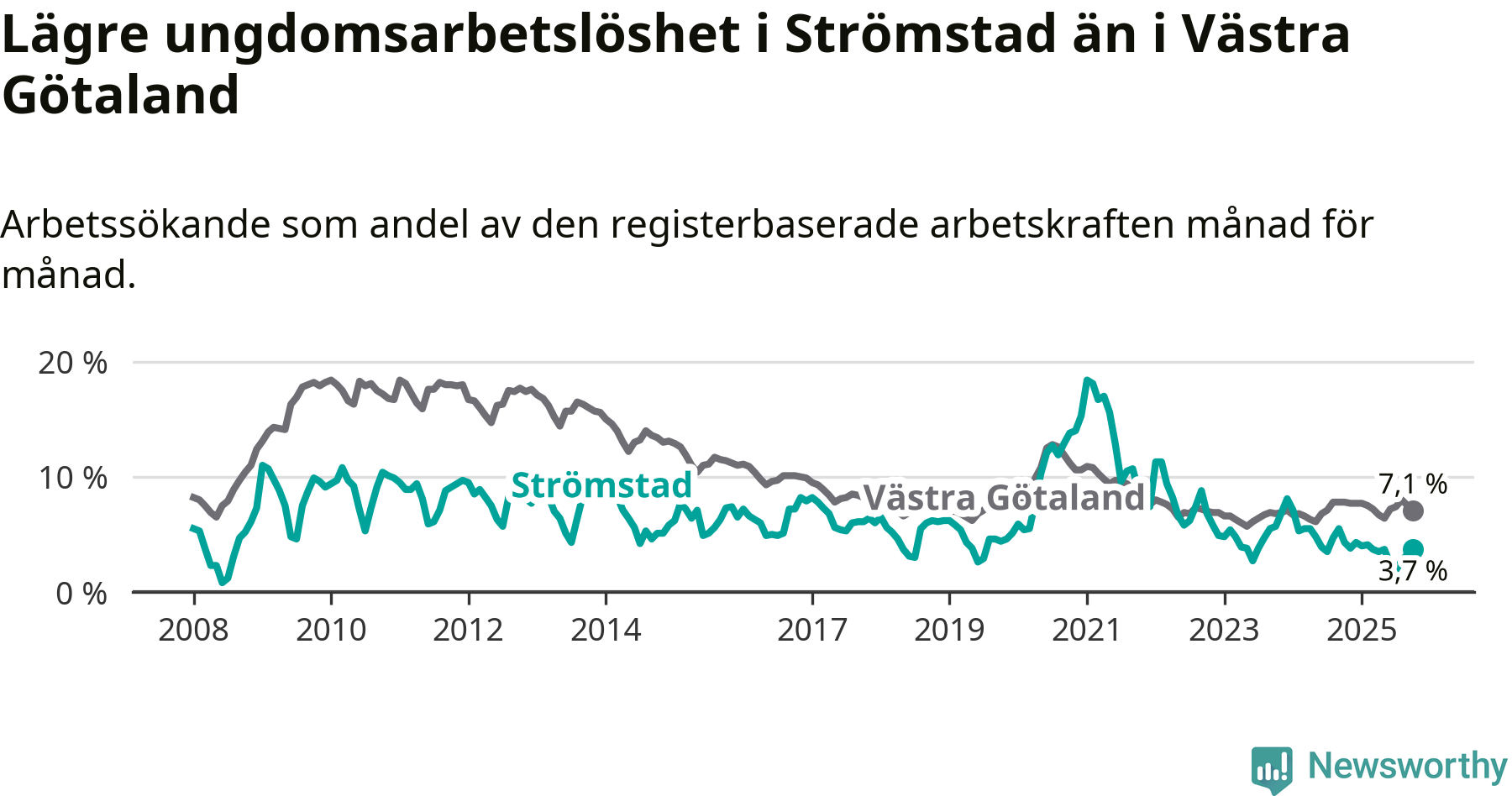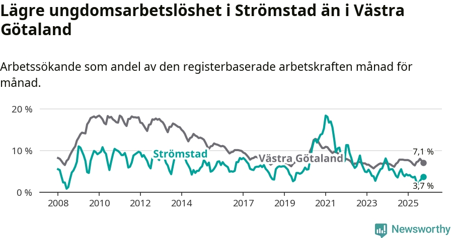 Precis som den totala arbetslösheten ligger ungdomsarbetslösheten i Strömstad lägre än i Västra Götaland som helhet. Skillnaden mellan kommunen och länet är 3,4 procentenheter.