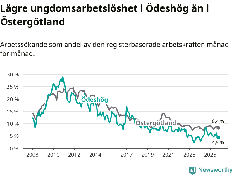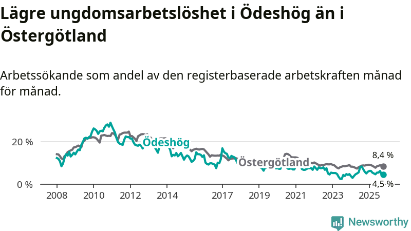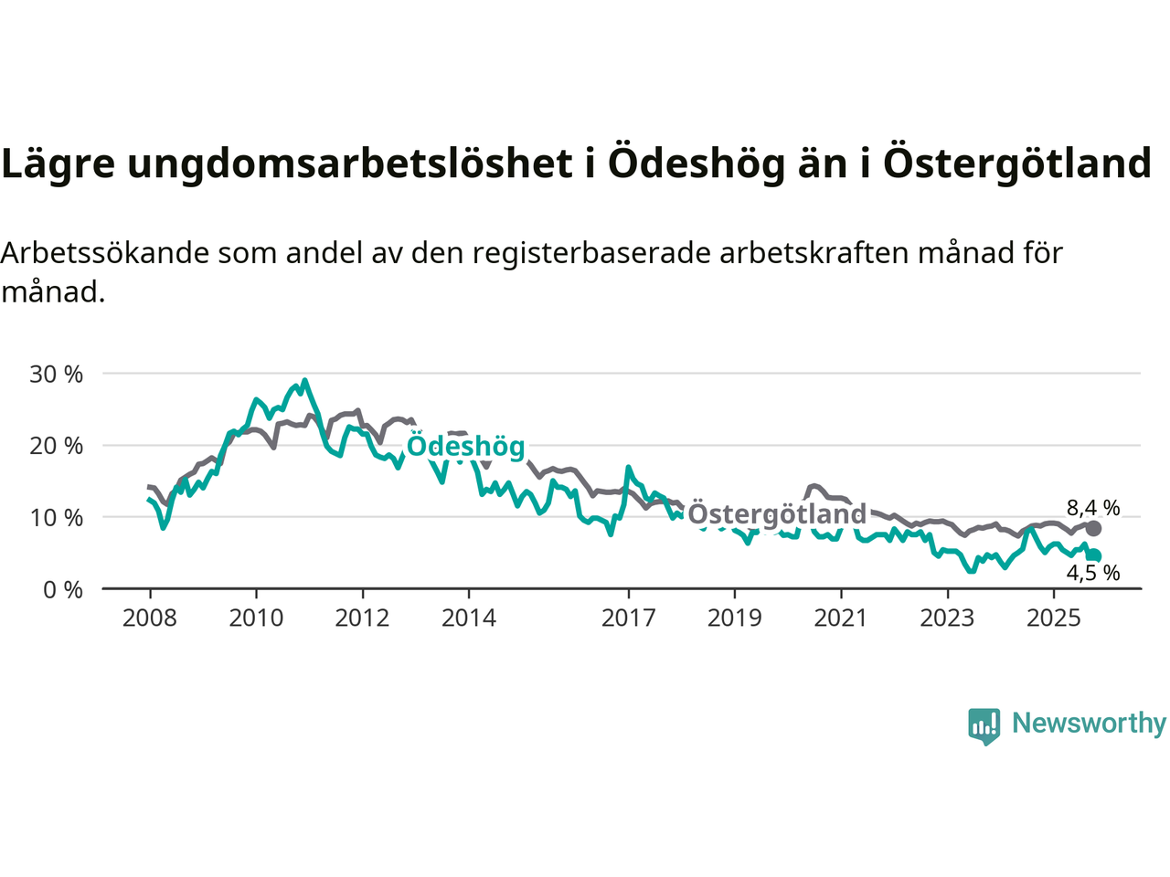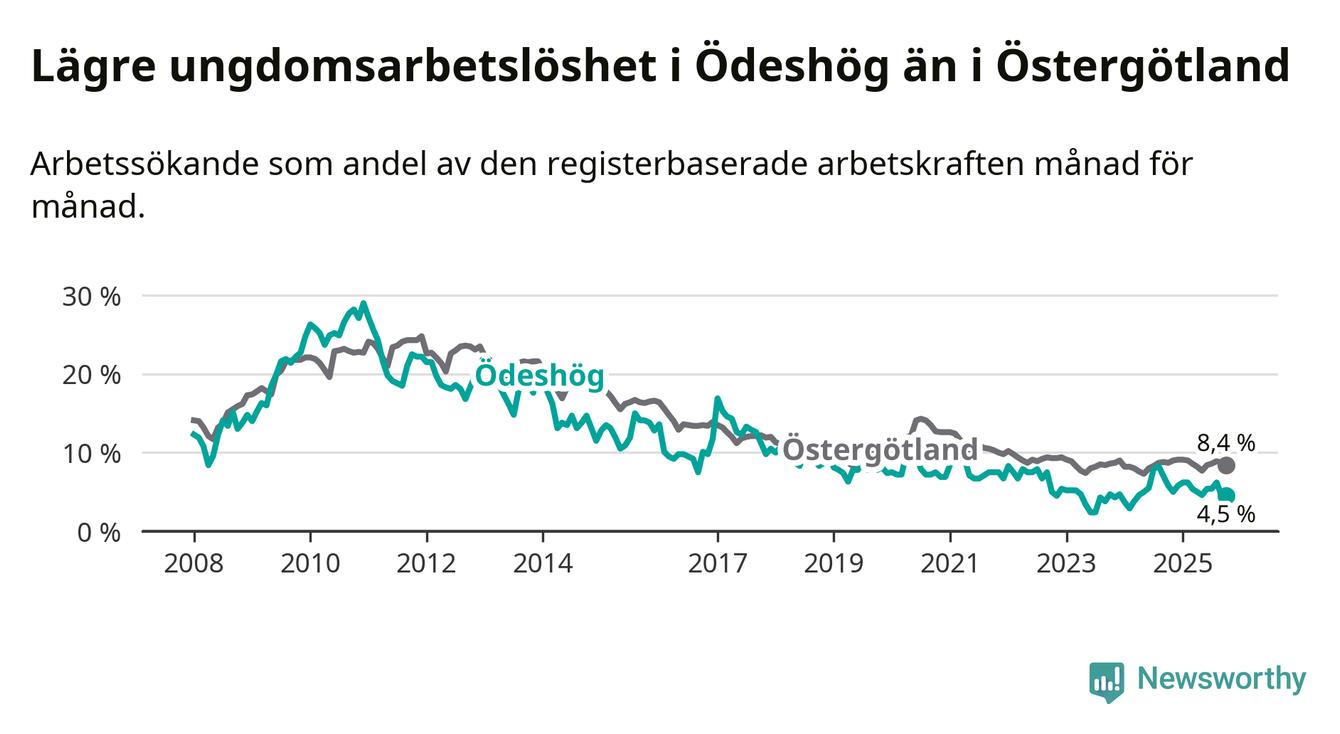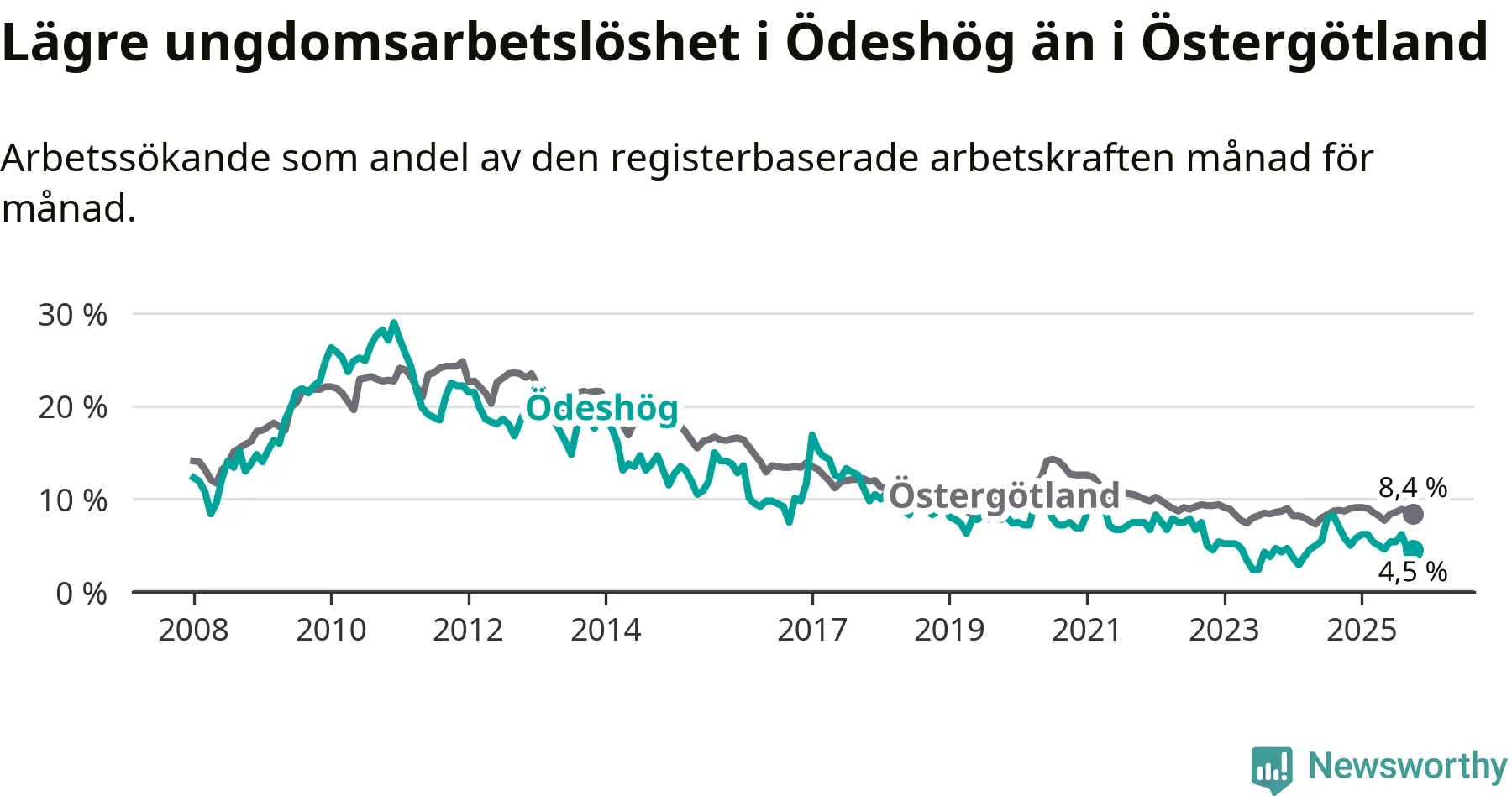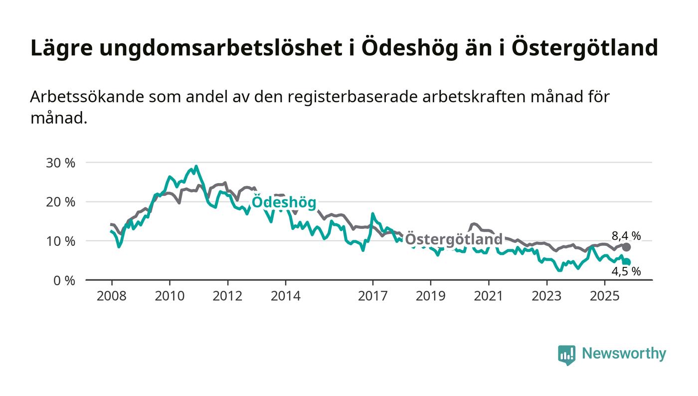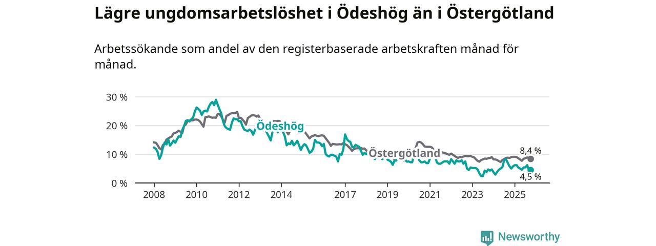 Precis som den totala arbetslösheten ligger ungdomsarbetslösheten i Ödeshög lägre än i Östergötland som helhet. Skillnaden mellan kommunen och länet är 3,9 procentenheter.