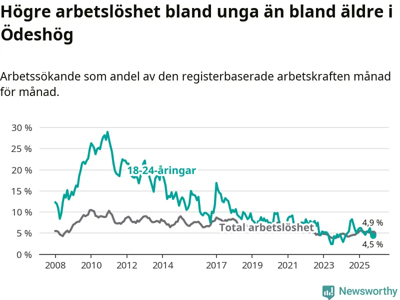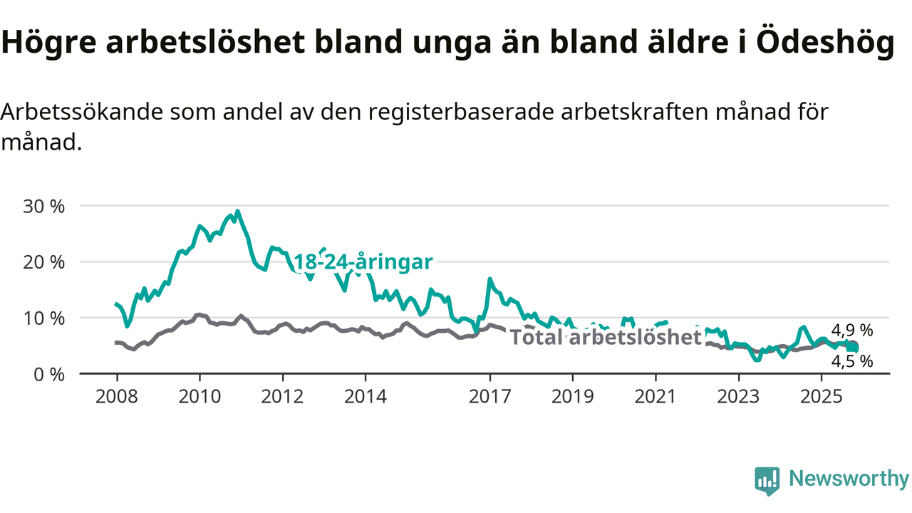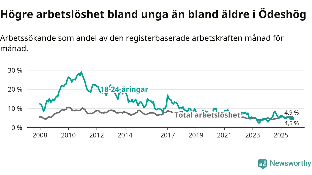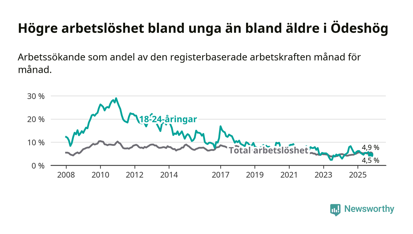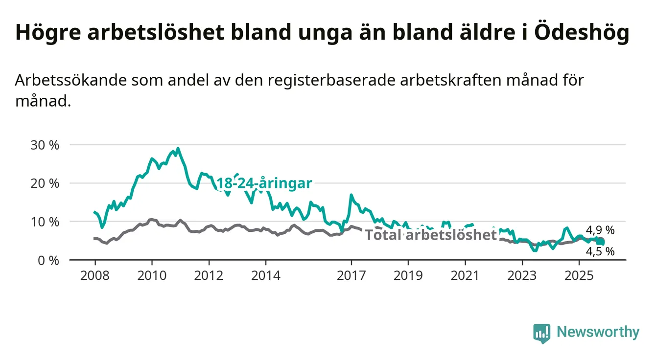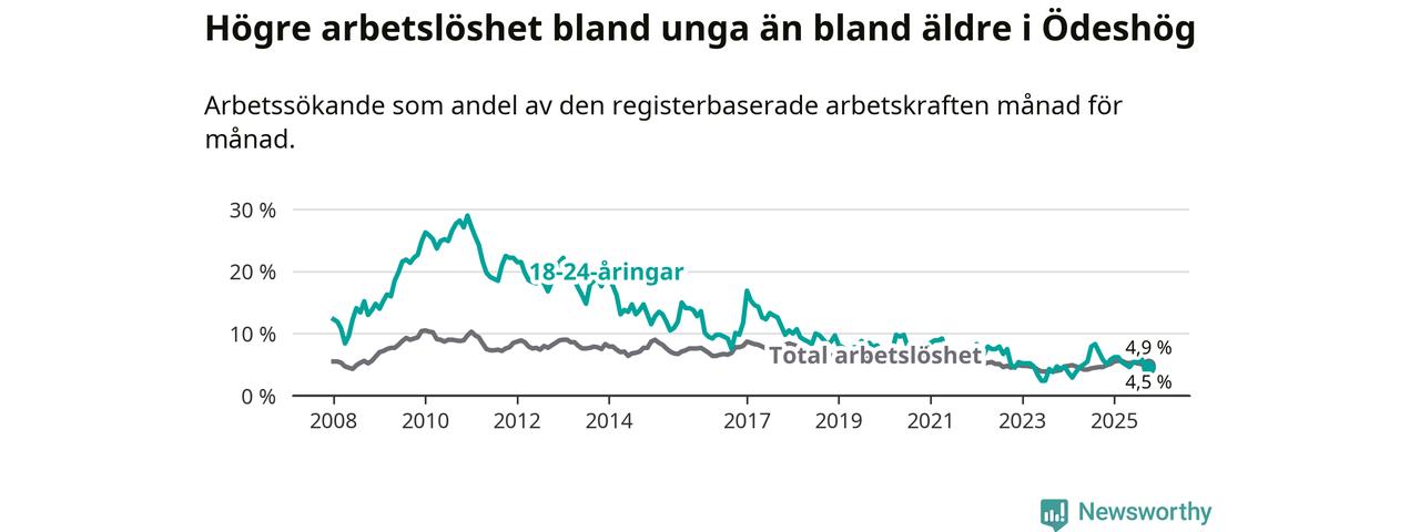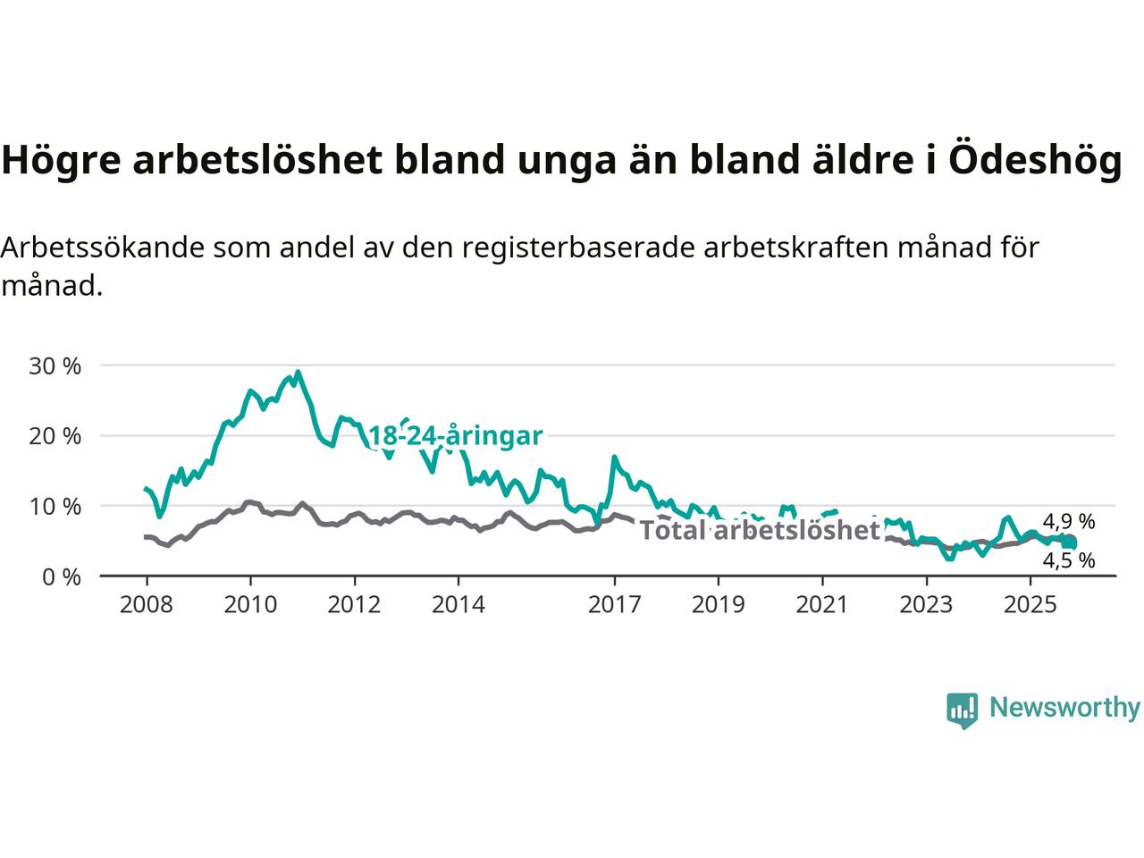 Precis som den totala arbetslösheten ligger ungdomsarbetslösheten i Ödeshög lägre än i Östergötland som helhet. Skillnaden mellan kommunen och länet är 3,9 procentenheter.