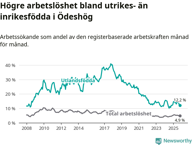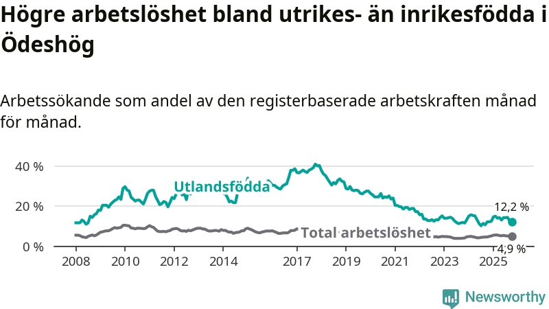 Arbetslösheten bland utlandsfödda var 12,2 procent i Ödeshög under oktober månad, motsvarande 40 av 328 personer. Det är i stort sett lika stor andel som i fjol.