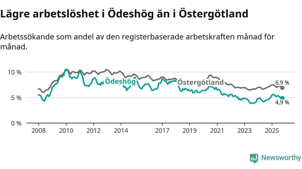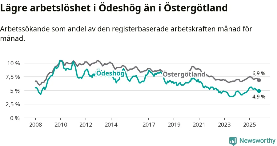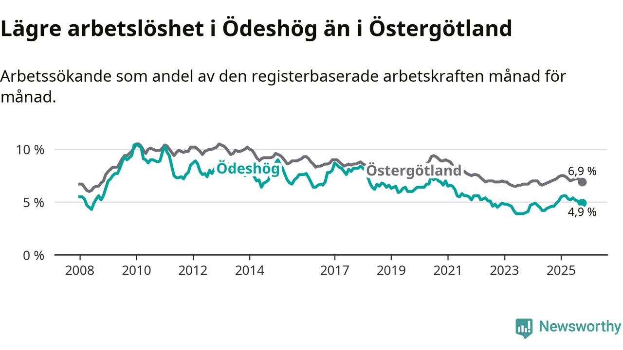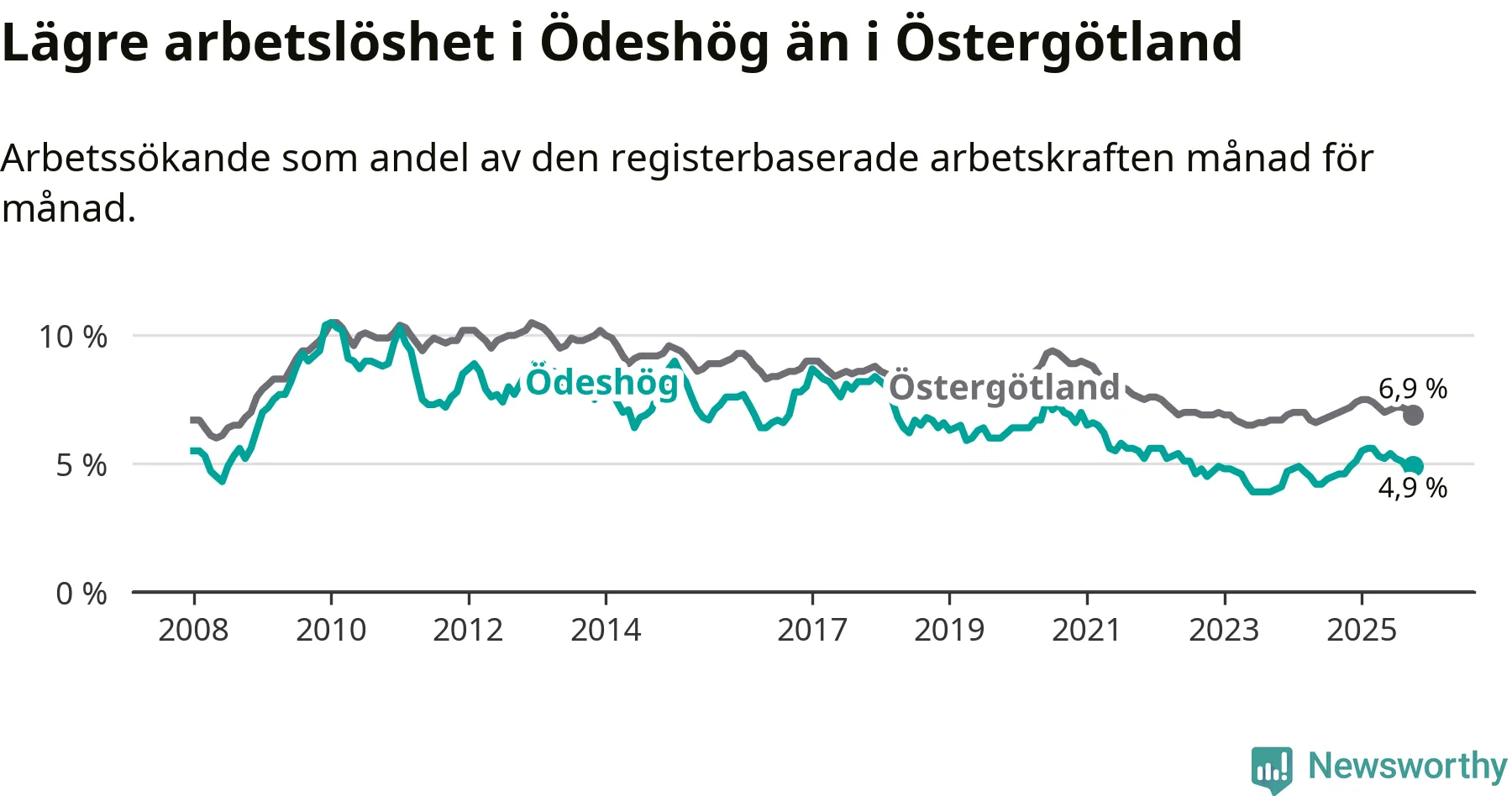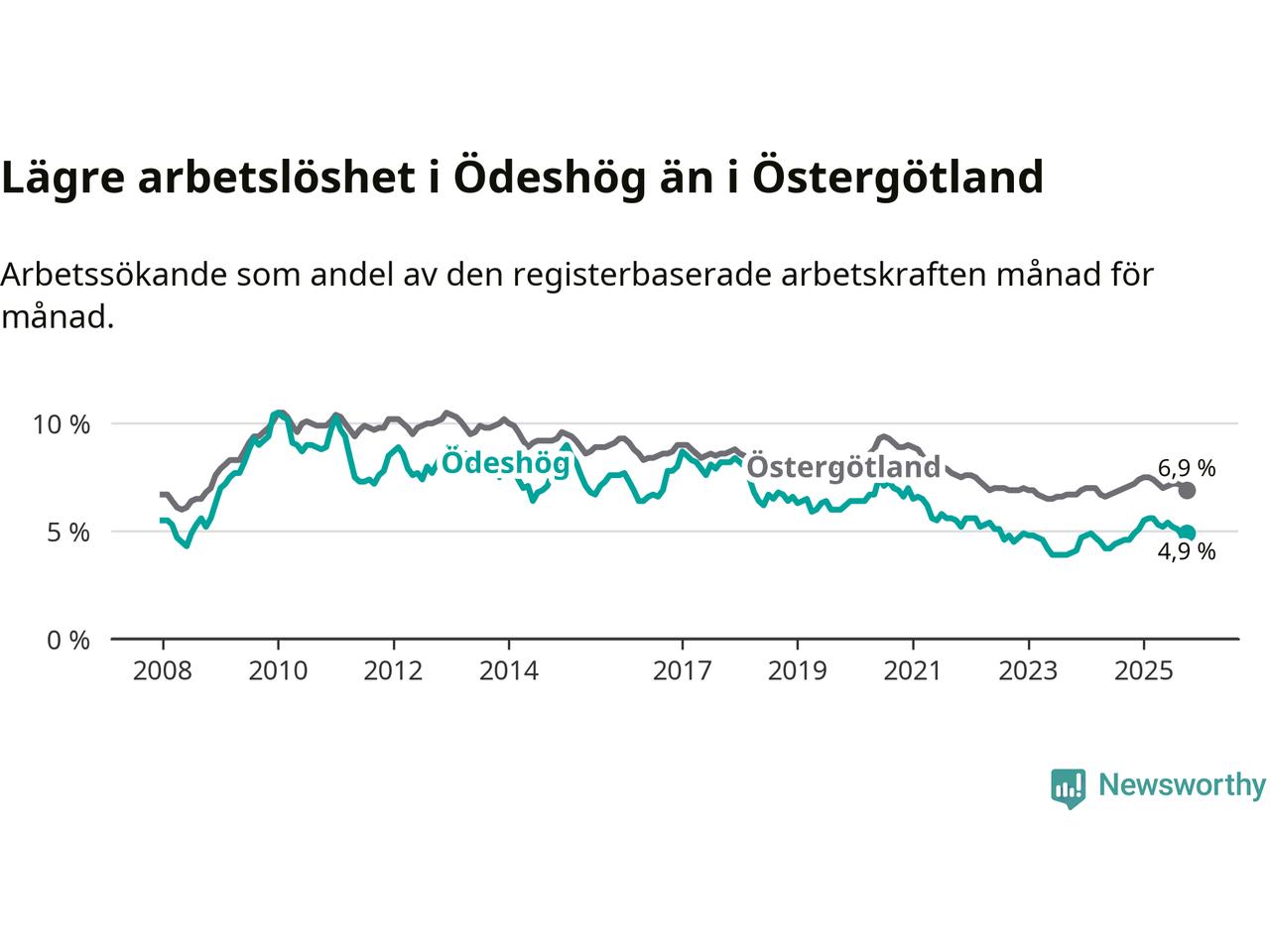 Även om arbetslösheten i Ödeshög alltså ökar, så ligger den fortfarande under snittet i hela Östergötlands län (4,9 procent i kommunen, jämfört med 6,9 procent i hela länet). Ydre har den lägsta arbetslösheten i länet (3,0 procent), medan Norrköping har den högsta (9,1 procent). För att Ödeshög skulle komma ner i samma arbetslöshetsnivå som Ydre skulle 46 personer behöva sysselsättas.