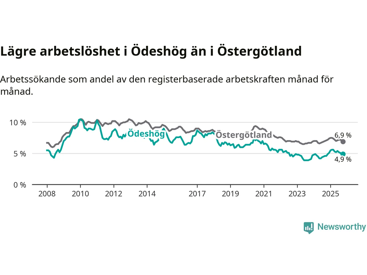 Under oktober månad rapporterade Ödeshögs kommun en total arbetslöshet på 4,9 procent. Det är en ökning jämfört med samma tidpunkt i fjol (+0,3 procentenheter). I Östergötlands län däremot sjunker arbetslösheten något.