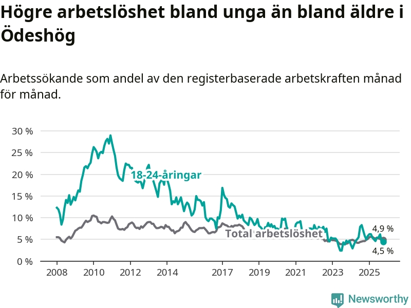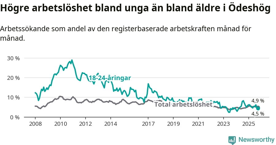 Till skillnad från den totala arbetslösheten sjunker arbetslösheten bland unga (−1,3 procentenheter). I oktober var 4,5 procent av 18–24-åringarna inskrivna som arbetssökande (motsvarande elva personer). Mäter vi antalet inskrivna ser vi en minskning med tre personer på ett års sikt.