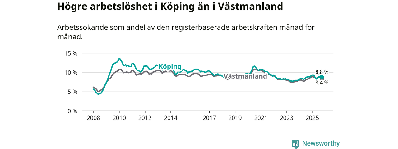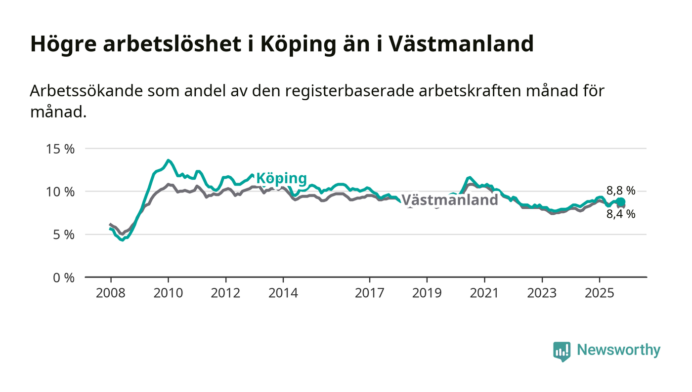 Under oktober månad rapporterade Köpings kommun en total arbetslöshet på 8,8 procent. Det är en minskning jämfört med samma tidpunkt i fjol (−0,1 procentenheter). Även i Västmanlands län sjunker arbetslösheten något.