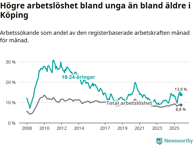 Till skillnad från den totala arbetslösheten stiger arbetslösheten bland unga (+0,4 procentenheter). I oktober var 13,9 procent av 18–24-åringarna inskrivna som arbetssökande (motsvarande 176 personer). Mäter vi antalet inskrivna ser vi en minskning med fem personer på ett års sikt.