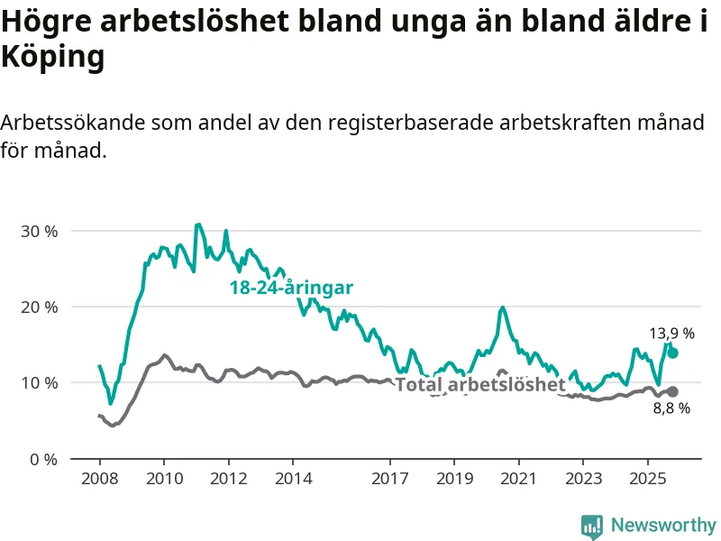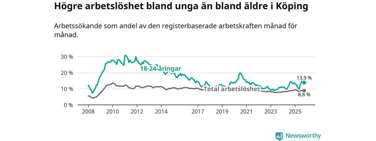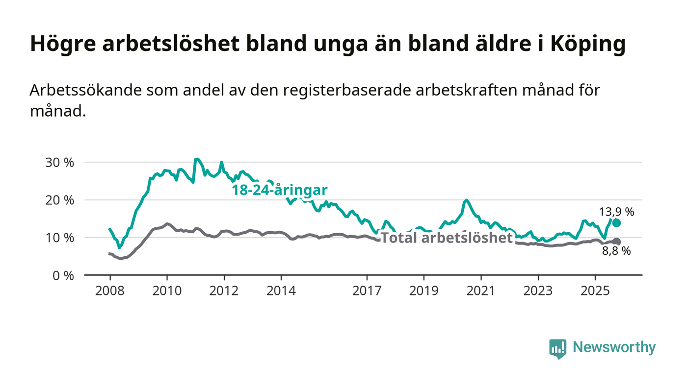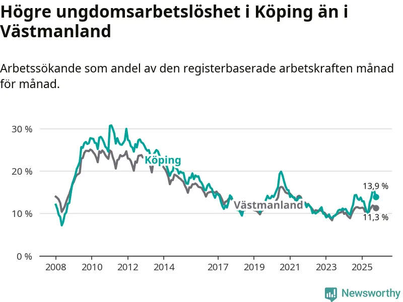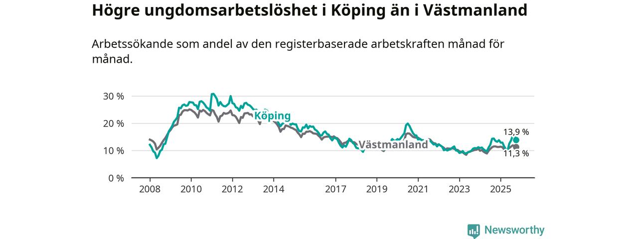 Precis som den totala arbetslösheten ligger ungdomsarbetslösheten i Köping högre än i Västmanland som helhet. Skillnaden mellan kommunen och länet är 2,6 procentenheter.