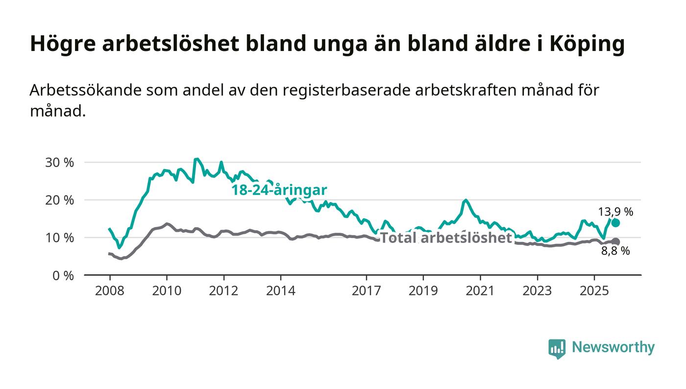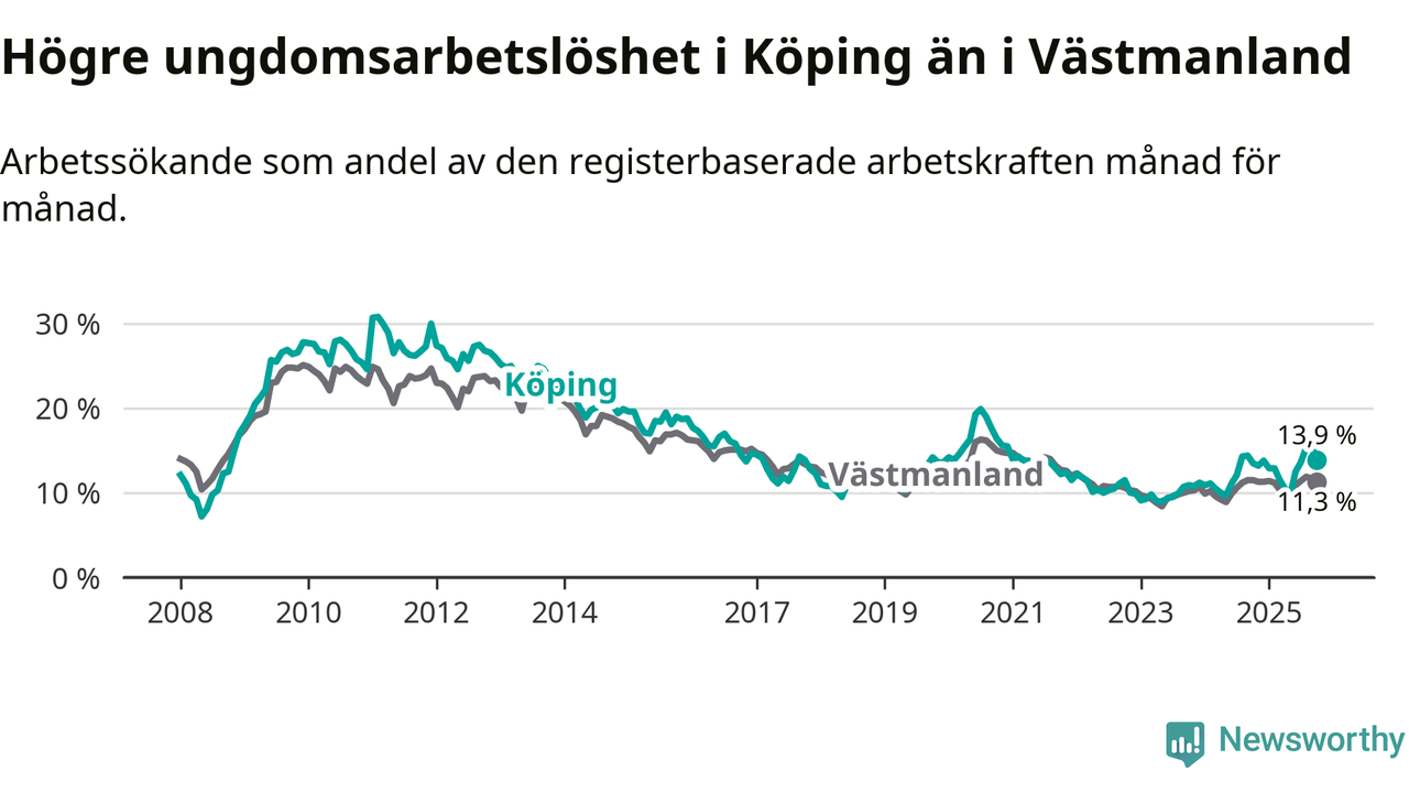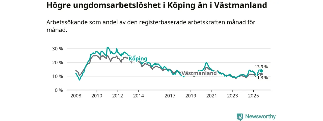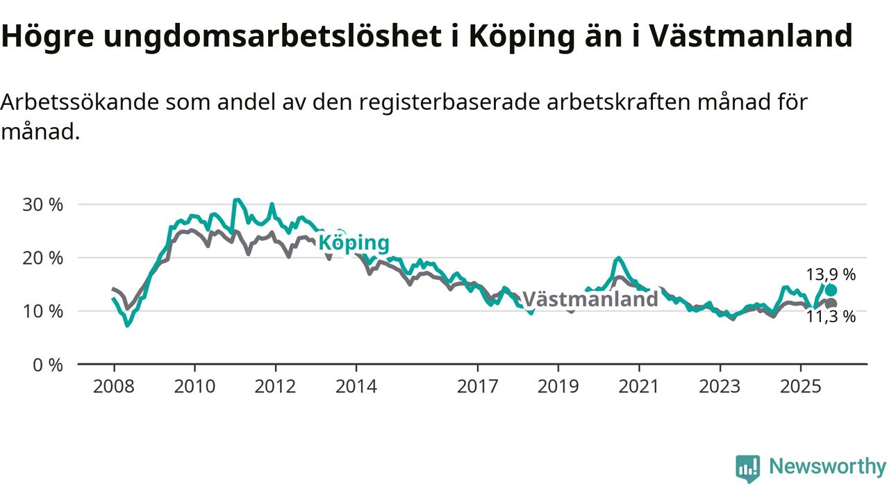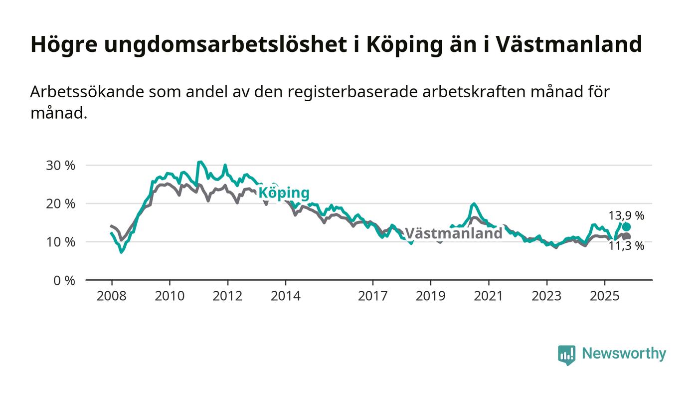 Graf: Arbetslöshet bland unga i Köpings kommun och Västmanlands län