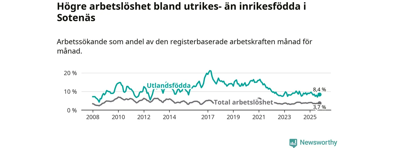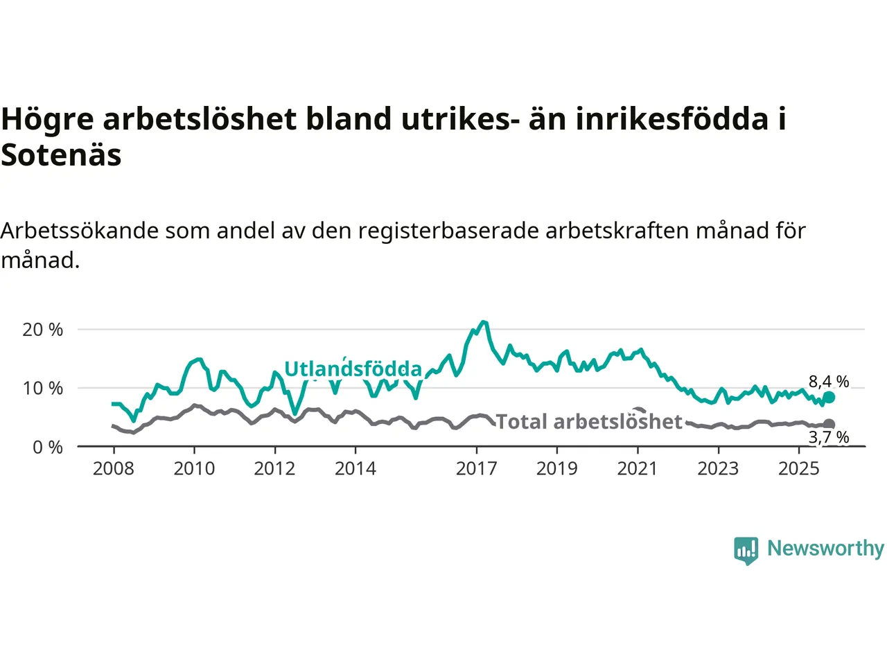 Arbetslösheten bland utlandsfödda var 8,4 procent i Sotenäs under oktober månad, motsvarande 45 av 536 personer. Det är 0,1 procentenheter fler än vid samma tidpunkt i fjol (±0 om man räknar personer). Den senaste månadens uppgång innebär ett trendbrott. Under de fyra föregående månaderna hade arbetslösheten bland utlandsfödda varit lägre än motsvarande tidpunkt året innan.