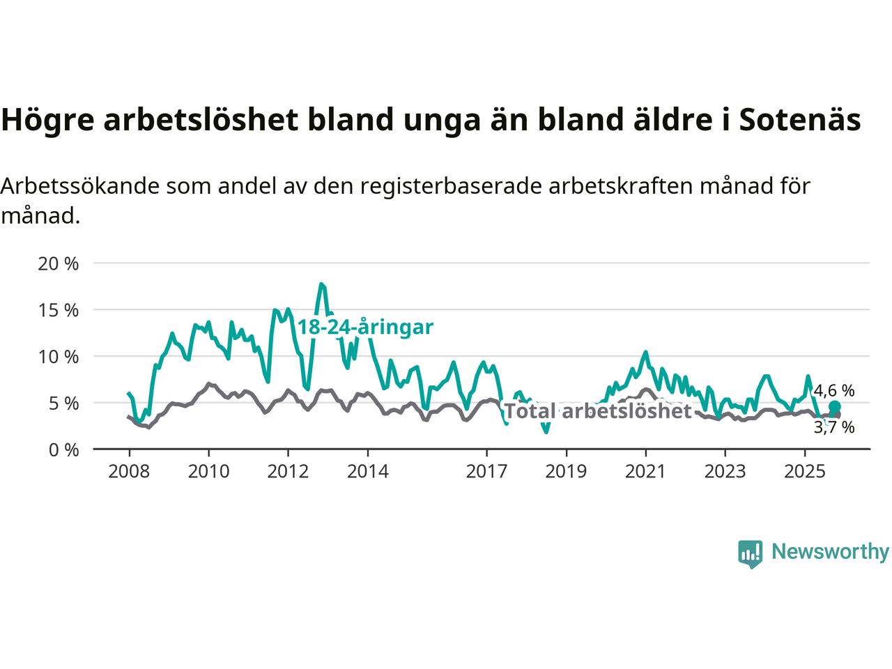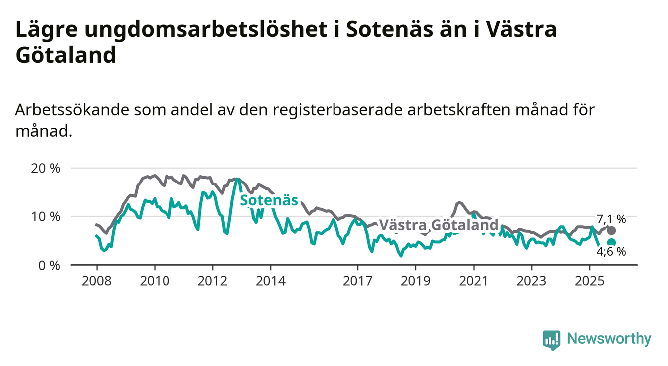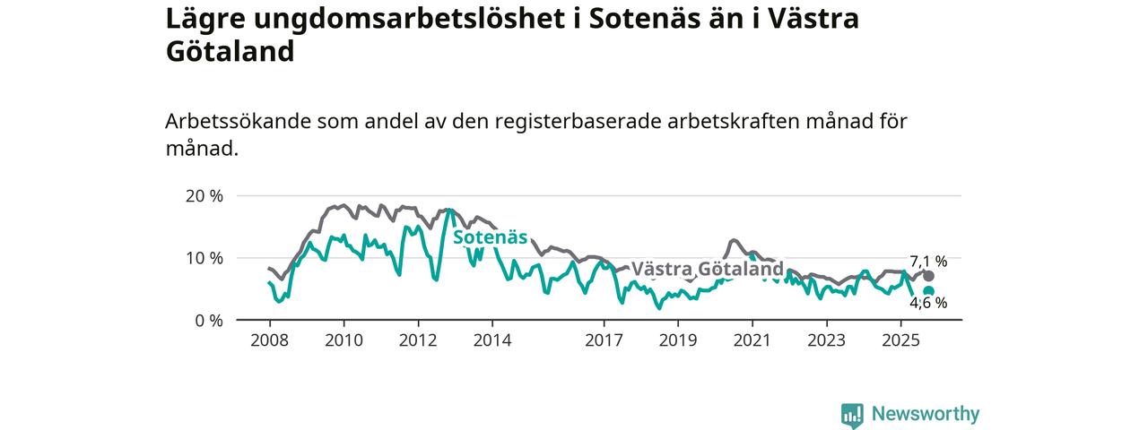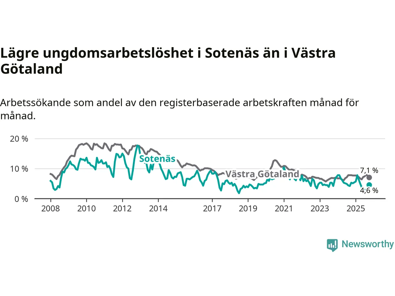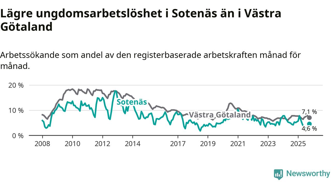 Precis som den totala arbetslösheten ligger ungdomsarbetslösheten i Sotenäs lägre än i Västra Götaland som helhet. Skillnaden mellan kommunen och länet är 2,5 procentenheter.