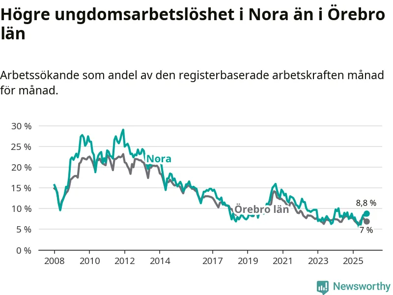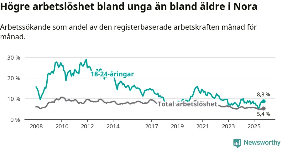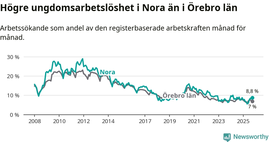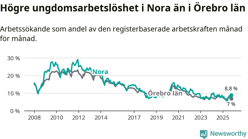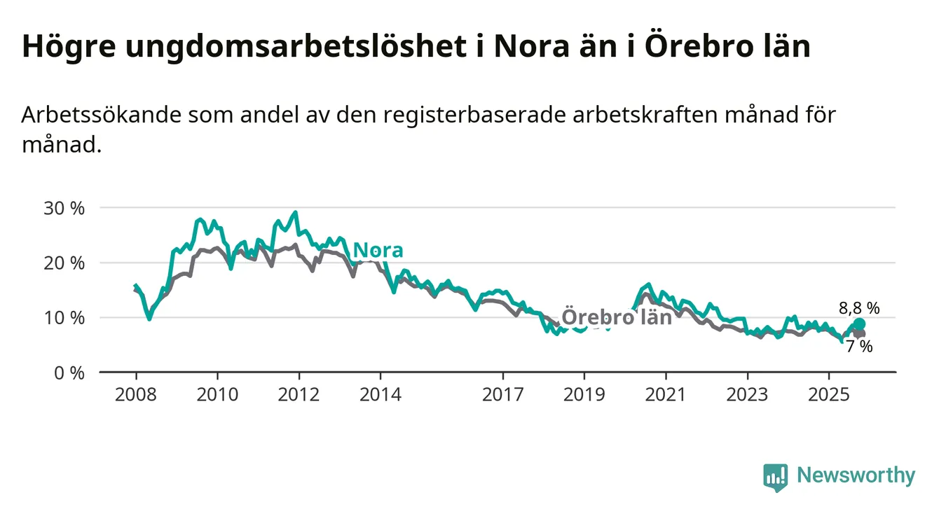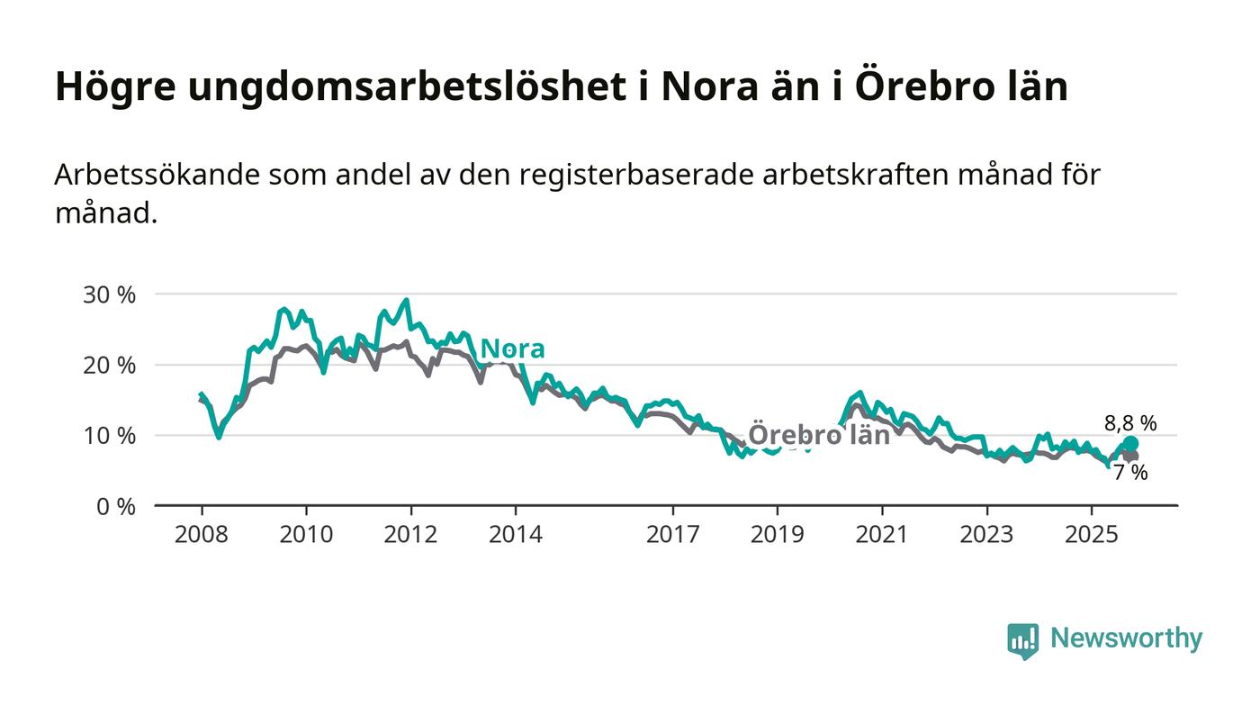 Medan Nora har lägre total arbetslöshet än Örebro, ligger ungdomsarbetslösheten 1,8 procentenheter högre i Nora.