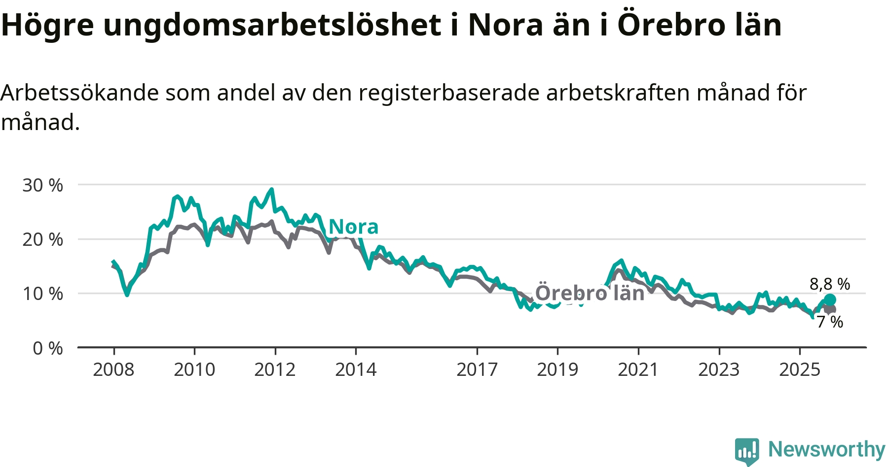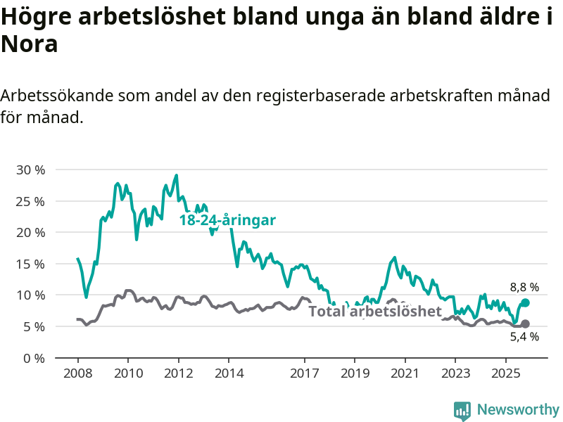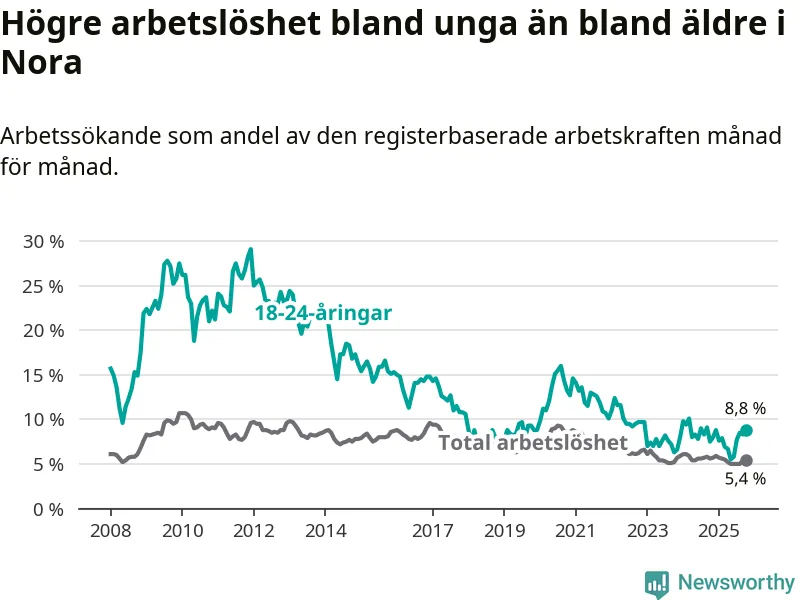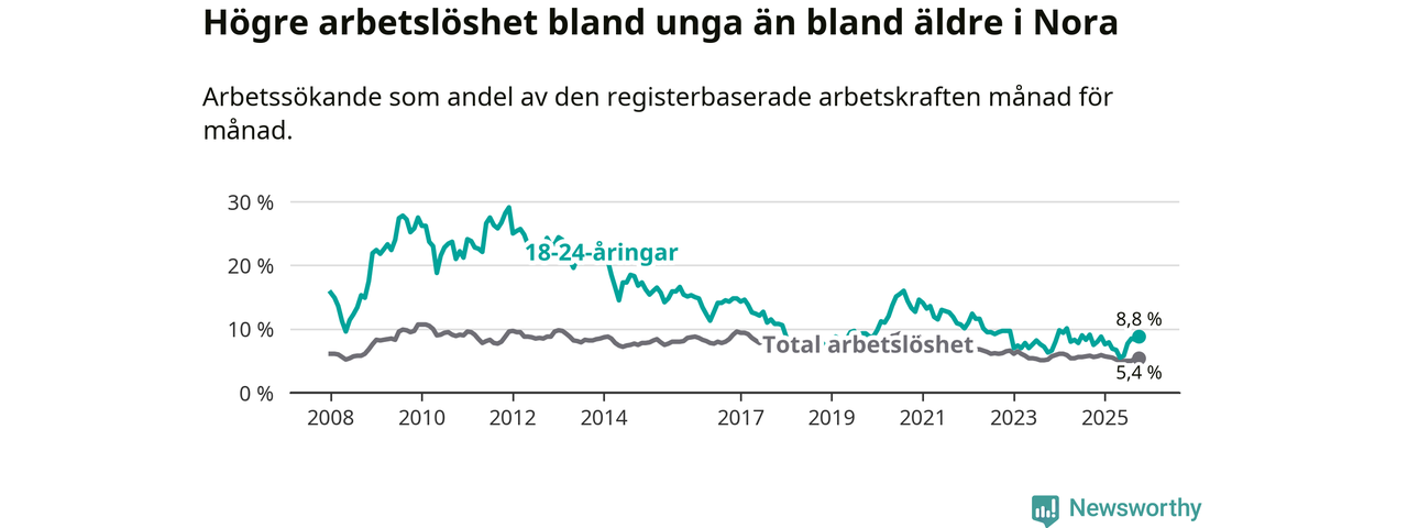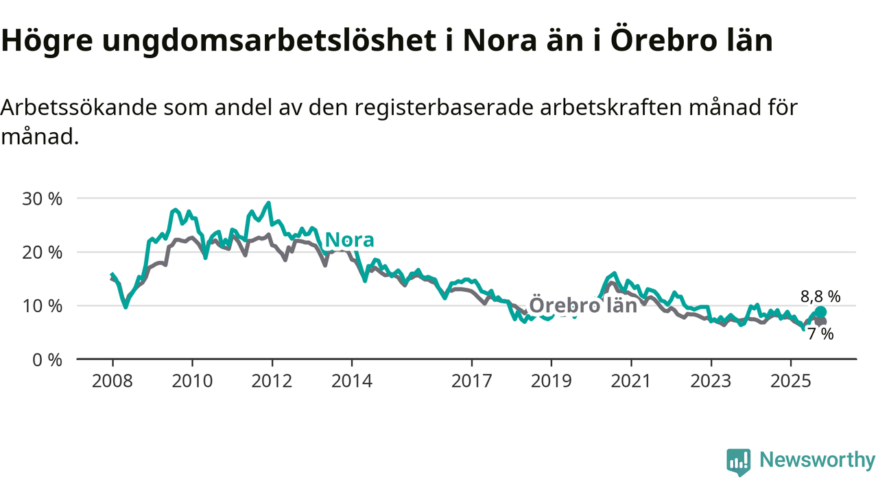 Medan Nora har lägre total arbetslöshet än Örebro, ligger ungdomsarbetslösheten 1,8 procentenheter högre i Nora.