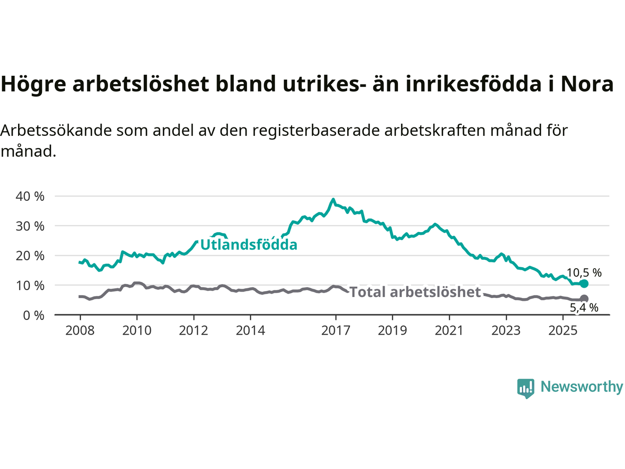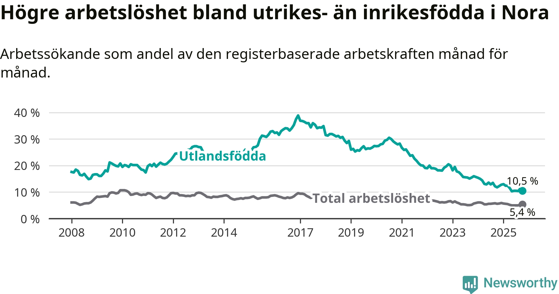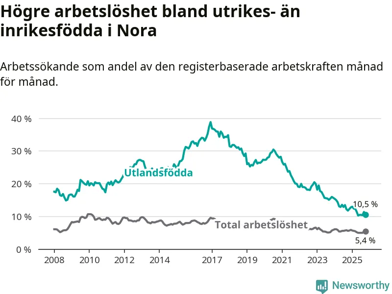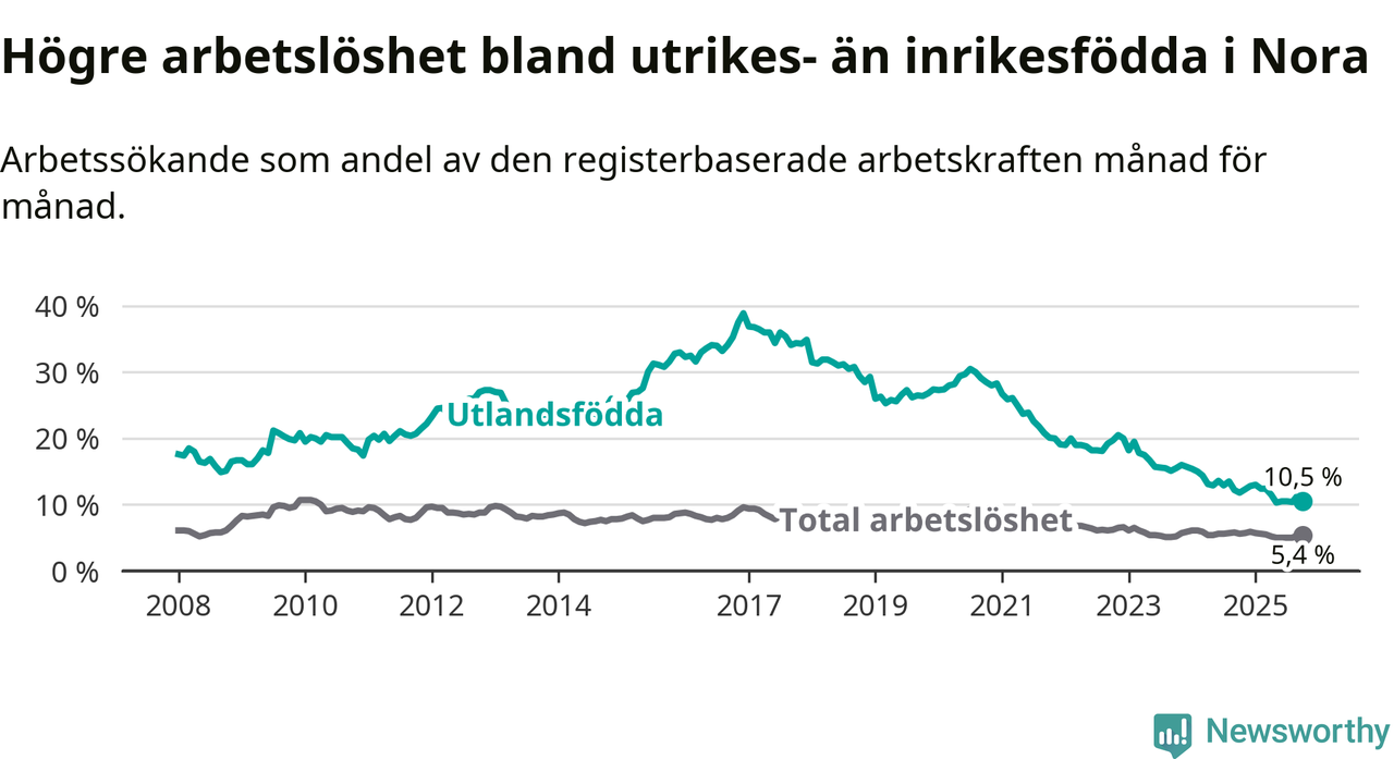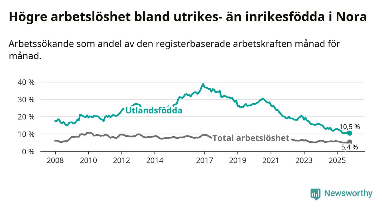Arbetslösheten bland utlandsfödda var 10,5 procent i Nora under oktober månad, motsvarande 75 av 714 personer. Det är 1,3 procentenheter färre än vid samma tidpunkt i fjol (−13 om man räknar personer). Därmed har de utlandsföddas arbetslöshet varit lägre än vid samma tidpunkt i fjol i över två år i sträck. Sedan december 2022 har arbetslösheten bland utlandsfödda minskat från 20,0 till 10,5 procent.