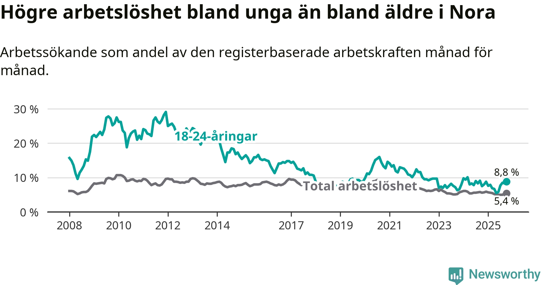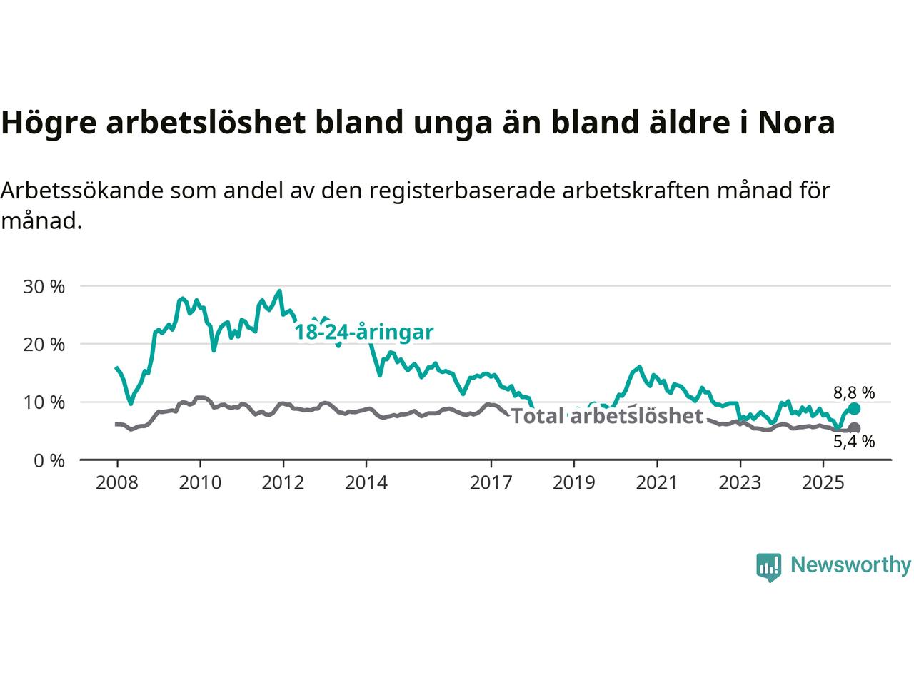 Graf: Arbetslöshet bland unga i Nora kommun och Örebro län