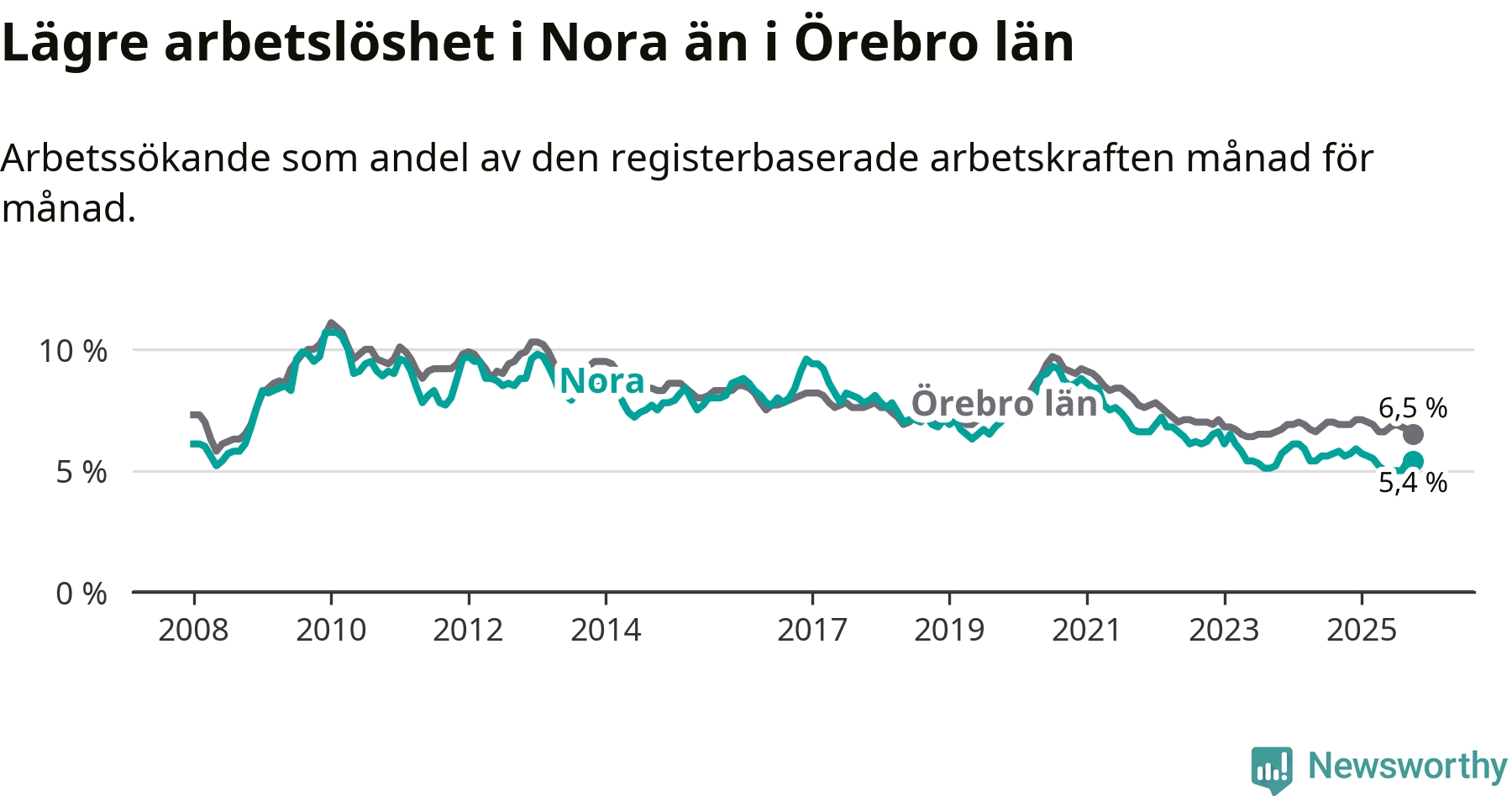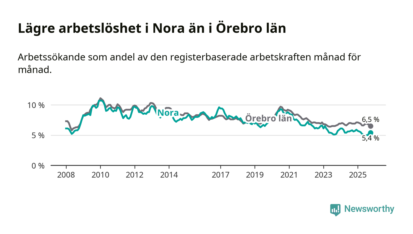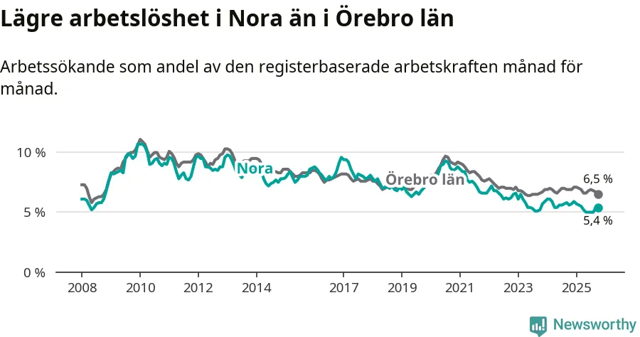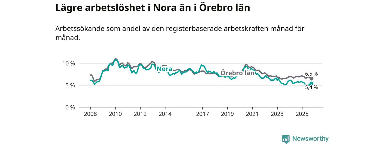 Under oktober månad rapporterade Nora kommun en total arbetslöshet på 5,4 procent. Det är en minskning jämfört med samma tidpunkt i fjol (−0,2 procentenheter). Även i Örebro län sjunker arbetslösheten .