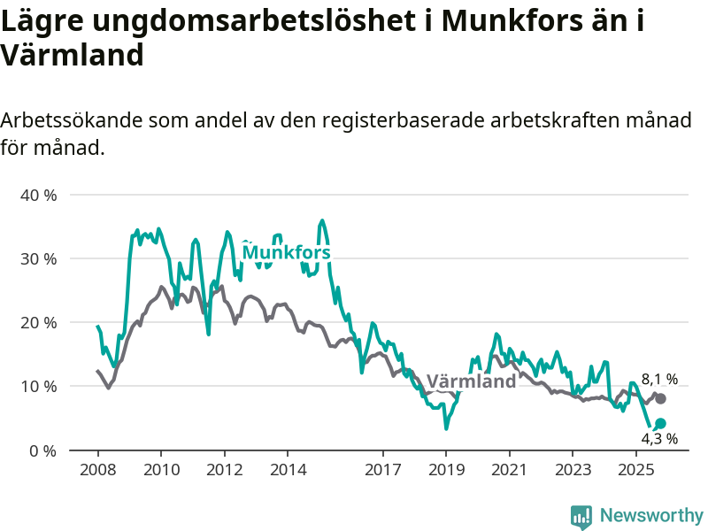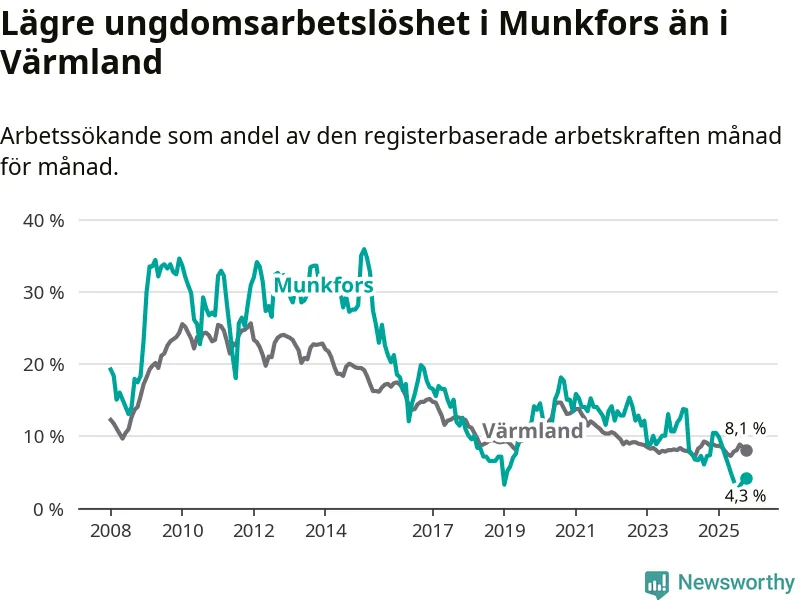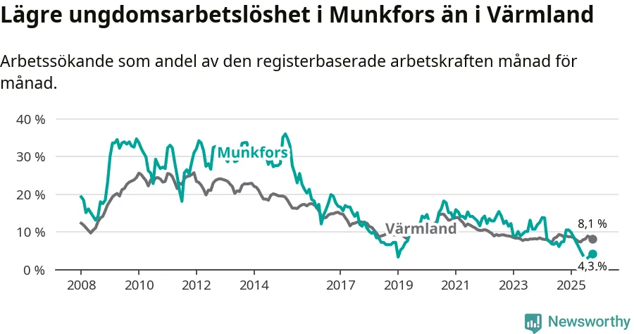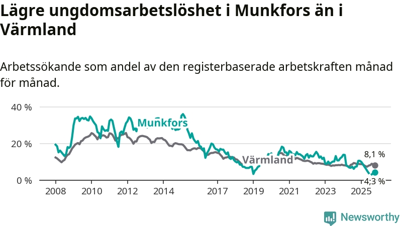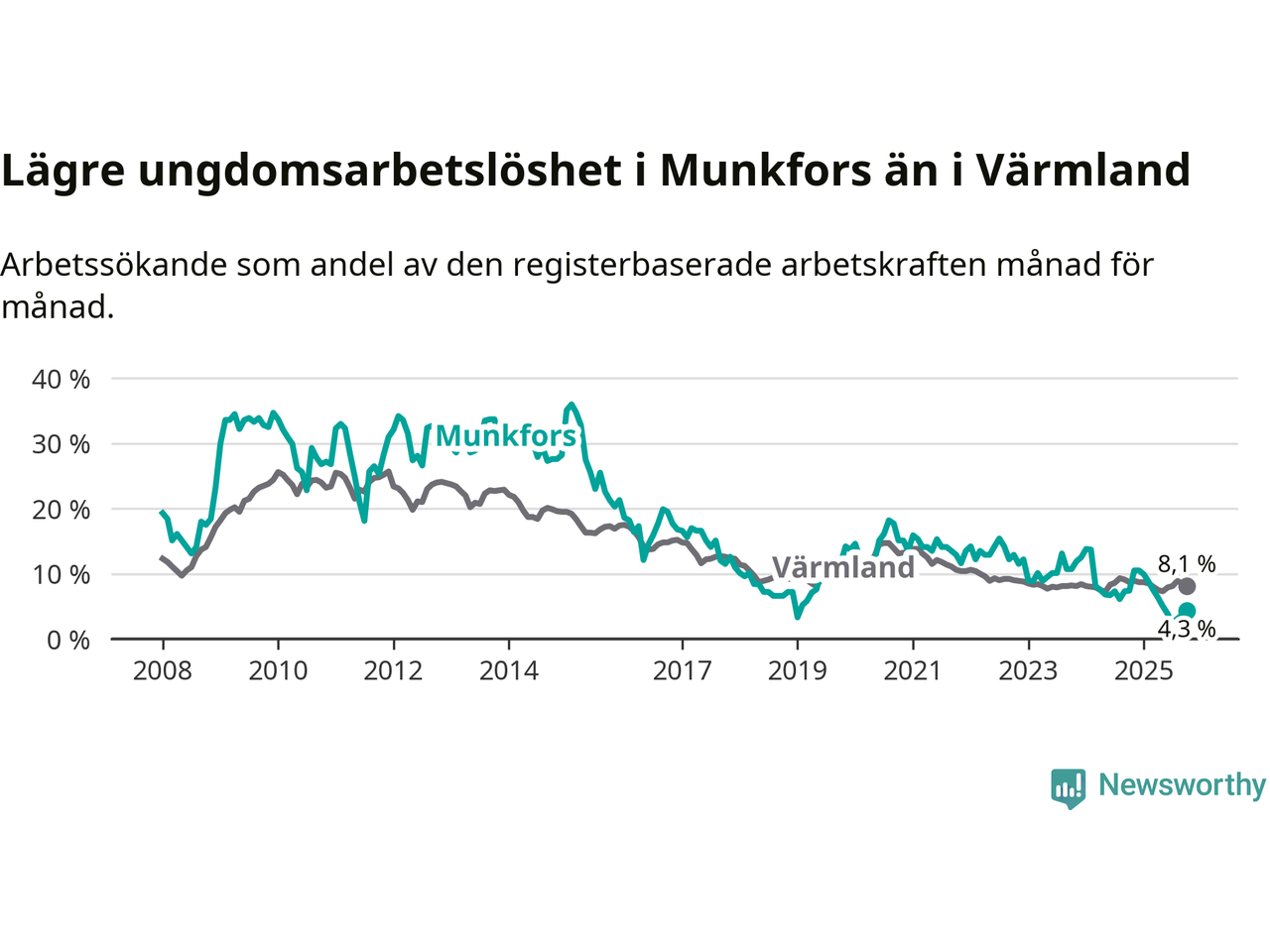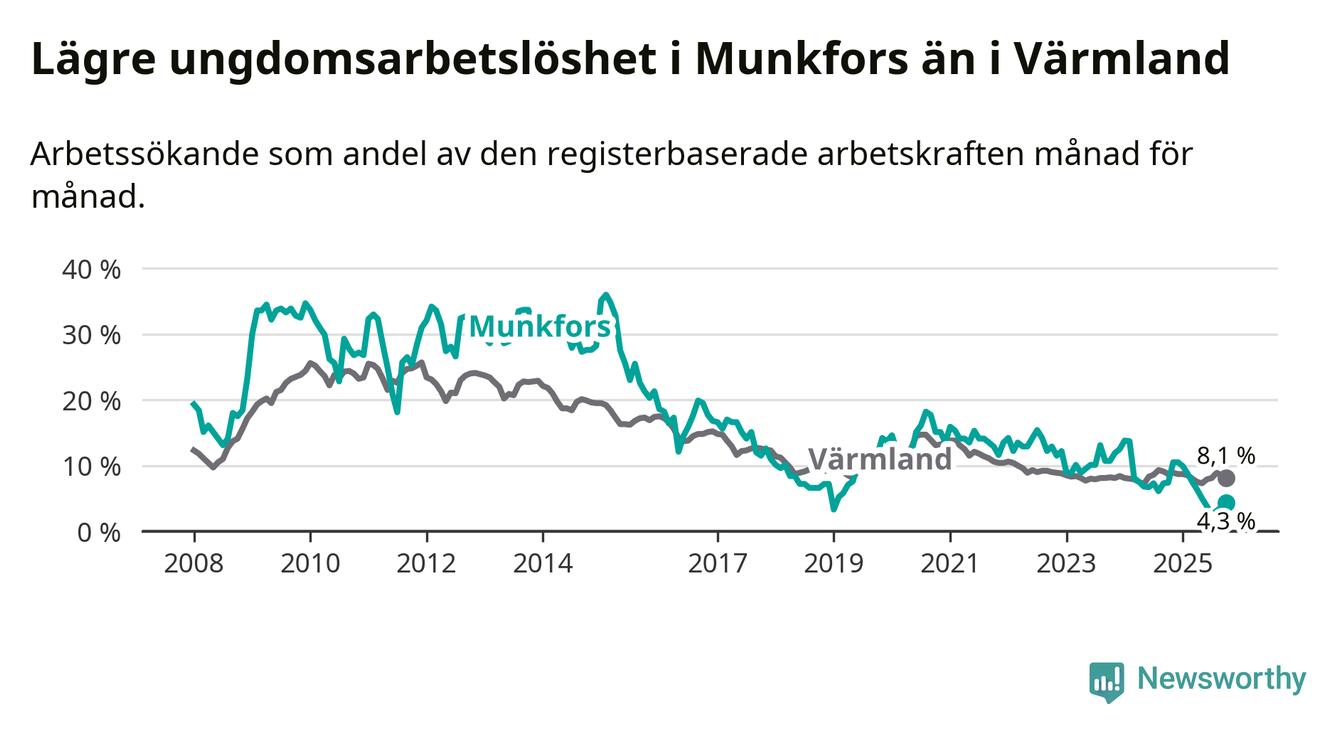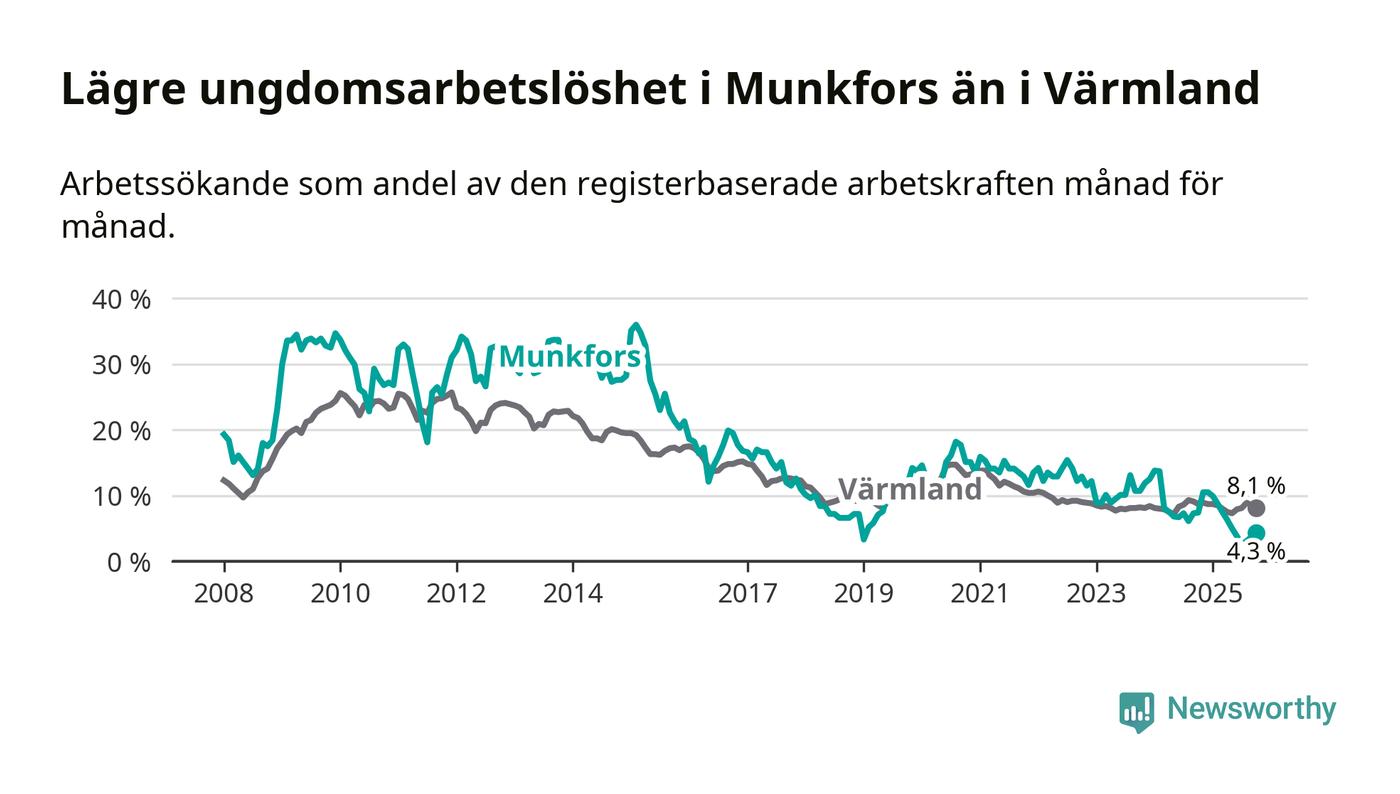 Medan Munkfors har ungefär samma total arbetslöshet som Värmland, ligger ungdomsarbetslösheten 3,8 procentenheter lägre i Munkfors.