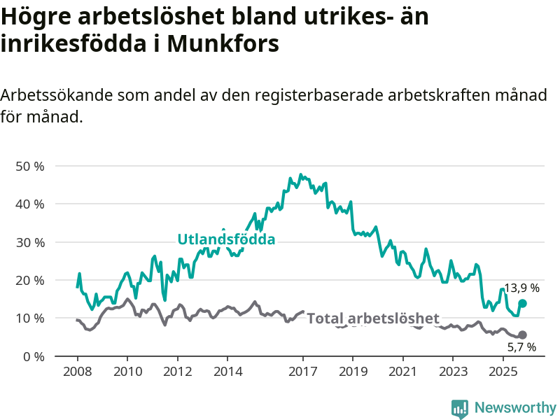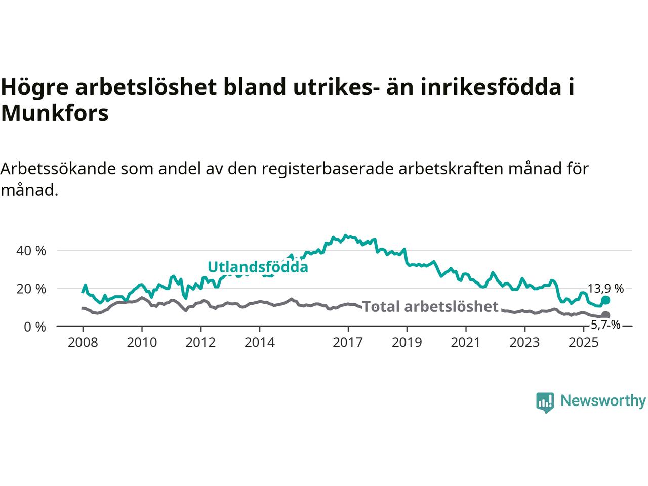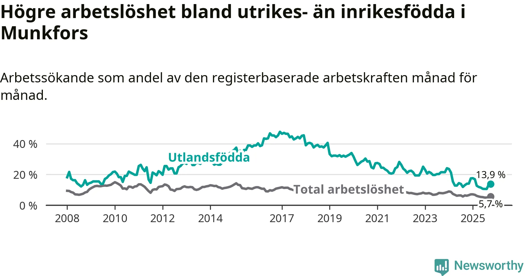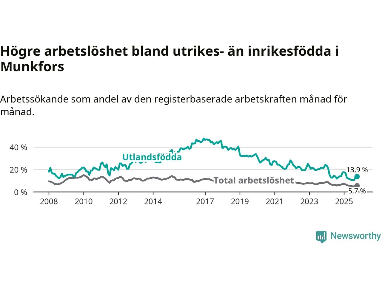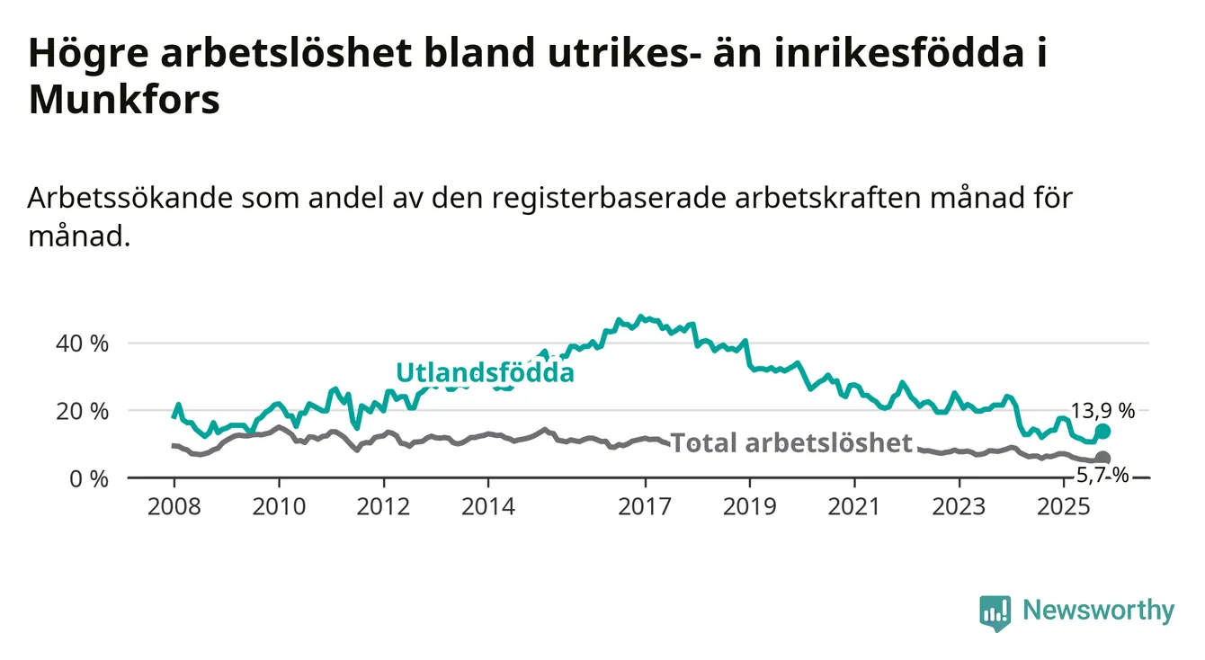 Skillnaden i arbetslöshet mellan utrikesfödda och hela befolkningen är 8,2 procentenheter i Munkfors.