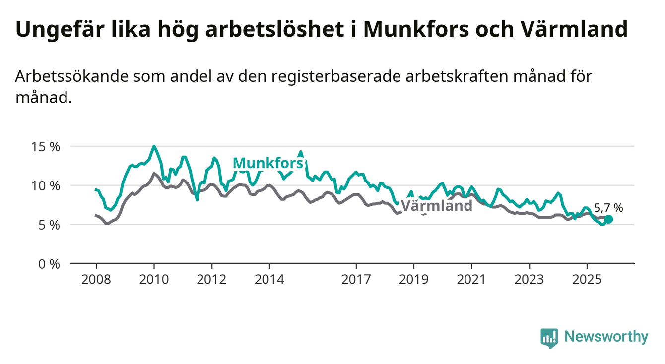 Under oktober månad rapporterade Munkfors kommun en total arbetslöshet på 5,7 procent. Det är en minskning jämfört med samma tidpunkt i fjol (−0,5 procentenheter). Även i Värmlands län sjunker arbetslösheten .