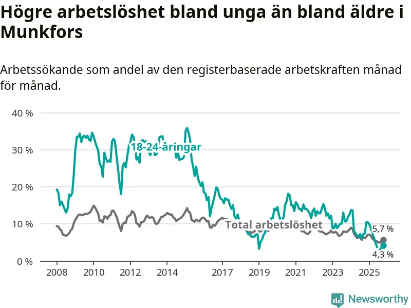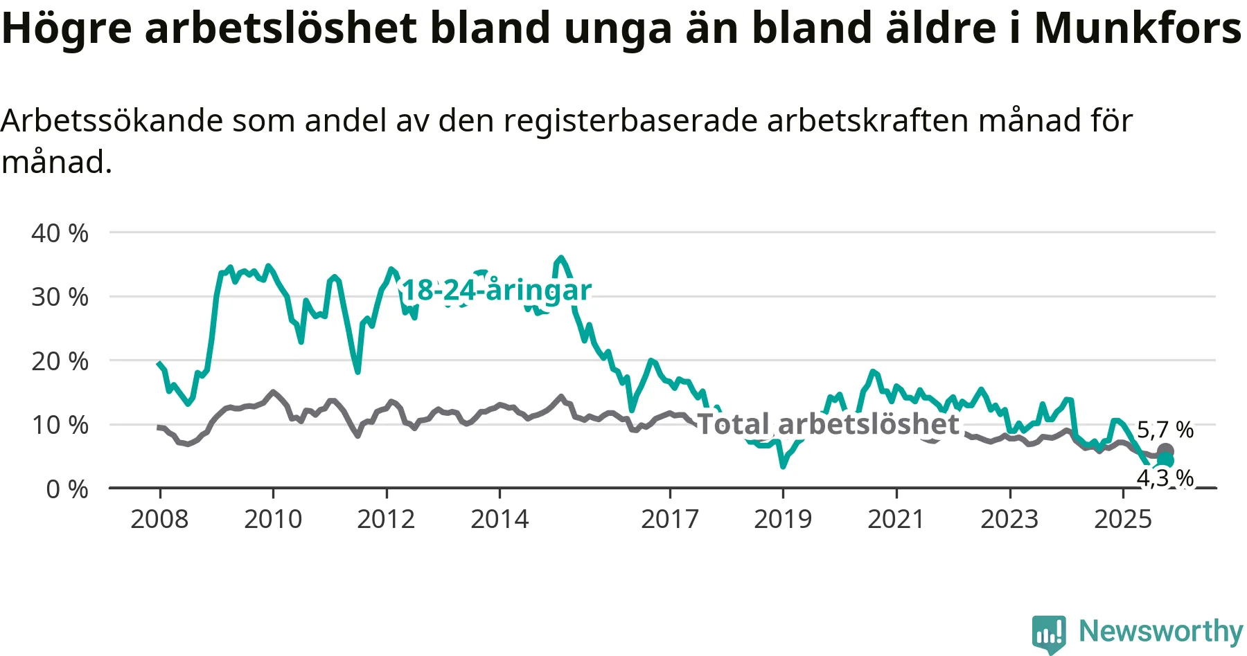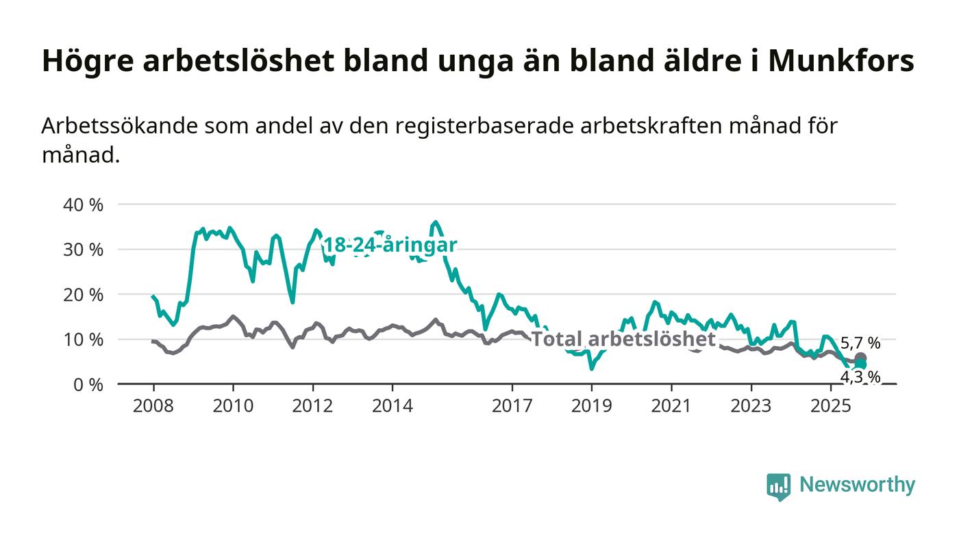 I och med den senaste månadens nedgång har de ungas arbetslöshet i Munkfors sjunkit 20 månader i följd (ner från 13,7 procent i februari 2024 till 4,3 procent nu).