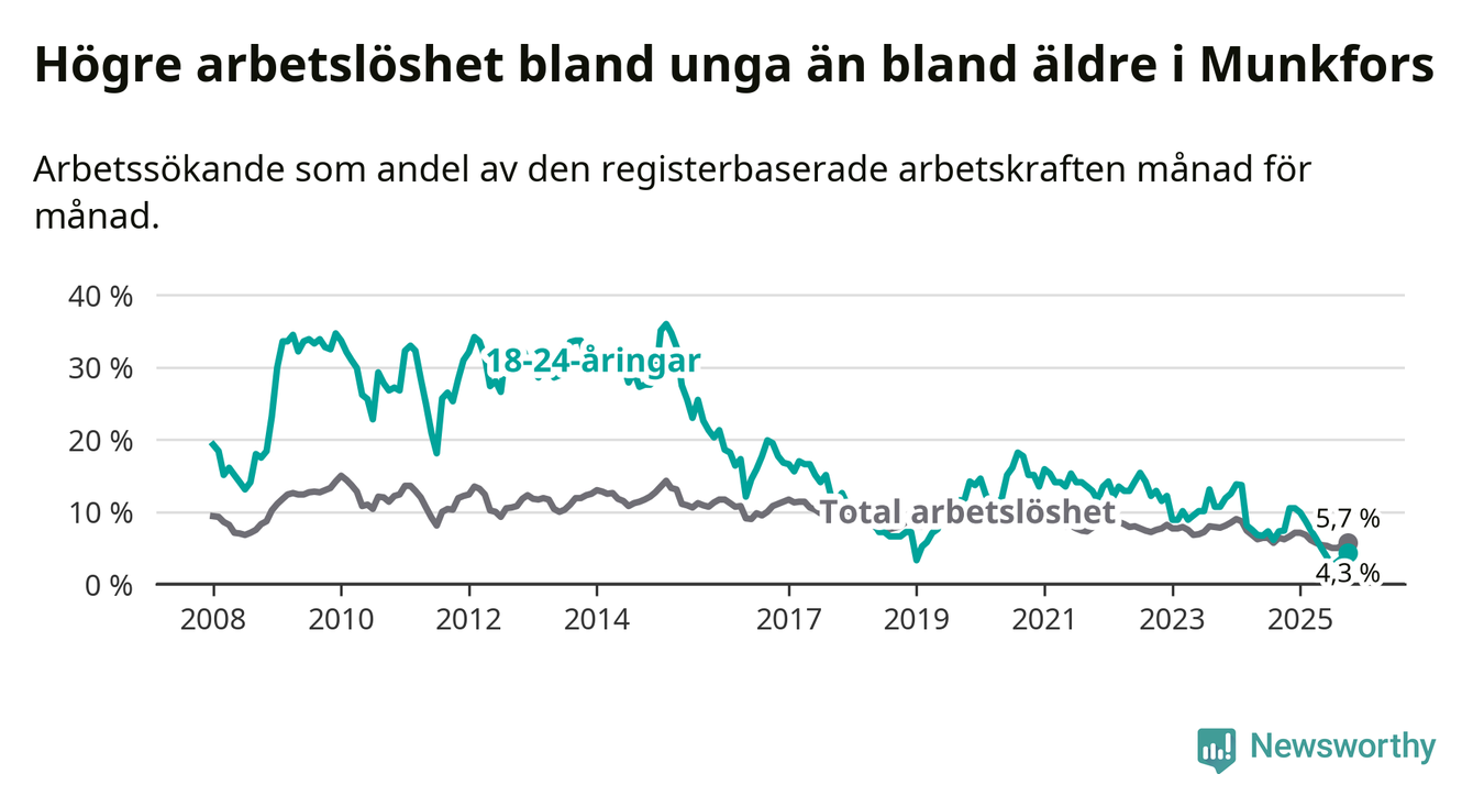| Bland ungdomar | 4,3 % | −3,1 % ▼ | 8,1 % | −0,6 % ▼ | 7,8 % | −0,5 % ▼ |