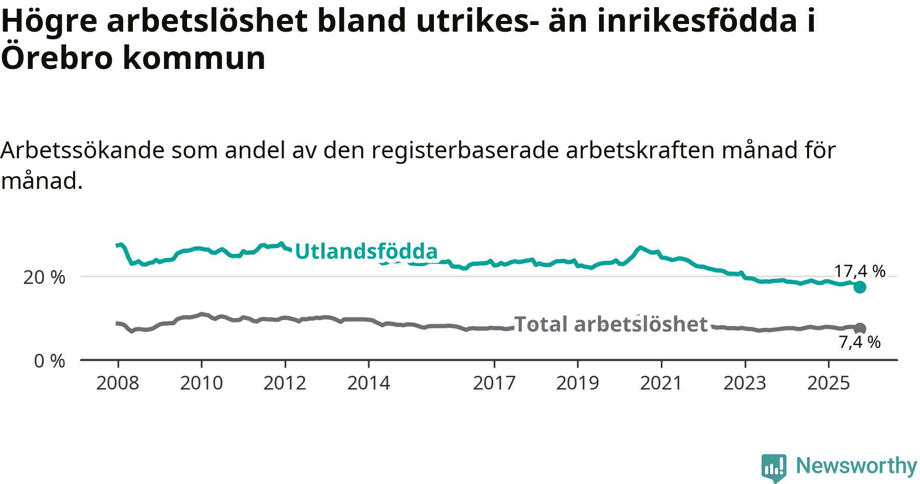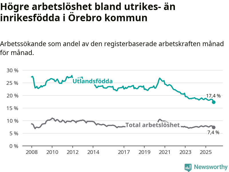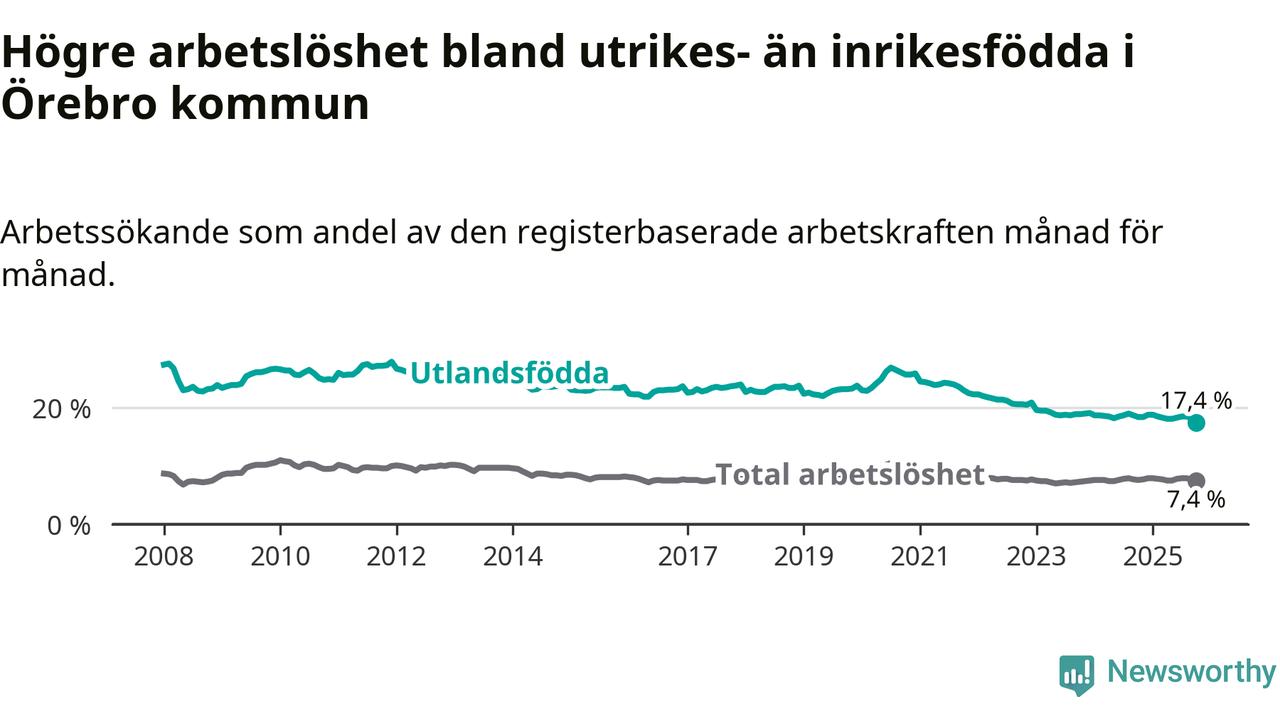 Skillnaden i arbetslöshet mellan utrikesfödda och hela befolkningen är 10,0 procentenheter i Örebro. Det är en mindre skillnad än för ett år sedan (−0,8 procentenheter).