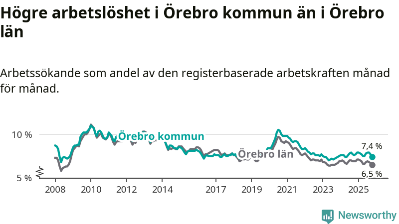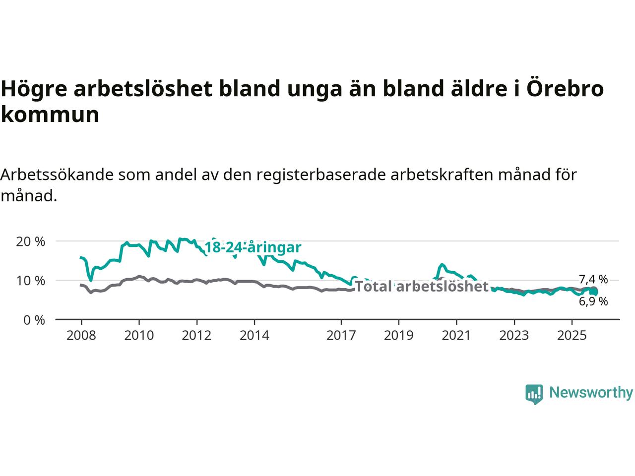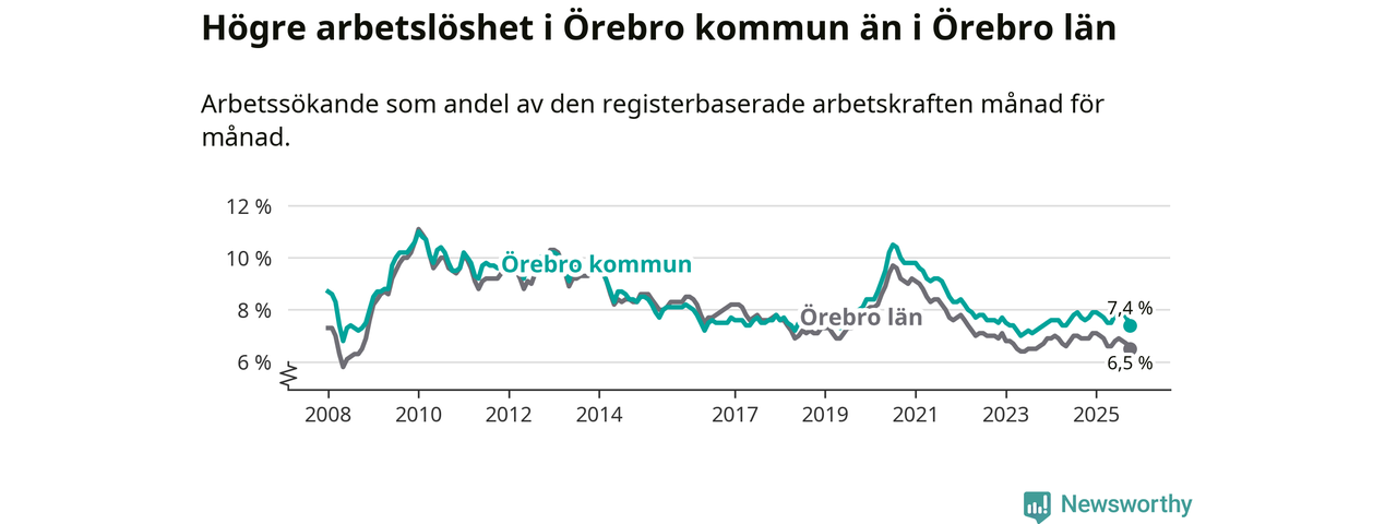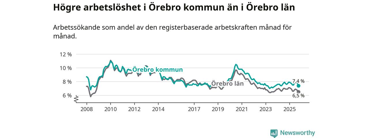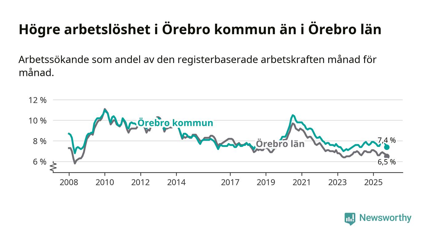 Under oktober månad rapporterade Örebro kommun en total arbetslöshet på 7,4 procent. Det är en minskning jämfört med samma tidpunkt i fjol (−0,2 procentenheter). Även i Örebro län sjunker arbetslösheten .