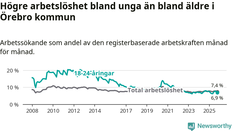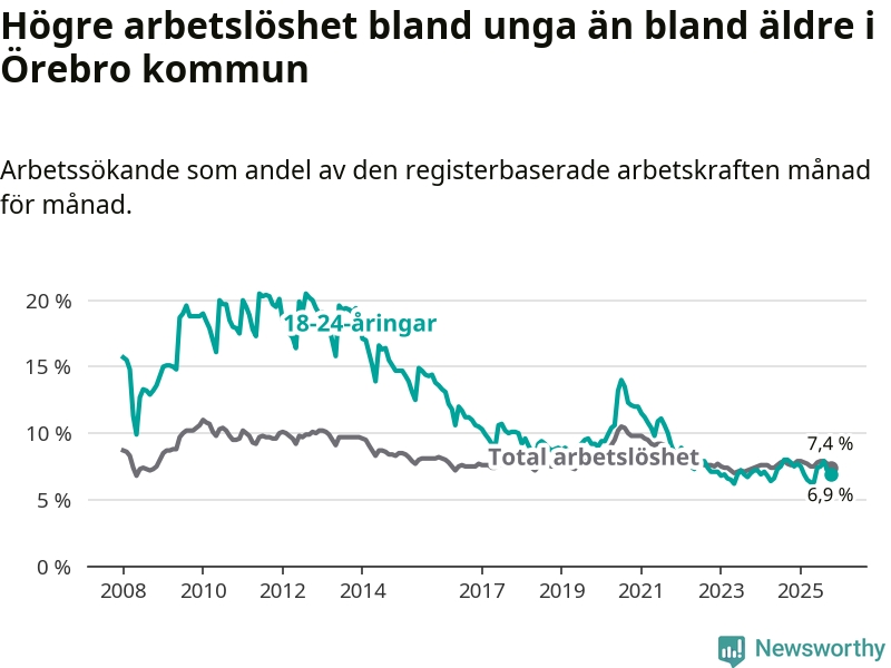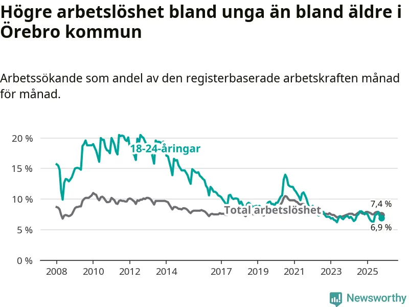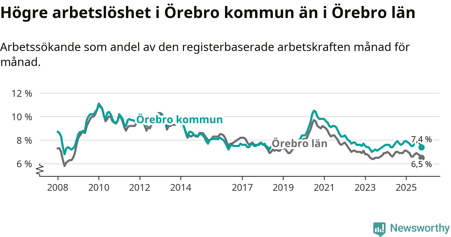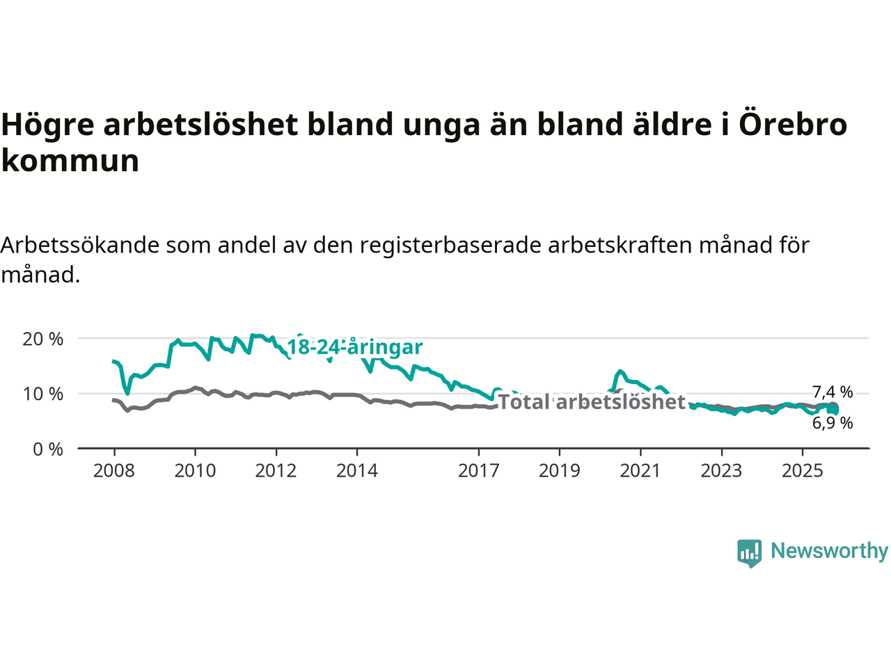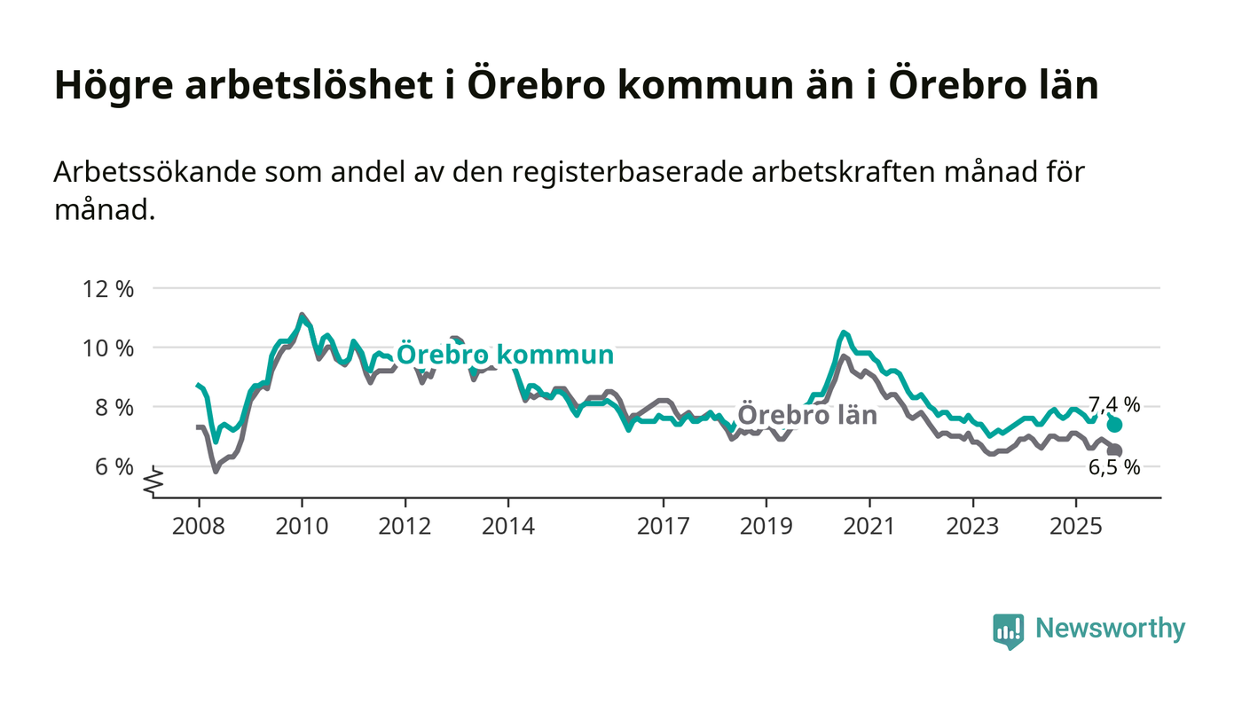 Under oktober månad rapporterade Örebro kommun en total arbetslöshet på 7,4 procent. Det är en minskning jämfört med samma tidpunkt i fjol (−0,2 procentenheter). Även i Örebro län sjunker arbetslösheten .