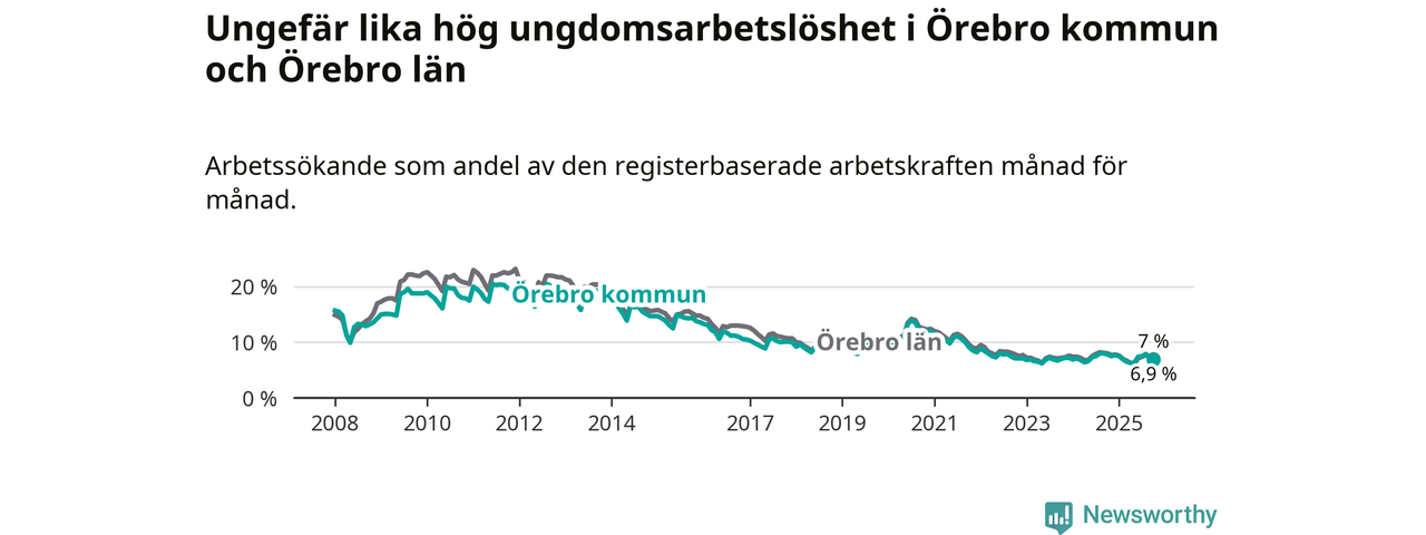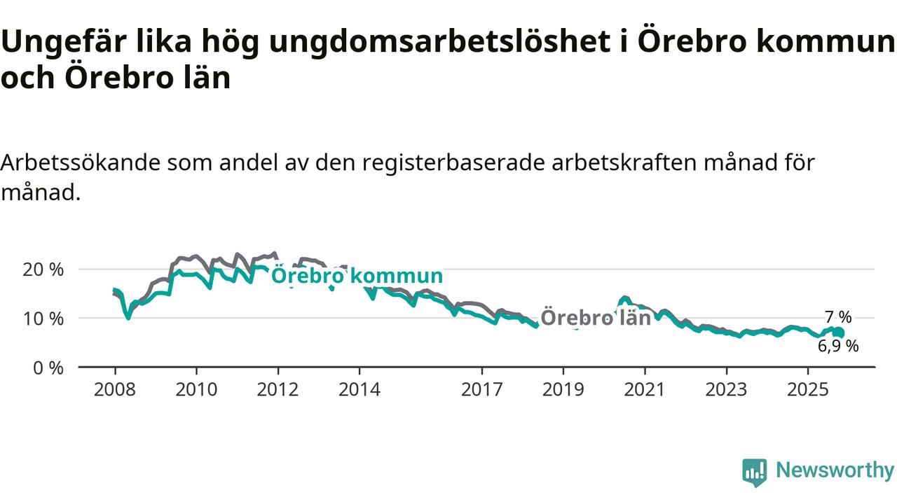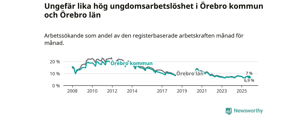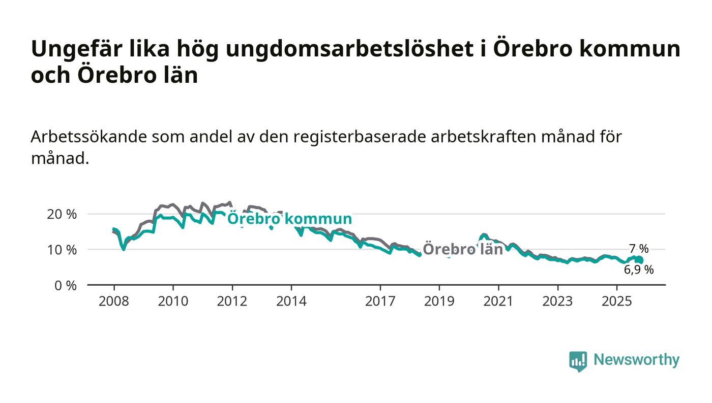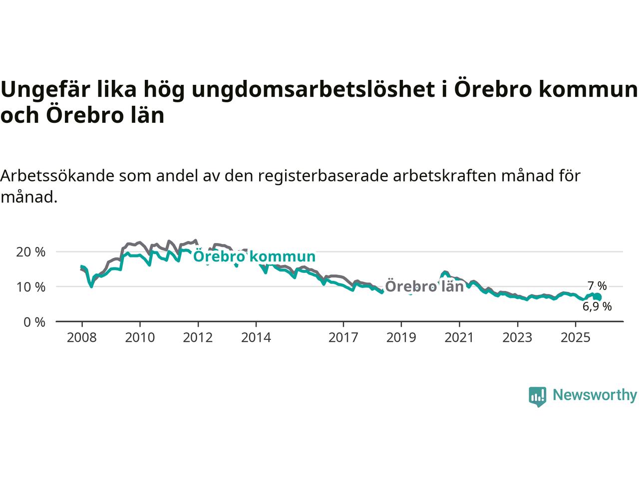 Medan Örebro har högre total arbetslöshet än Örebro, ligger ungdomsarbetslösheten på i stort sett samma nivå.
