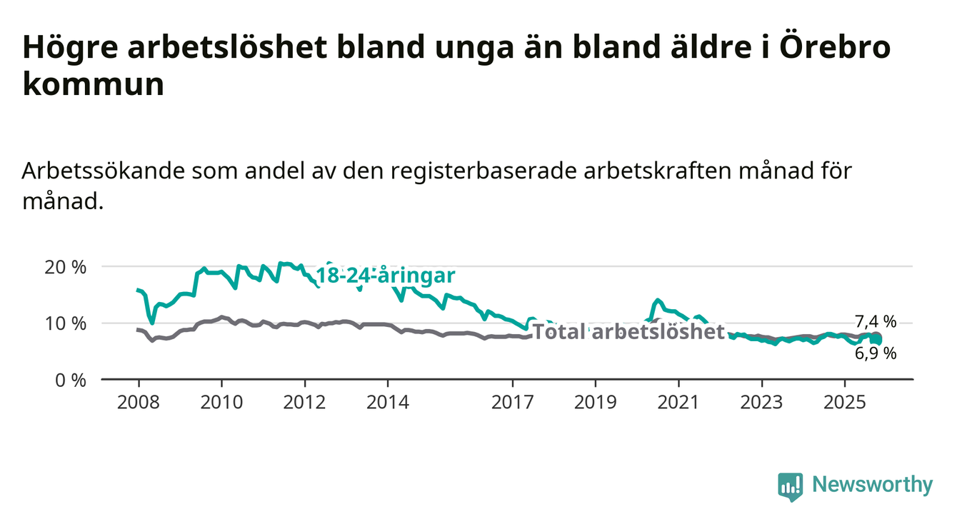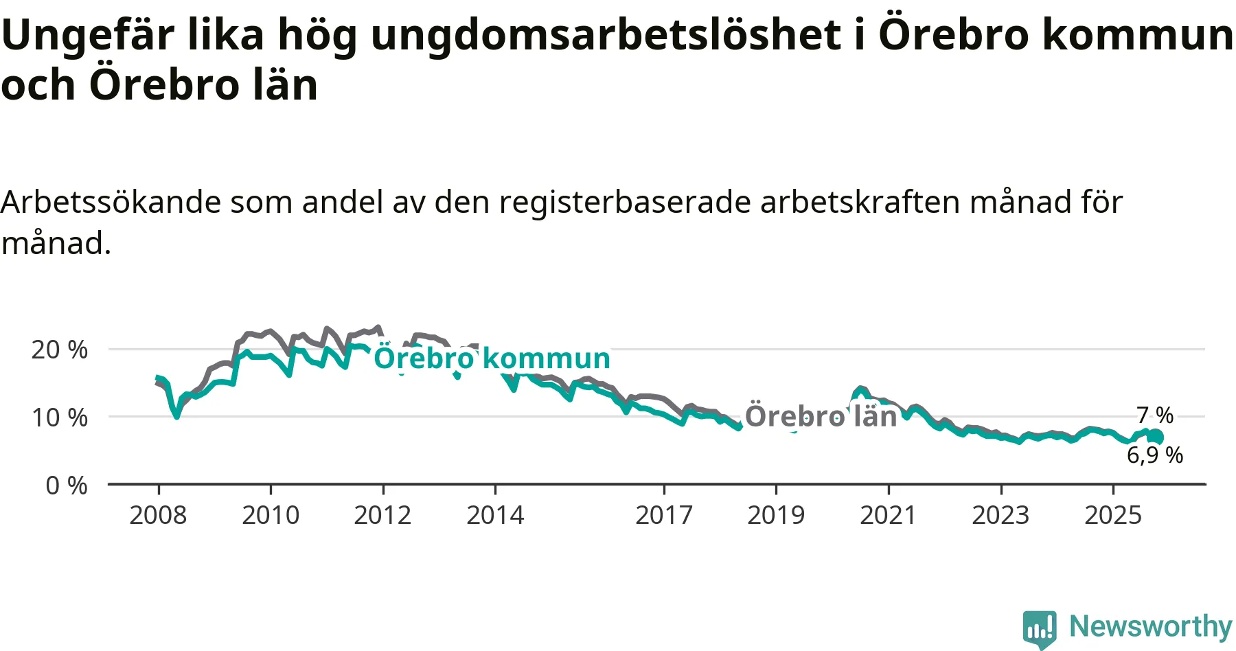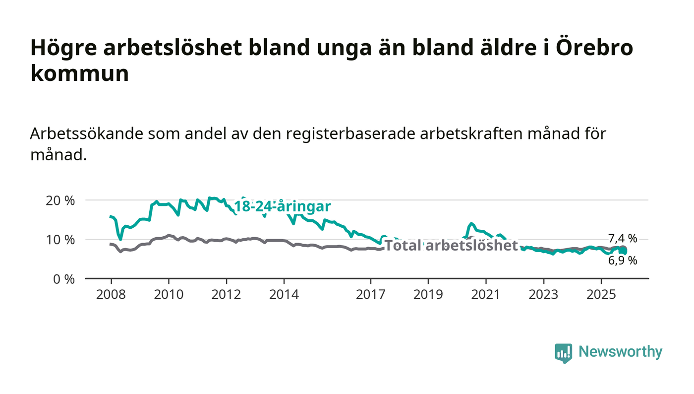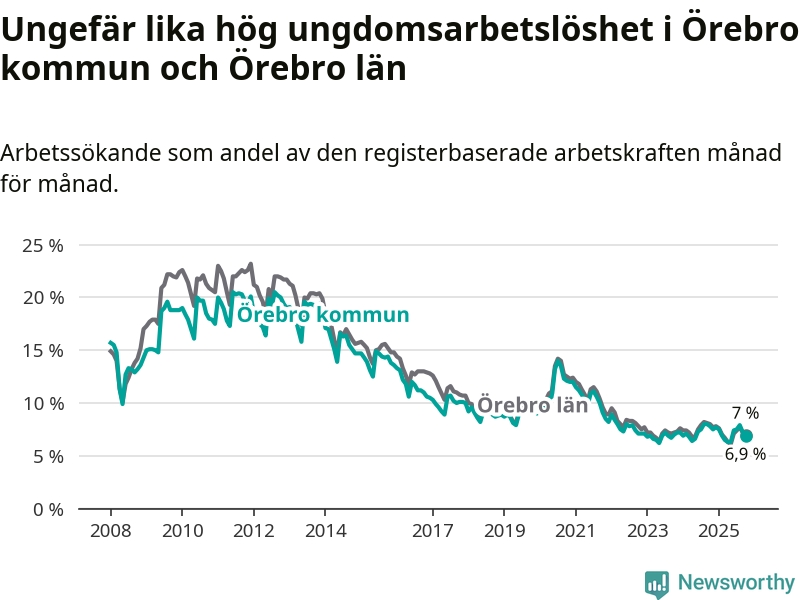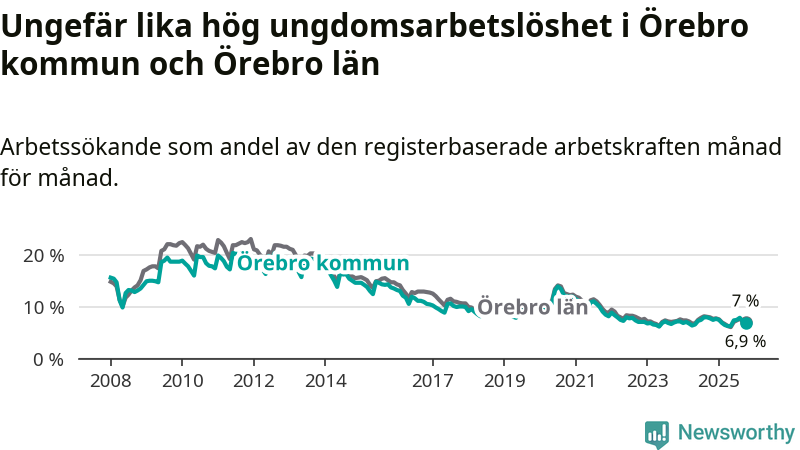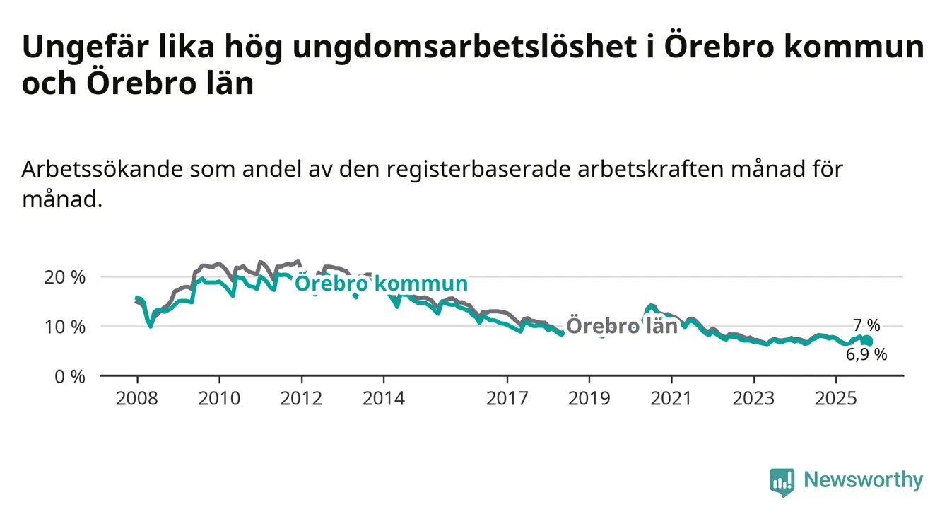 Medan Örebro har högre total arbetslöshet än Örebro, ligger ungdomsarbetslösheten på i stort sett samma nivå.