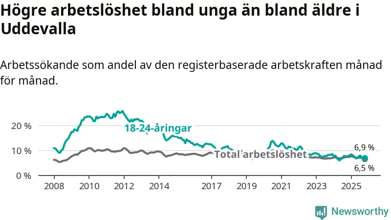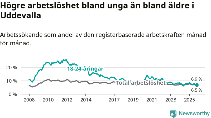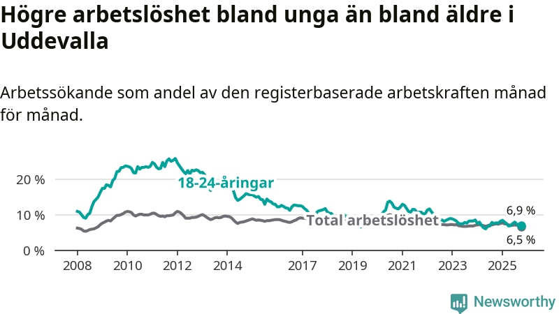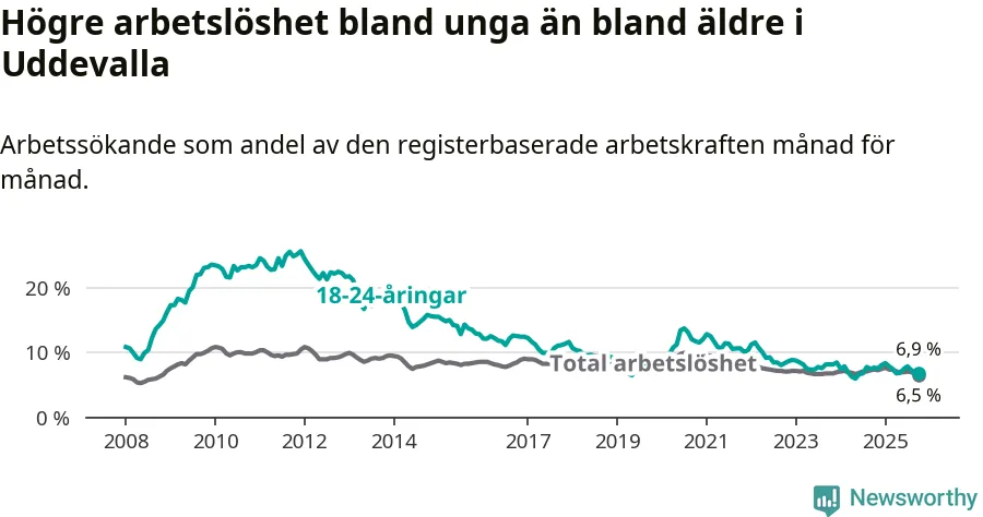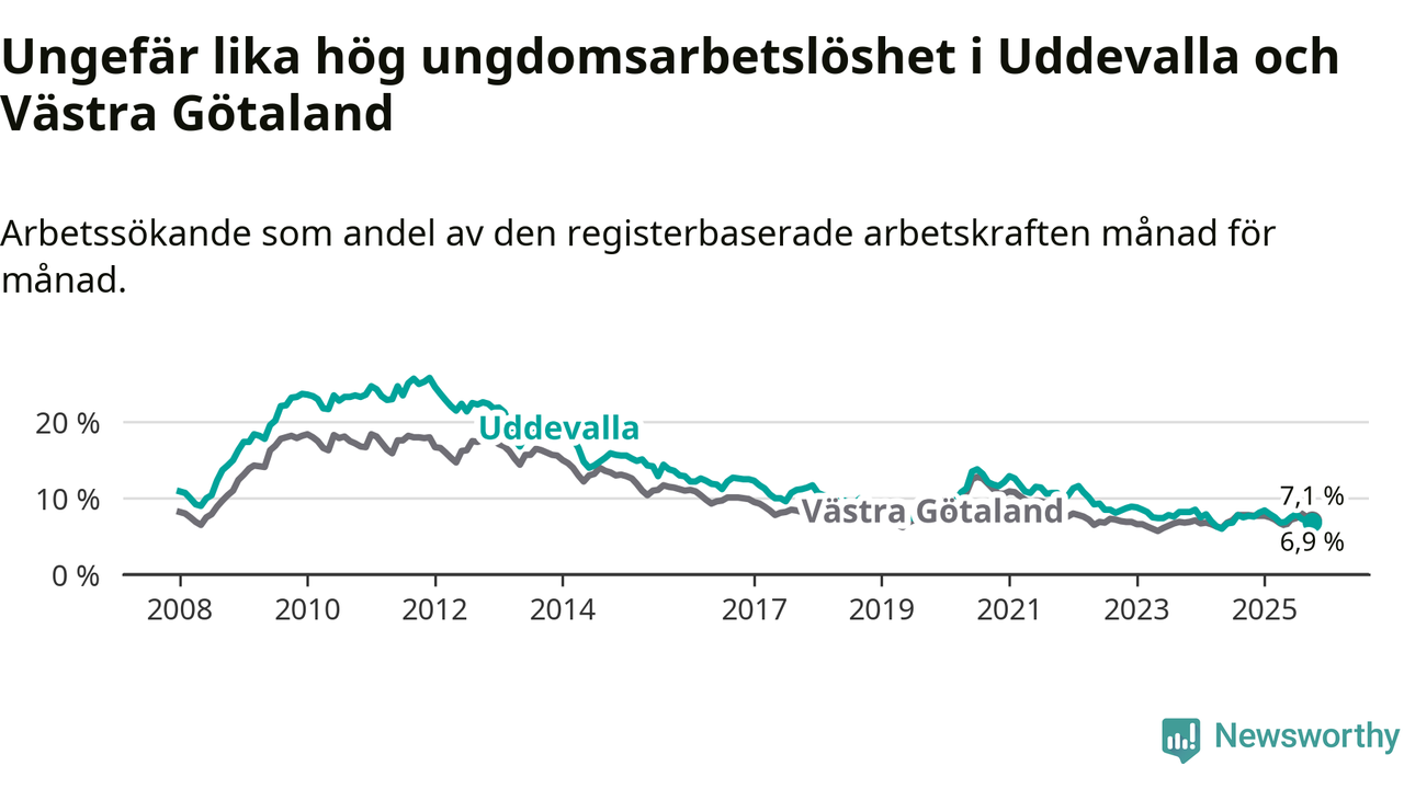 Medan Uddevalla har högre total arbetslöshet än Västra Götaland, ligger ungdomsarbetslösheten på i stort sett samma nivå.