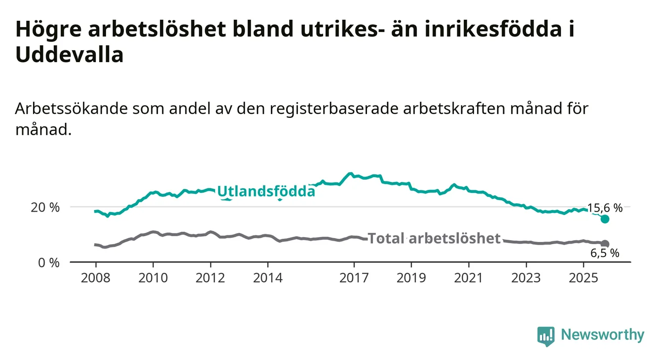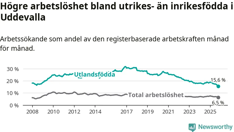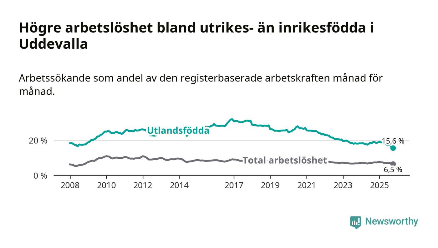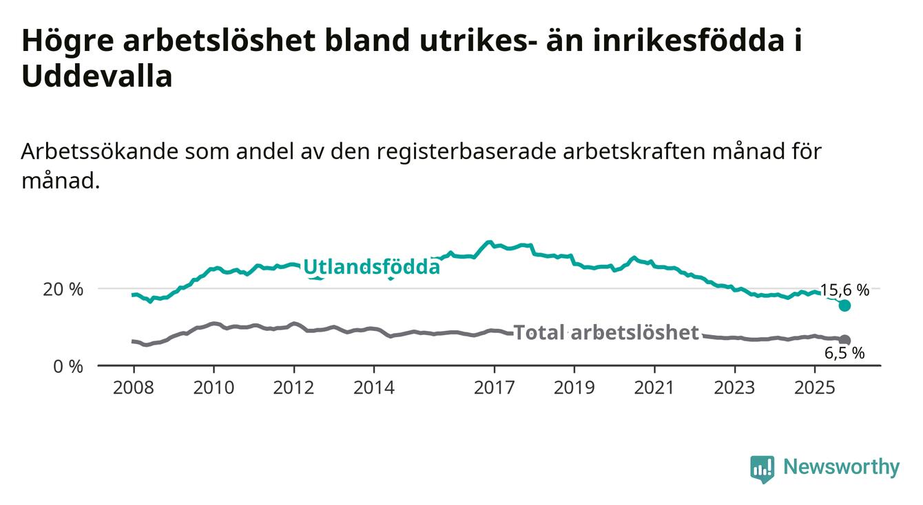 Arbetslösheten bland utlandsfödda var 15,6 procent i Uddevalla under oktober månad, motsvarande 965 av 6 186 personer. Det är 3,3 procentenheter färre än vid samma tidpunkt i fjol (−193 om man räknar personer). Den nuvarande arbetslöshetsnivån är den lägsta sedan januari 2008.