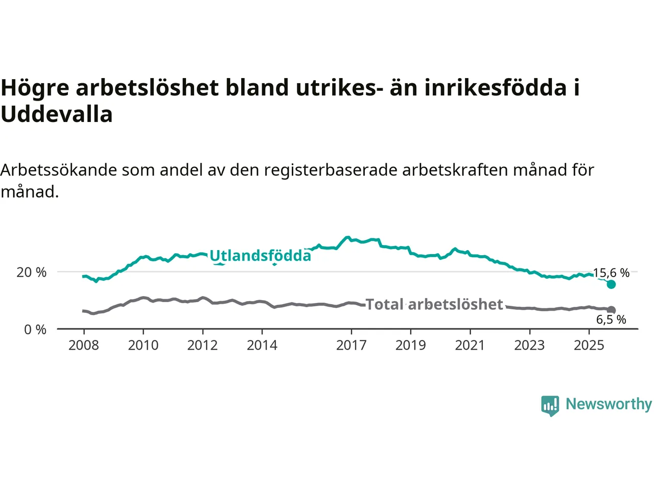 Skillnaden i arbetslöshet mellan utrikesfödda och hela befolkningen är 9,1 procentenheter i Uddevalla. Det är en betydligt mindre skillnad än för ett år sedan (−2,4 procentenheter).