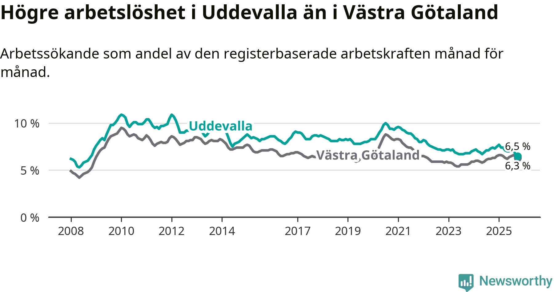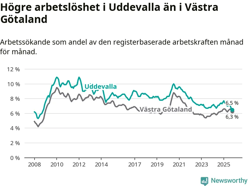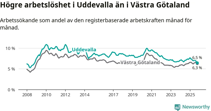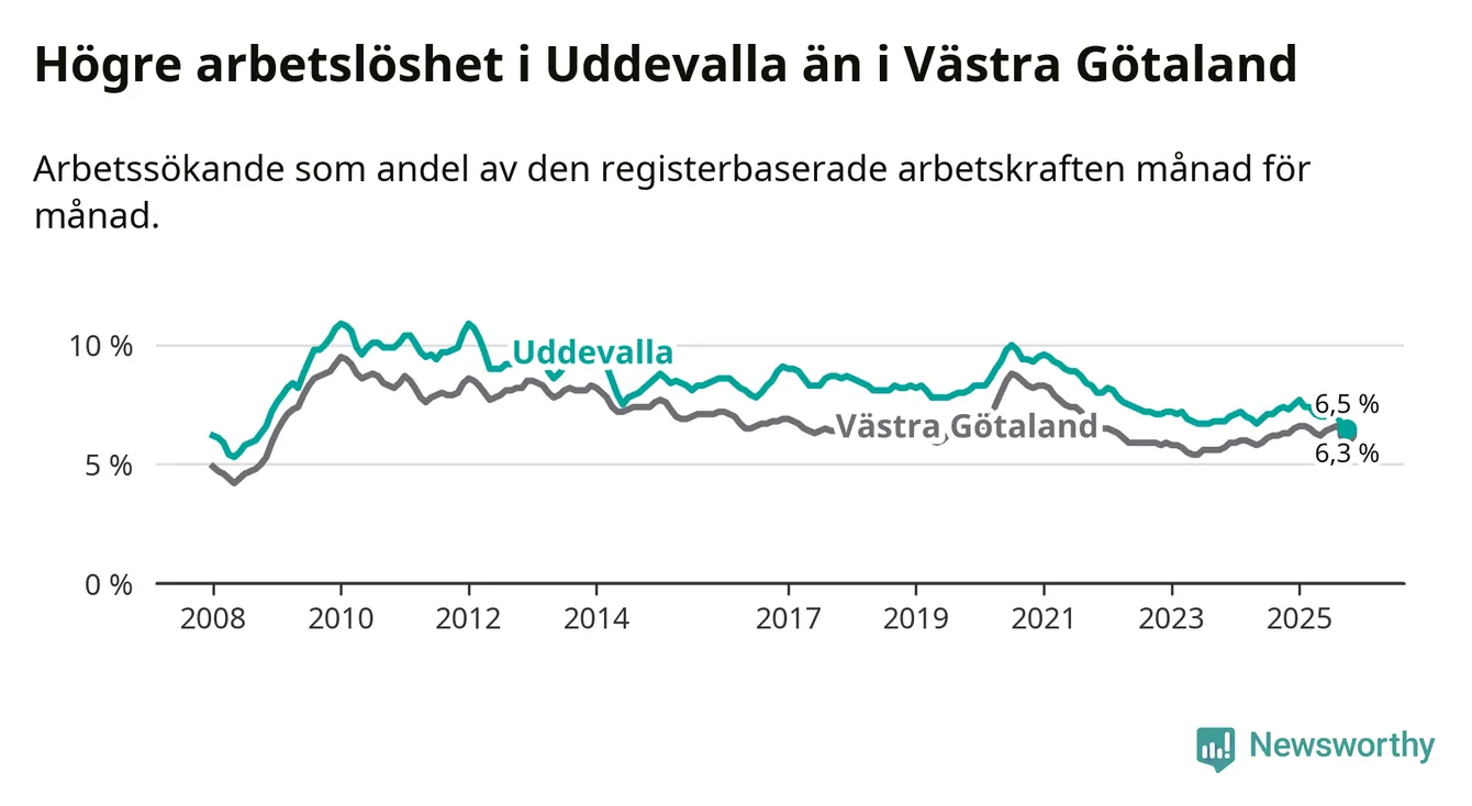 Under oktober månad rapporterade Uddevalla kommun en total arbetslöshet på 6,5 procent. Det är en minskning jämfört med samma tidpunkt i fjol (−0,9 procentenheter). I Västra Götalands län däremot står arbetslösheten stilla.