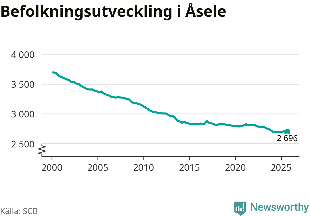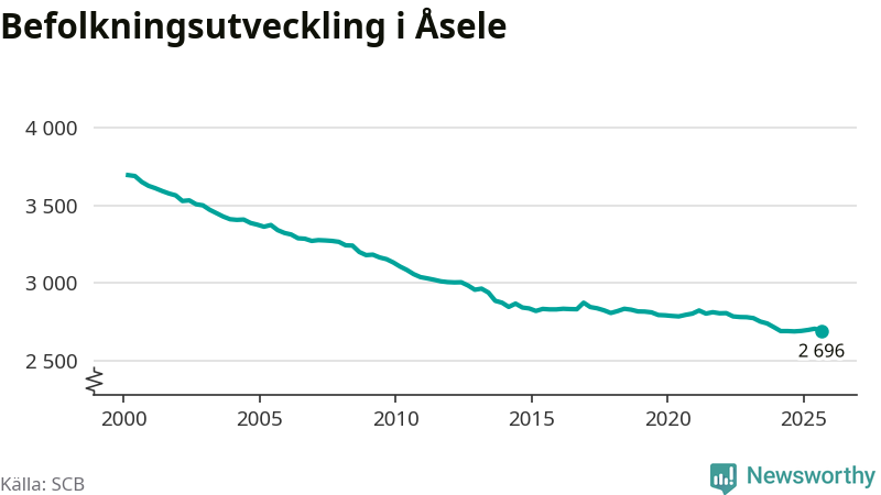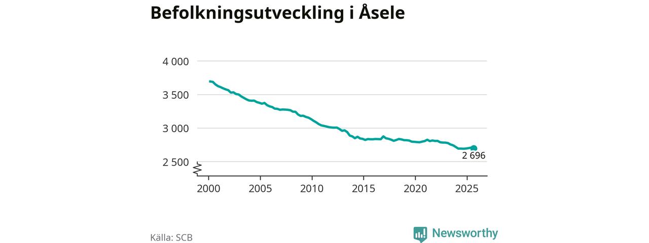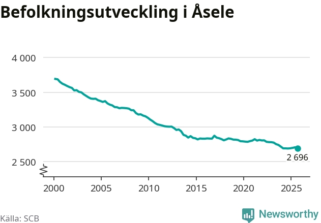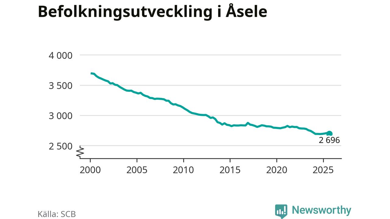 Befolkningen minskade i Åsele kommun under det tredje kvartalet 2025. Den 30 september bodde enligt SCB:s senaste siffror 2 696 personer i kommunen, vilket är tolv färre än i slutet av andra kvartalet.