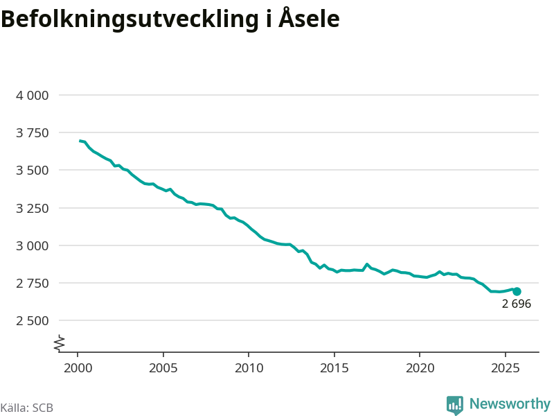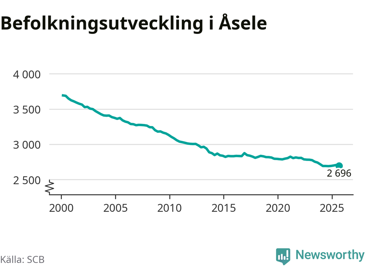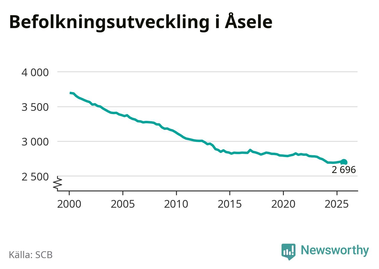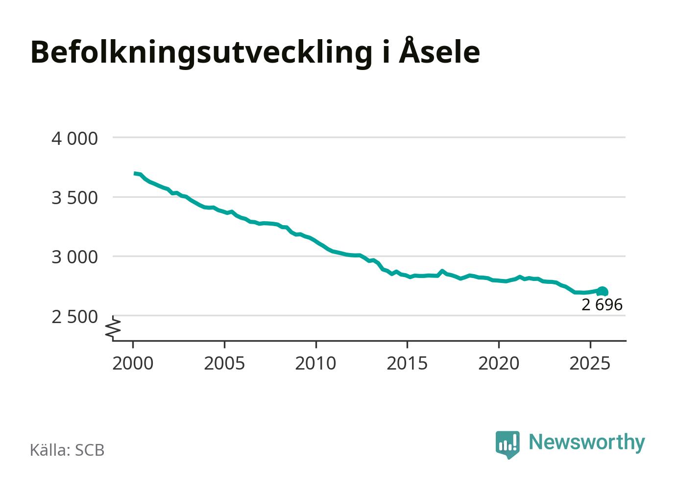 Jämfört med ett år sedan är befolkningen i princip lika stor i Åsele. Sedan millennieskiftet har folkmängden minskat med runt 1 000 personer, eller 27 procent.