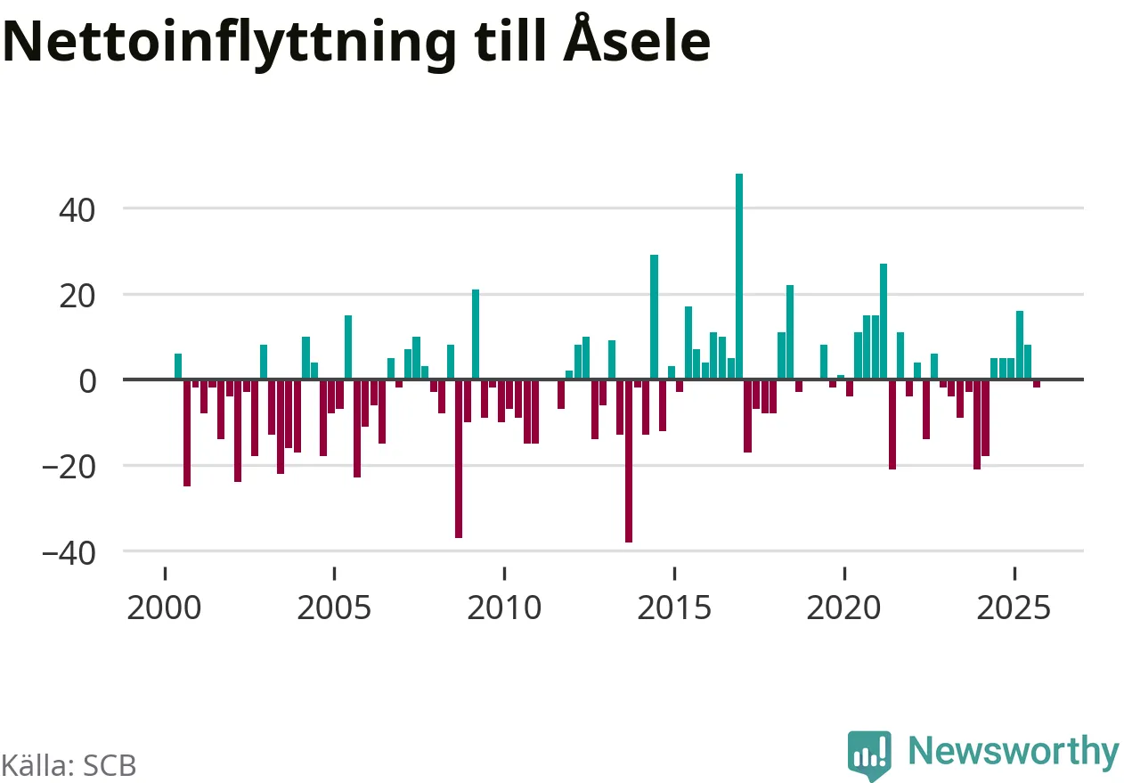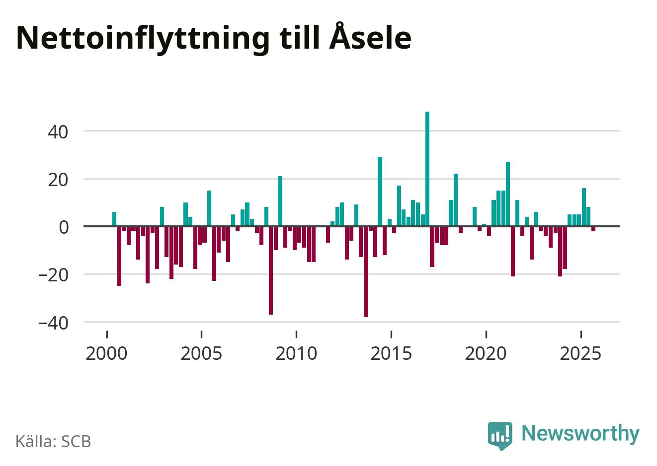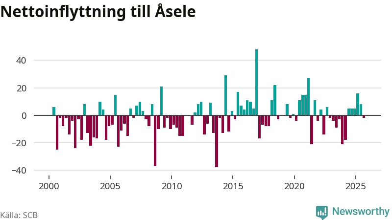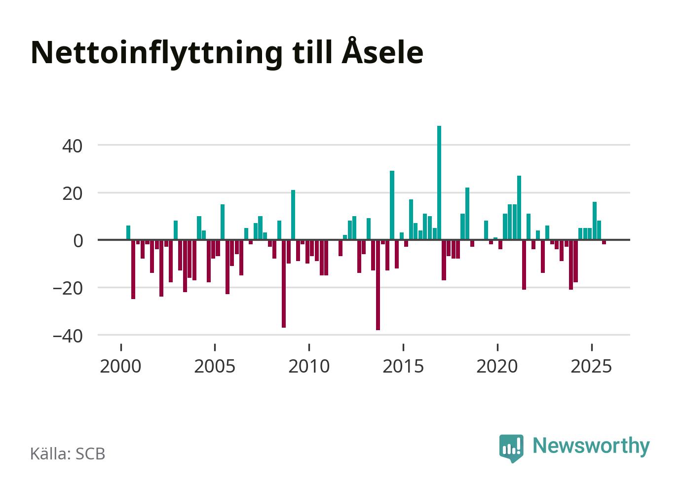 Under tredje kvartalet 2025 flyttade 47 personer till kommunen medan 49 personer flyttade därifrån. Skillnaden mellan antalet in- och utflyttade är så liten att den lika gärna kan bero på SCB:s slumpmässiga brus. Sedan seklets början har Åsele haft ungefär lika många kvartal med positivt flyttnetto som negativt.