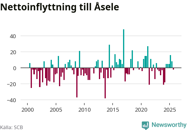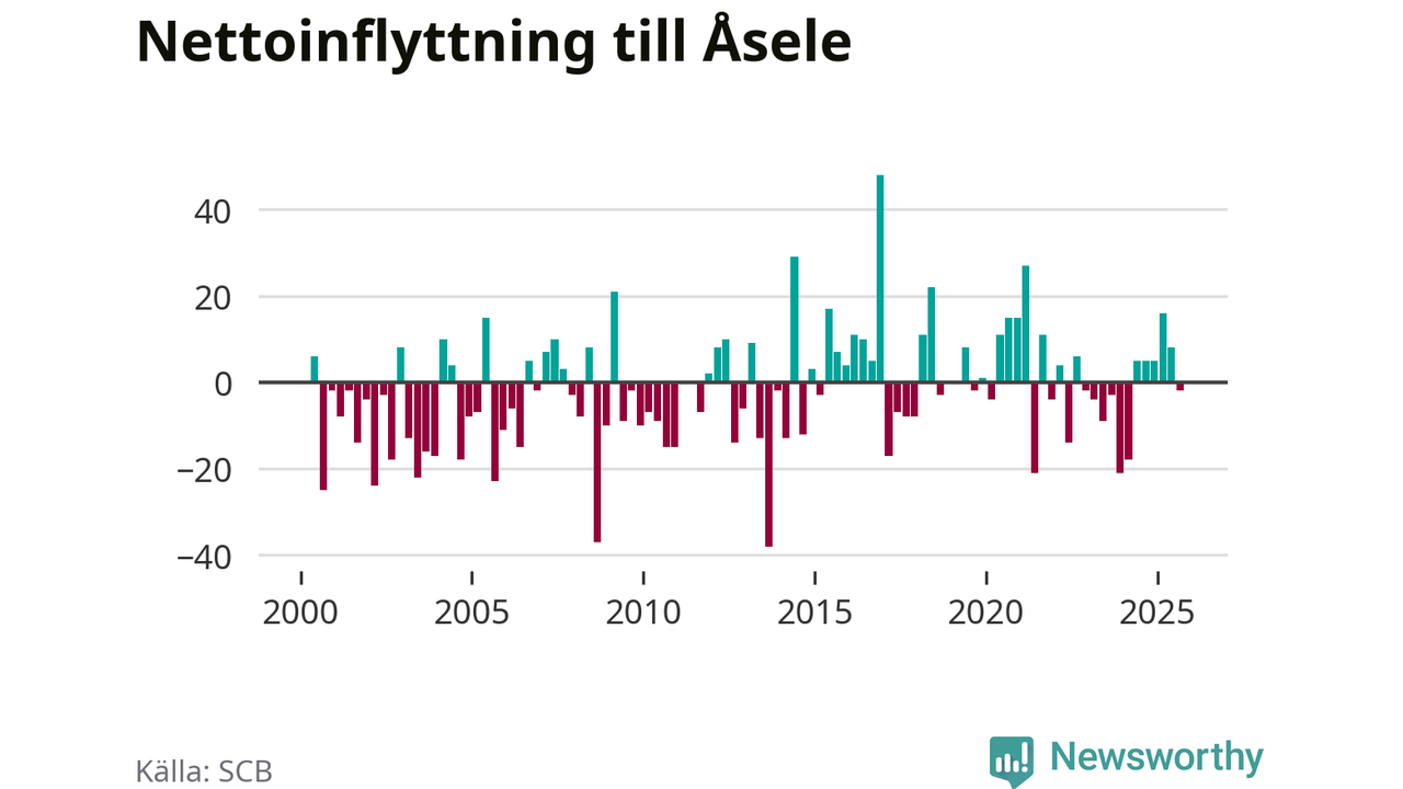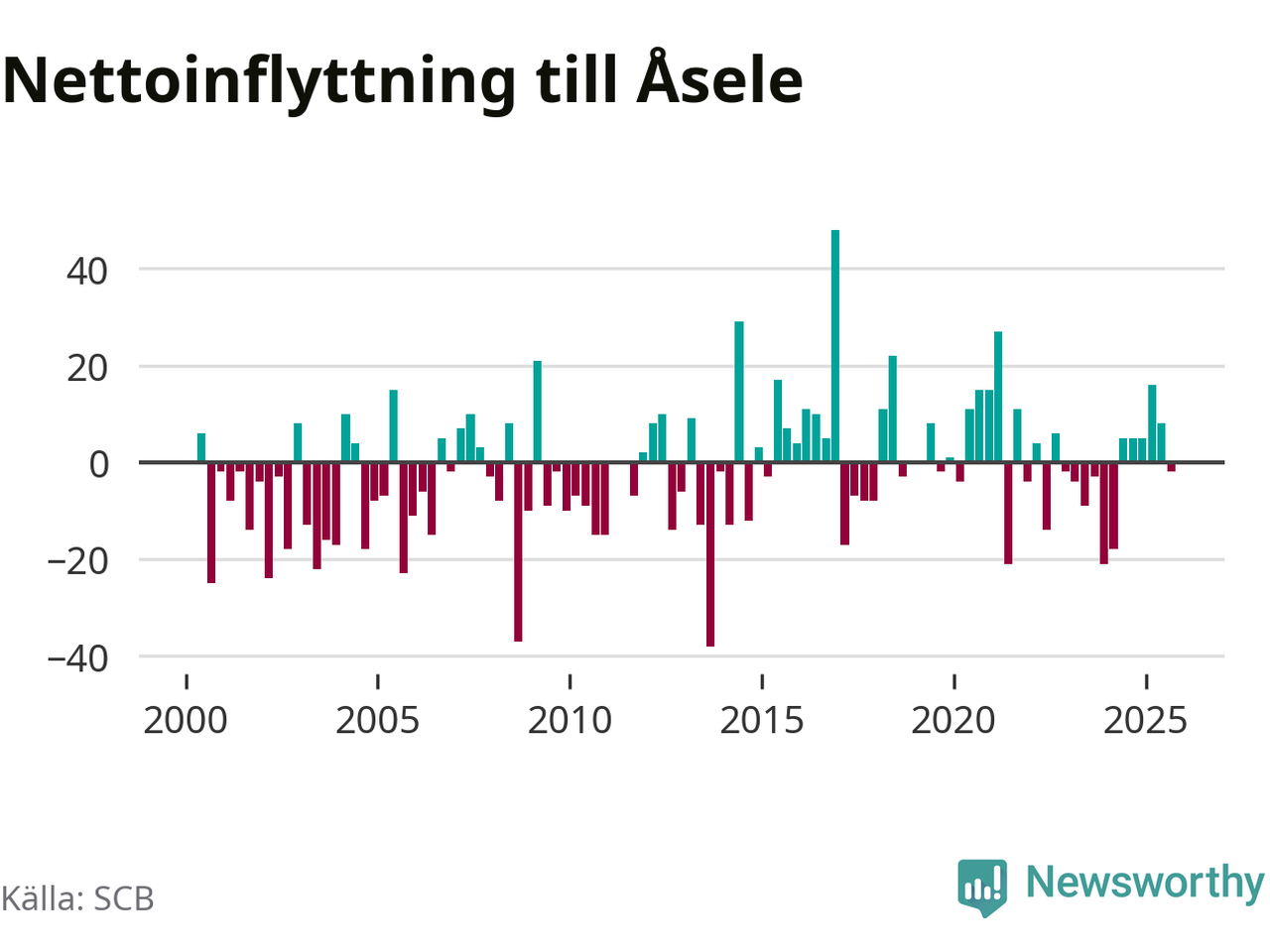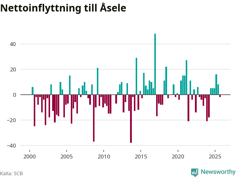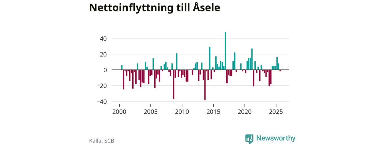Under tredje kvartalet 2025 flyttade 47 personer till kommunen medan 49 personer flyttade därifrån. Skillnaden mellan antalet in- och utflyttade är så liten att den lika gärna kan bero på SCB:s slumpmässiga brus. Sedan seklets början har Åsele haft ungefär lika många kvartal med positivt flyttnetto som negativt.