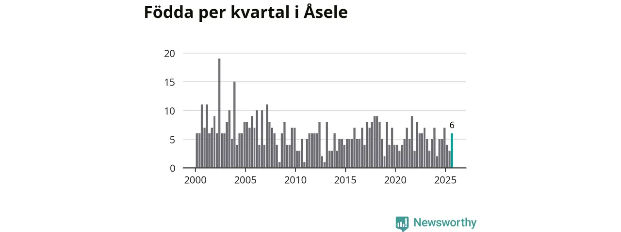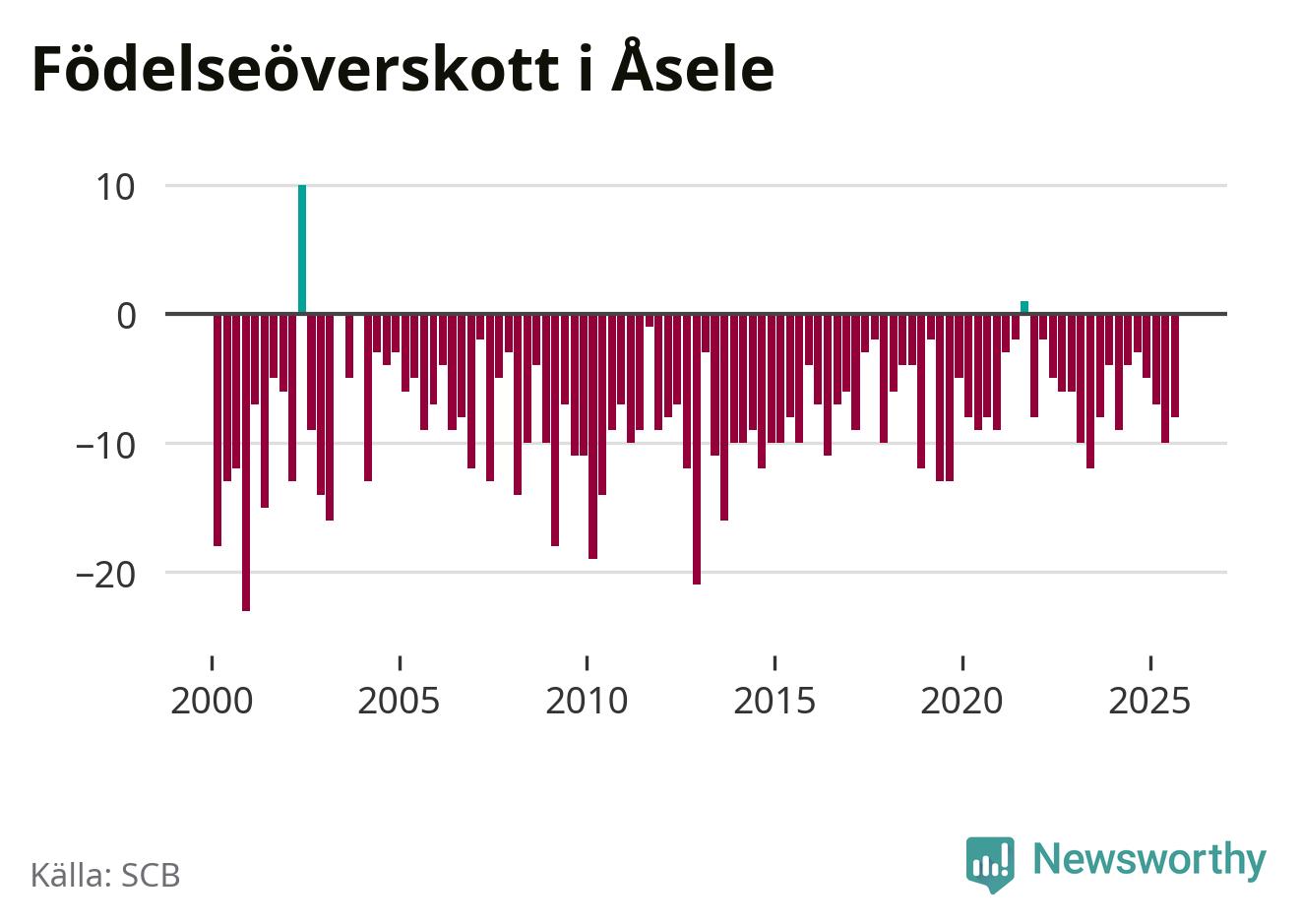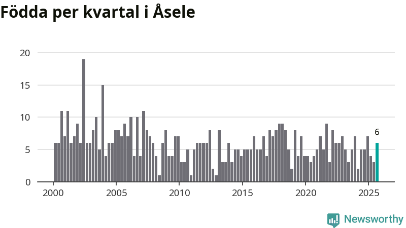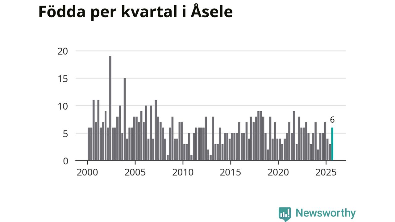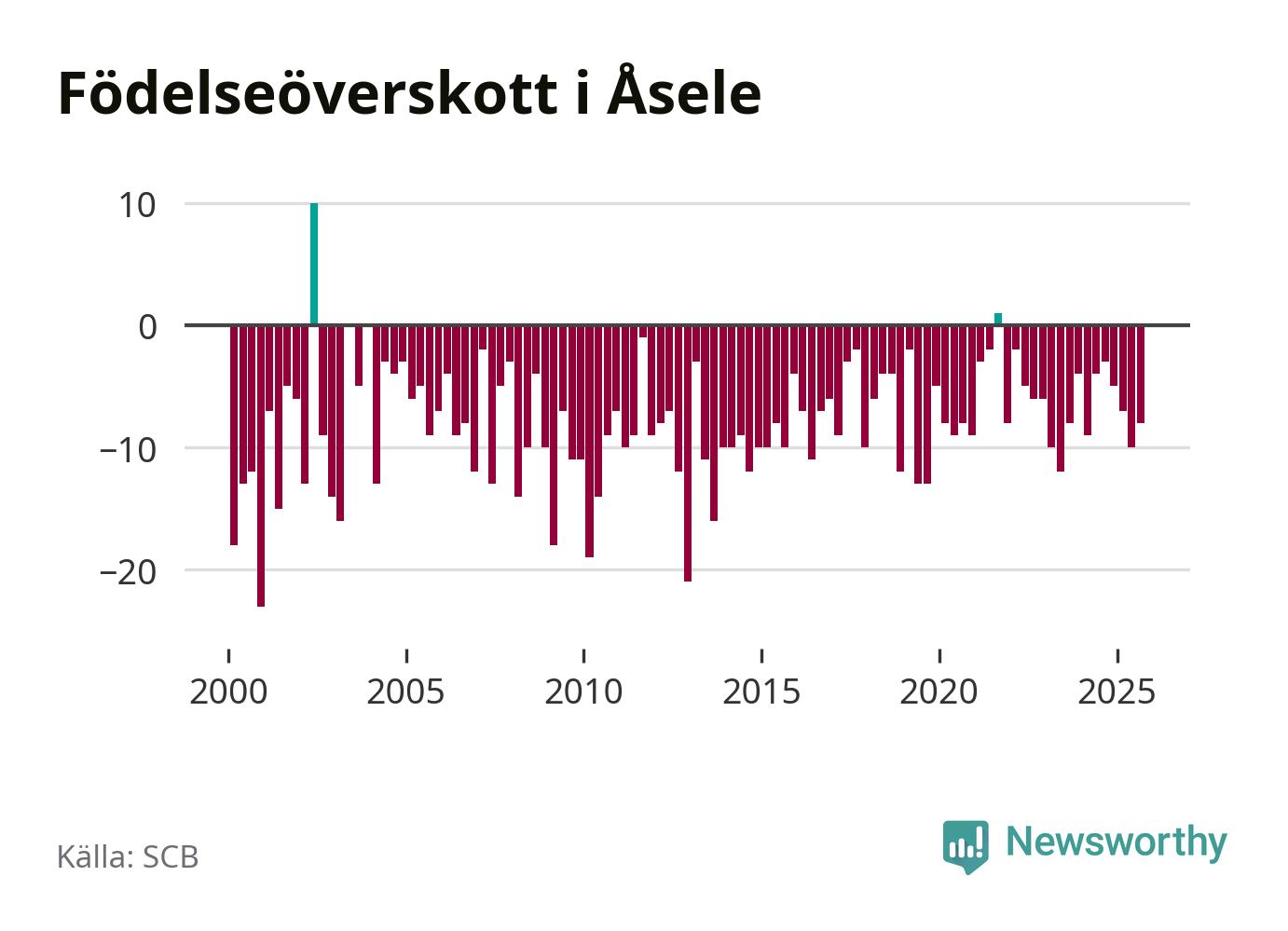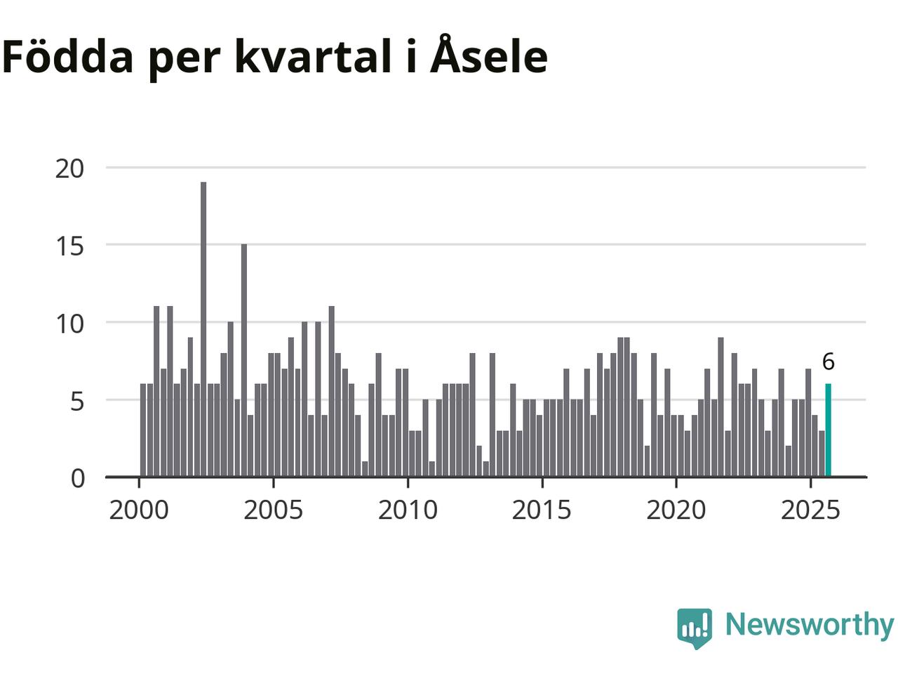 Enligt SCB:s siffror föddes sex barn i Åsele under det senaste kvartalet. Samtidigt avled 14 personer. Skillnaden mellan antal födda och döda är så liten att det inte går att säga om det beror på något annat än SCB:s röjandeskydd. Kommunen har nästan alltid haft negativt födelsenetto tidigare.