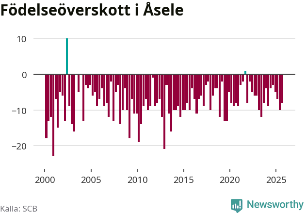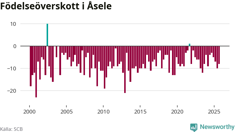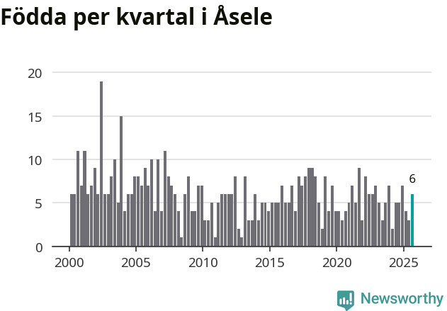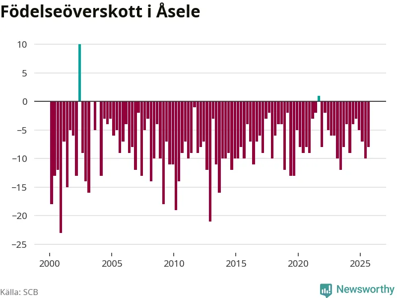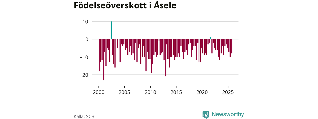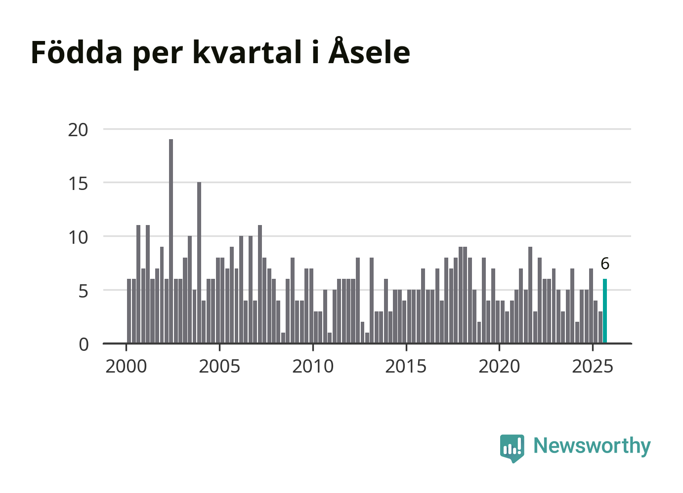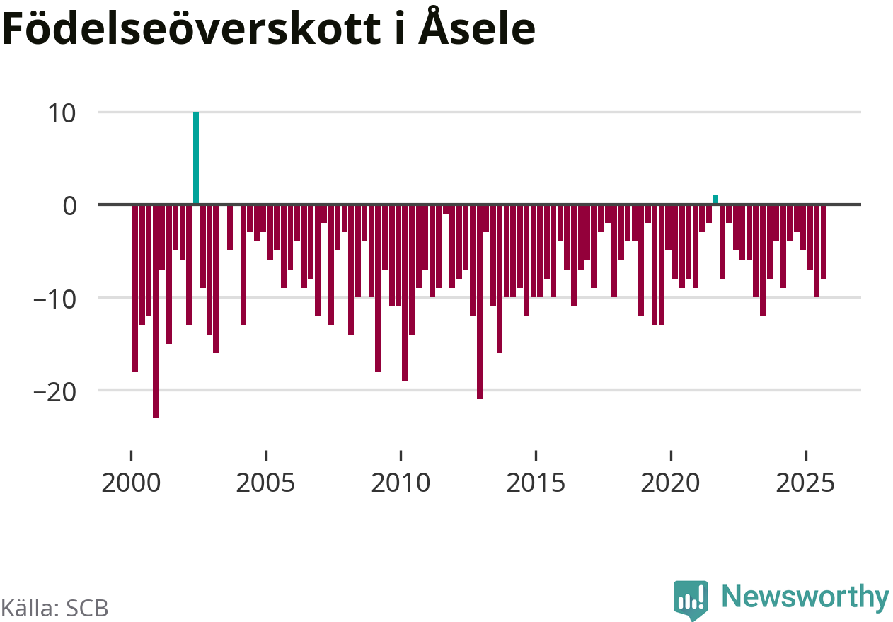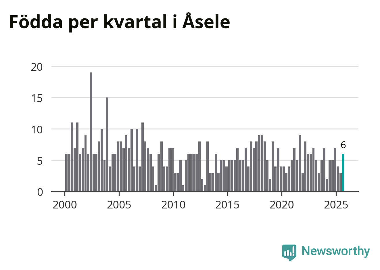 Enligt SCB:s siffror föddes sex barn i Åsele under det senaste kvartalet. Samtidigt avled 14 personer. Skillnaden mellan antal födda och döda är så liten att det inte går att säga om det beror på något annat än SCB:s röjandeskydd. Kommunen har nästan alltid haft negativt födelsenetto tidigare.