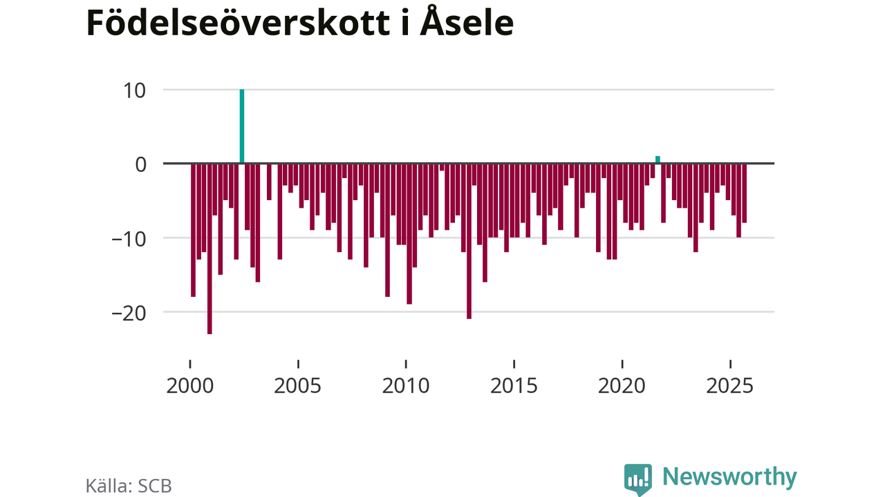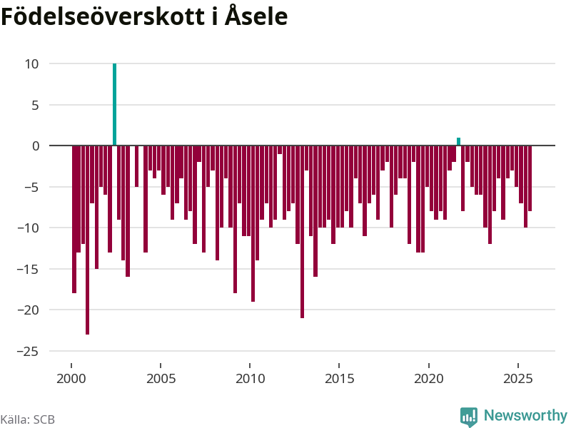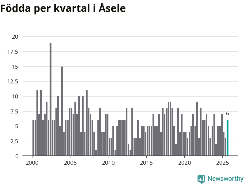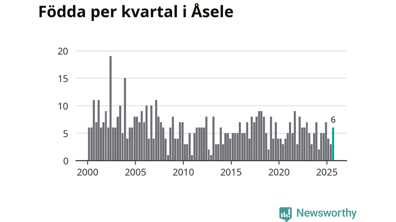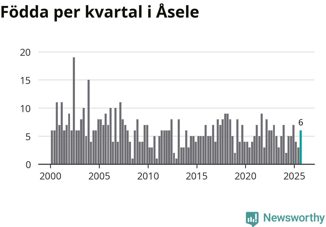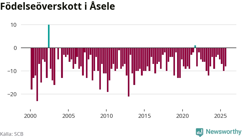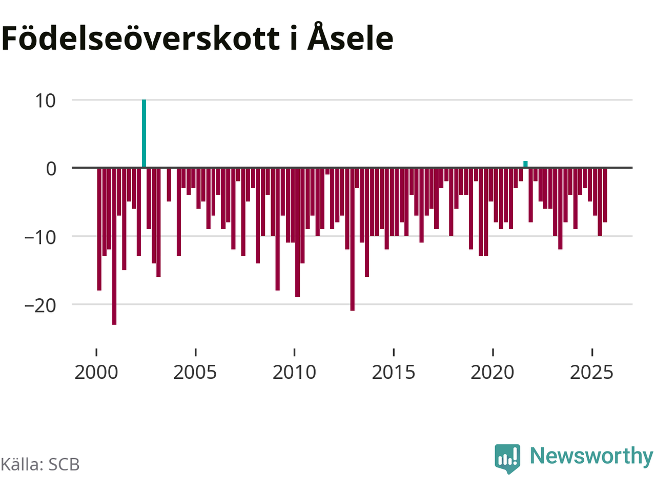 Enligt SCB:s siffror föddes sex barn i Åsele under det senaste kvartalet. Samtidigt avled 14 personer. Skillnaden mellan antal födda och döda är så liten att det inte går att säga om det beror på något annat än SCB:s röjandeskydd. Kommunen har nästan alltid haft negativt födelsenetto tidigare.
