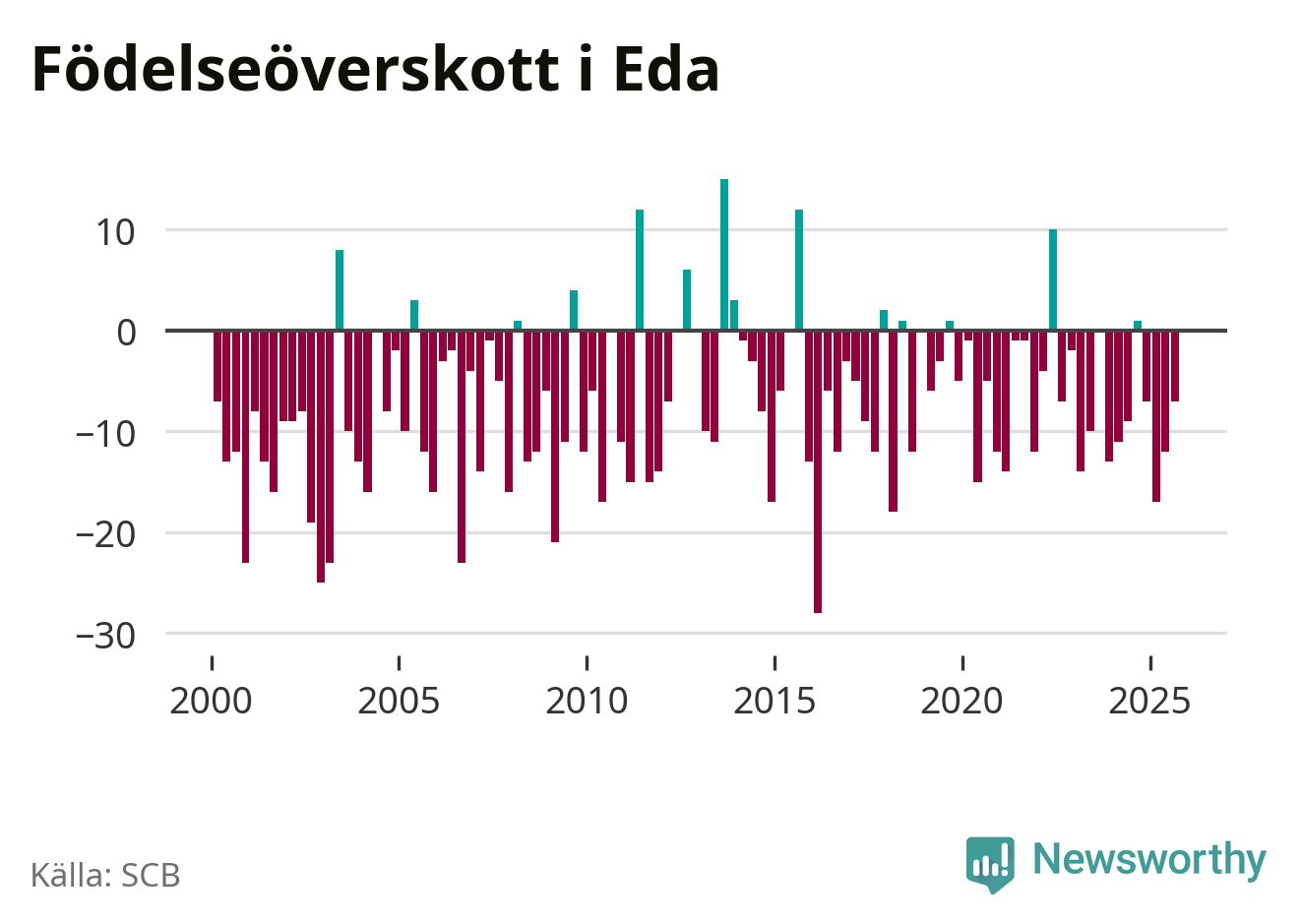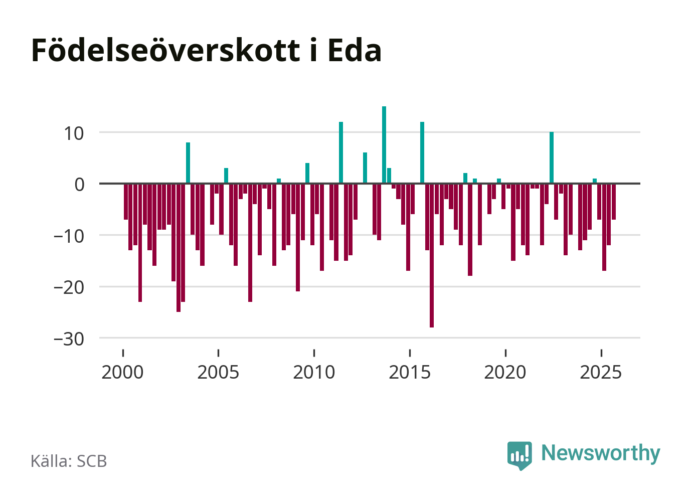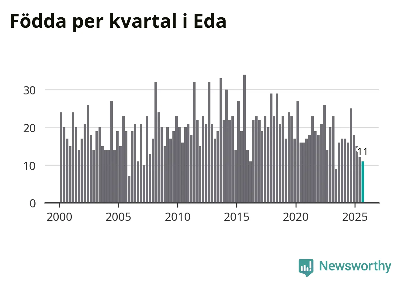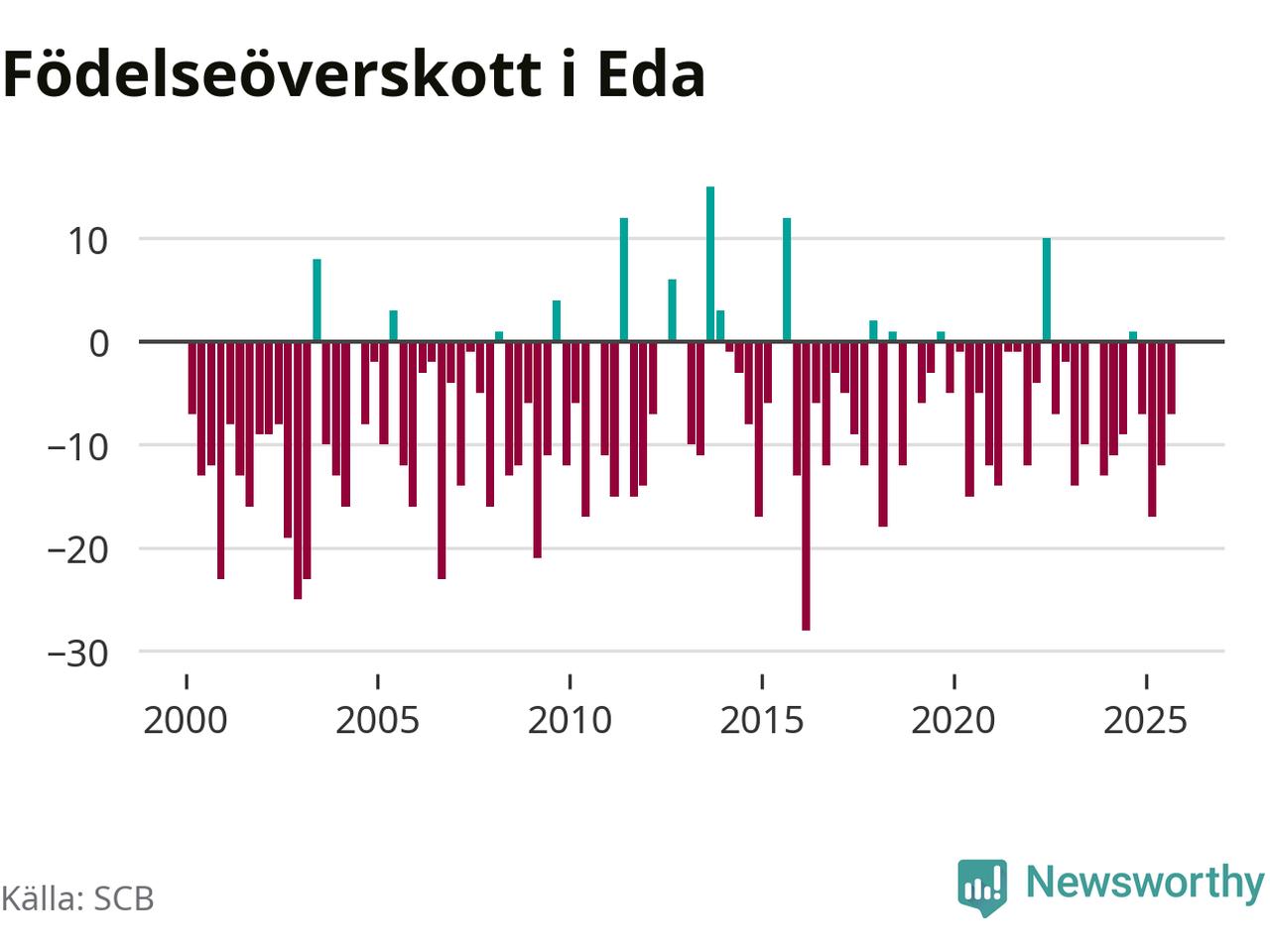 Enligt SCB:s siffror föddes elva barn i Eda under det senaste kvartalet. Samtidigt avled 18 personer. Skillnaden mellan antal födda och döda är så liten att det inte går att säga om det beror på något annat än SCB:s röjandeskydd. Kommunen har oftast haft negativt födelsenetto tidigare.