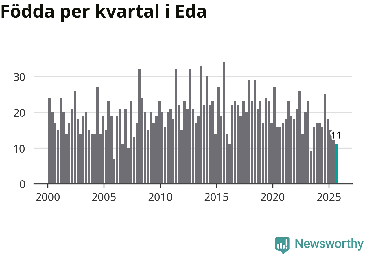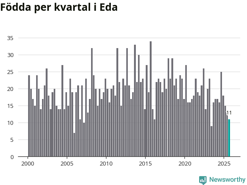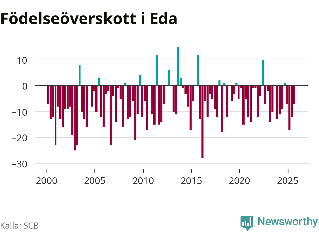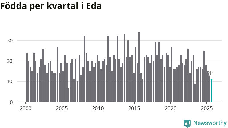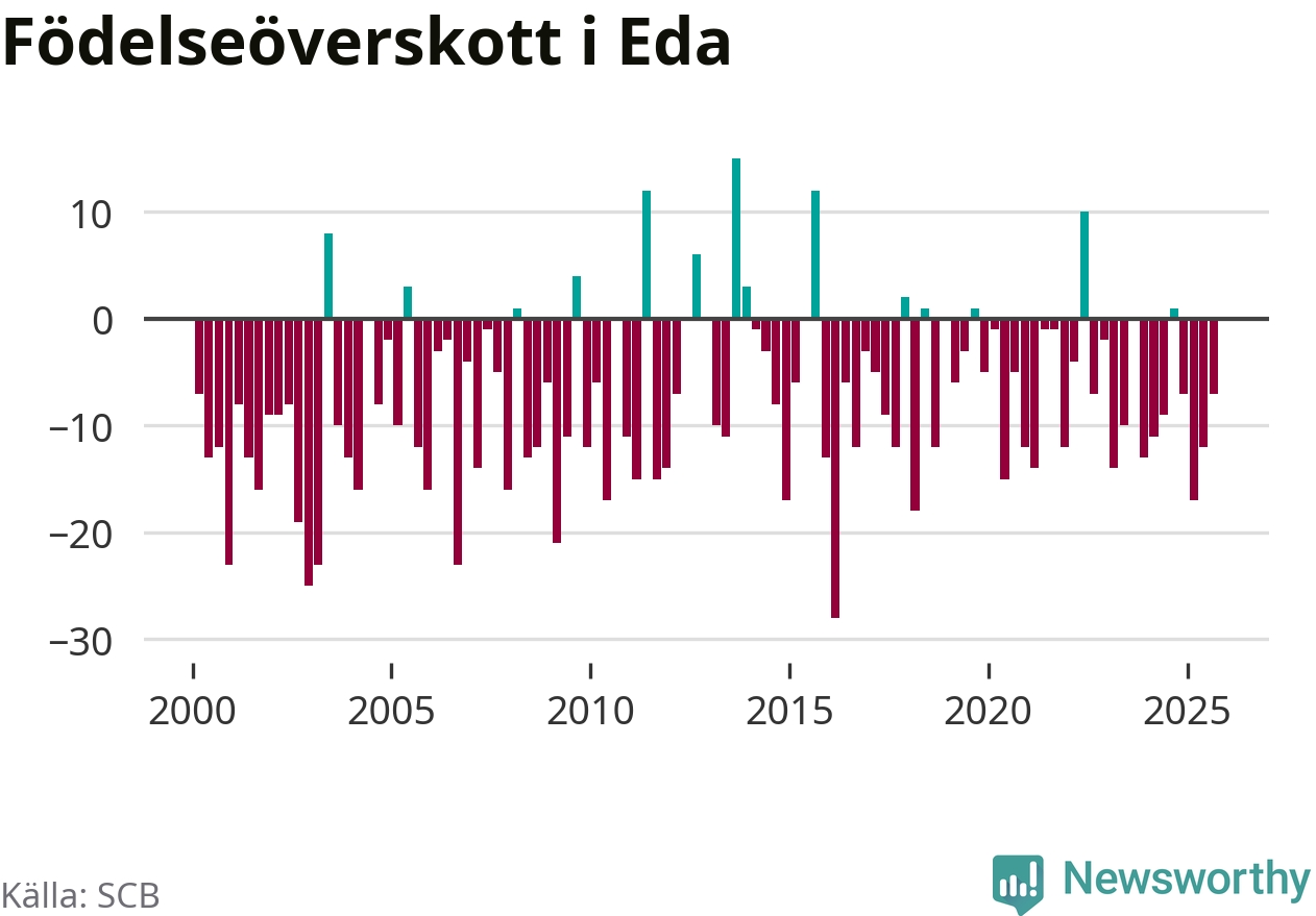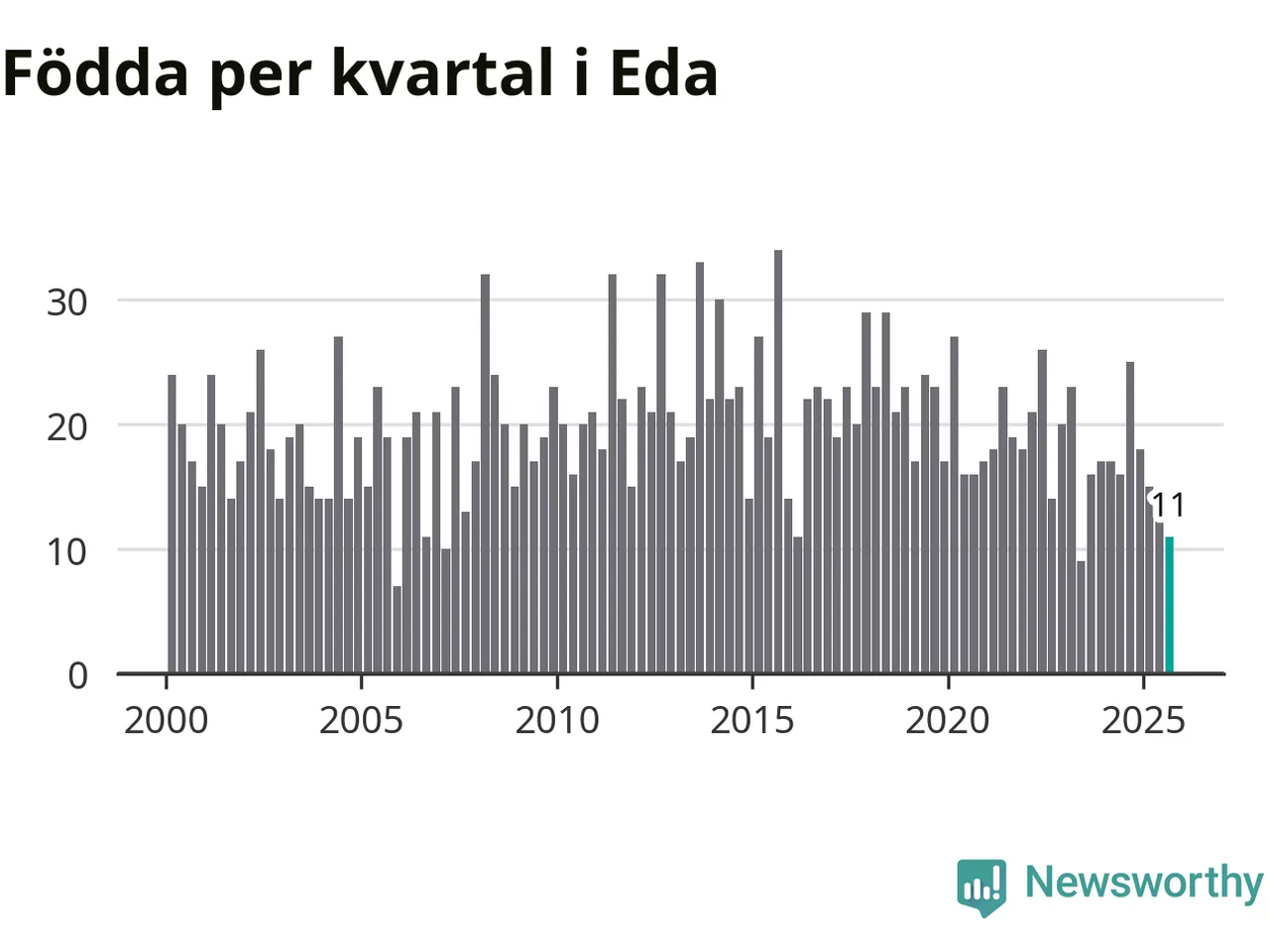 Enligt SCB:s siffror föddes elva barn i Eda under det senaste kvartalet. Samtidigt avled 18 personer. Skillnaden mellan antal födda och döda är så liten att det inte går att säga om det beror på något annat än SCB:s röjandeskydd. Kommunen har oftast haft negativt födelsenetto tidigare.