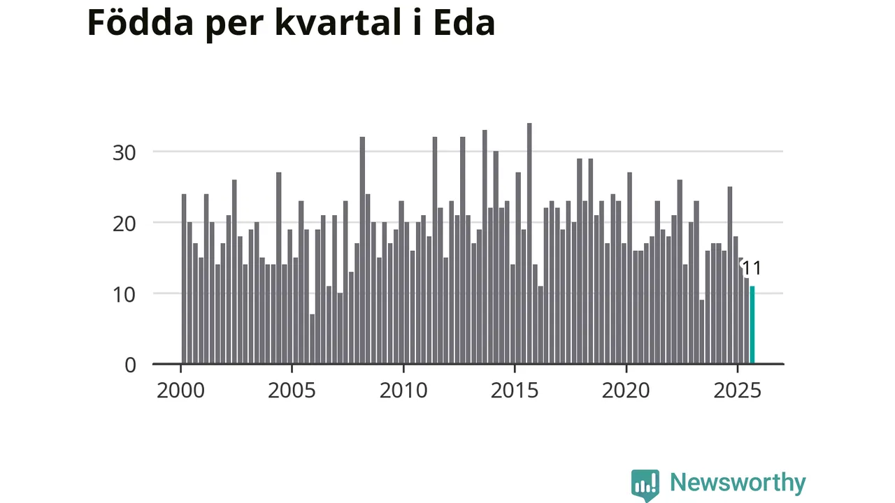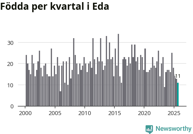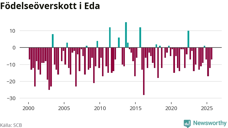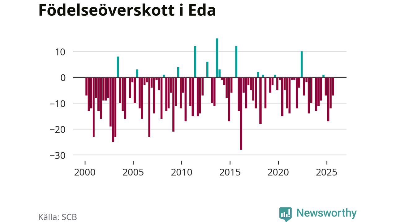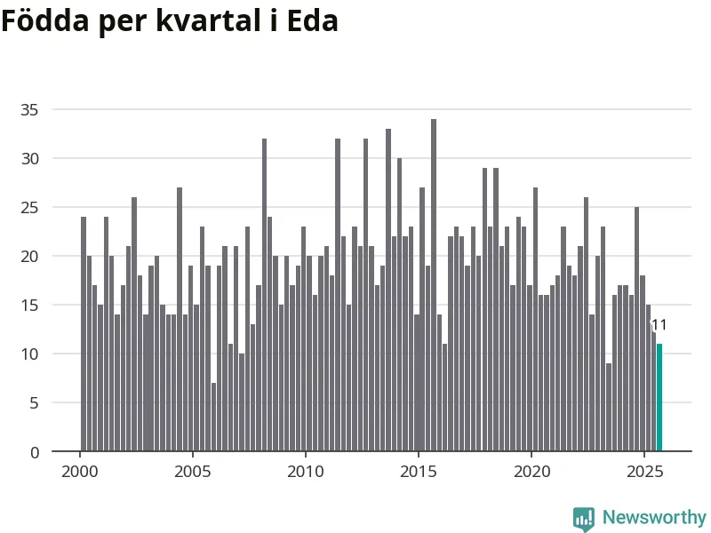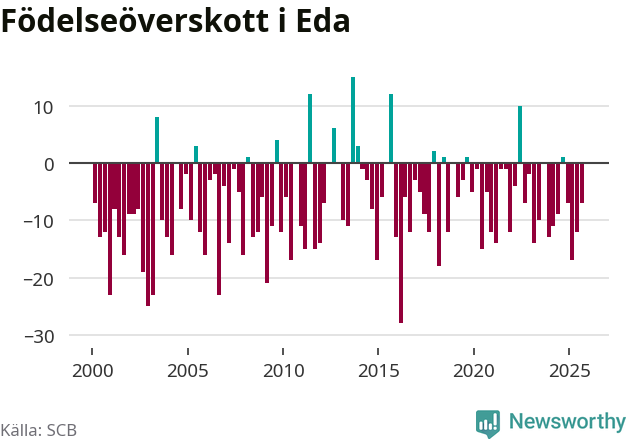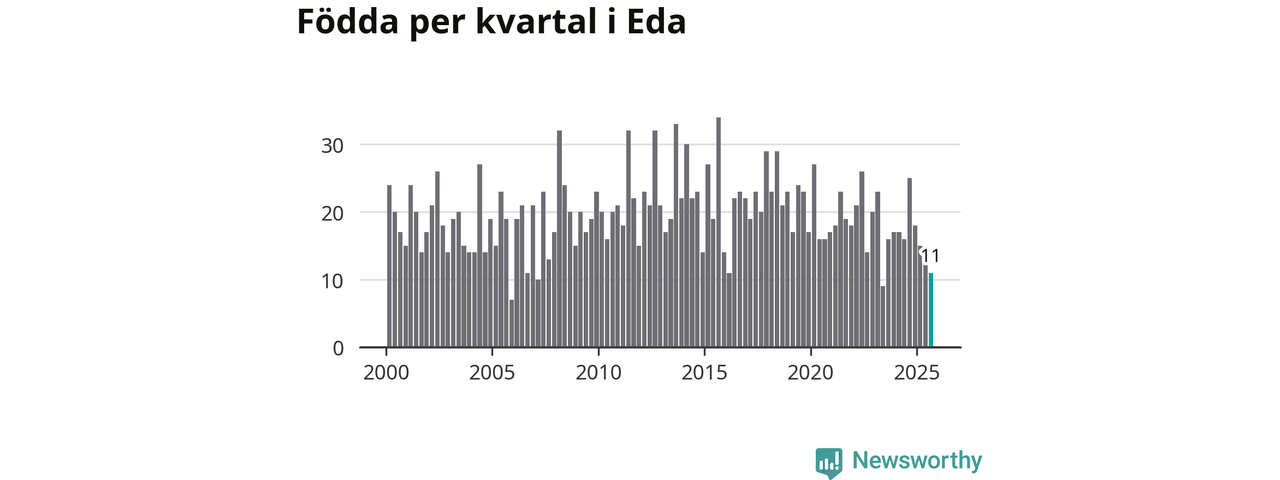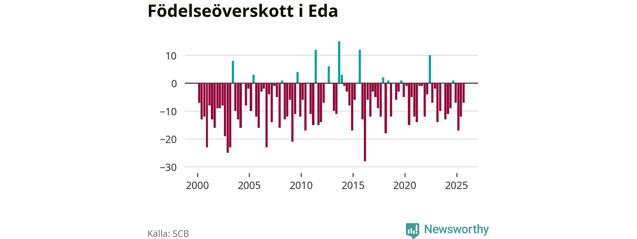 Enligt SCB:s siffror föddes elva barn i Eda under det senaste kvartalet. Samtidigt avled 18 personer. Skillnaden mellan antal födda och döda är så liten att det inte går att säga om det beror på något annat än SCB:s röjandeskydd. Kommunen har oftast haft negativt födelsenetto tidigare.