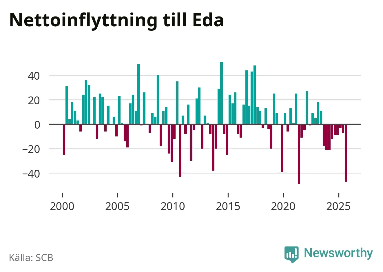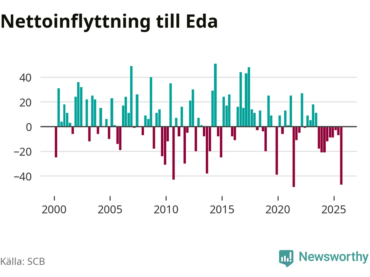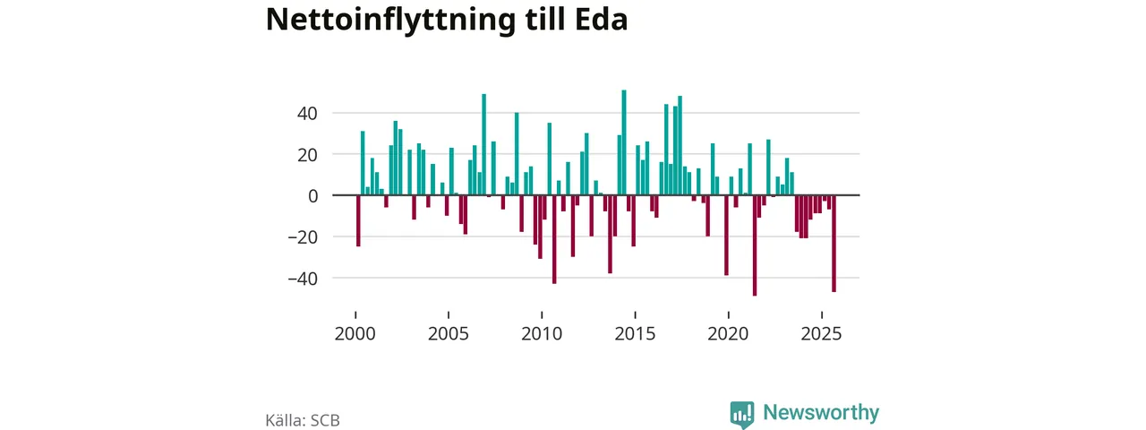 Under tredje kvartalet 2025 flyttade 94 personer till kommunen medan 141 personer flyttade därifrån. Det är historiskt sett en stor utflyttning under ett kvartal. Sedan seklets början har Eda haft ungefär lika många kvartal med positivt flyttnetto som negativt.
