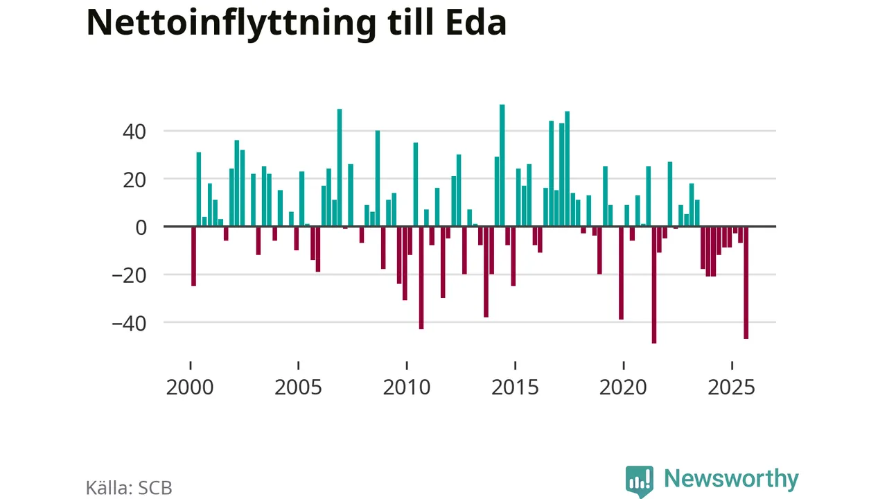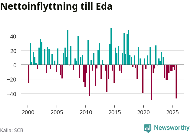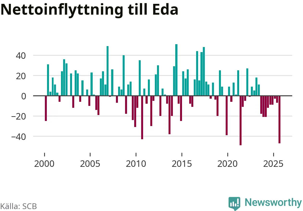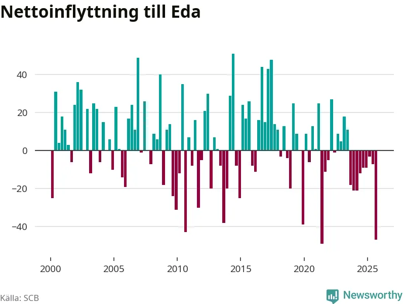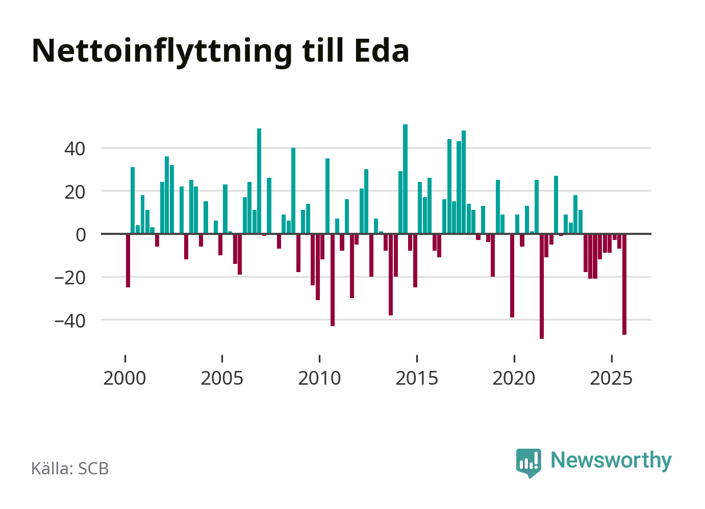 Under tredje kvartalet 2025 flyttade 94 personer till kommunen medan 141 personer flyttade därifrån. Det är historiskt sett en stor utflyttning under ett kvartal. Sedan seklets början har Eda haft ungefär lika många kvartal med positivt flyttnetto som negativt.