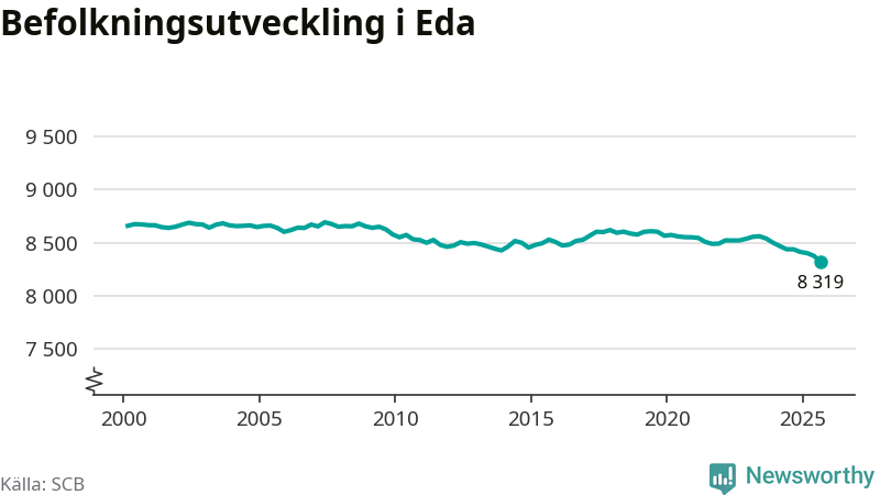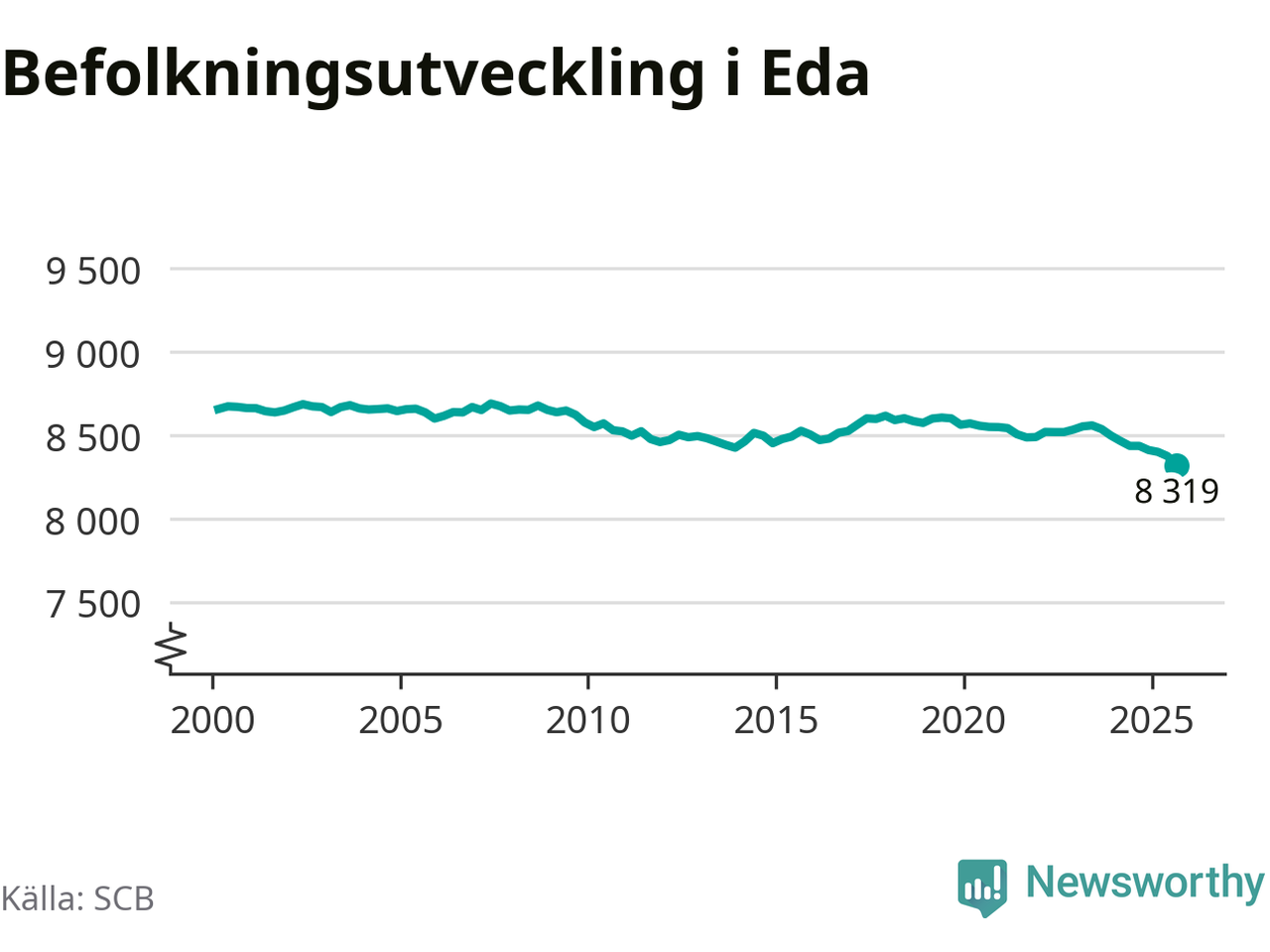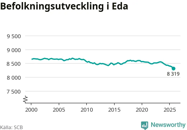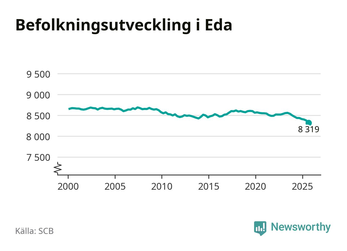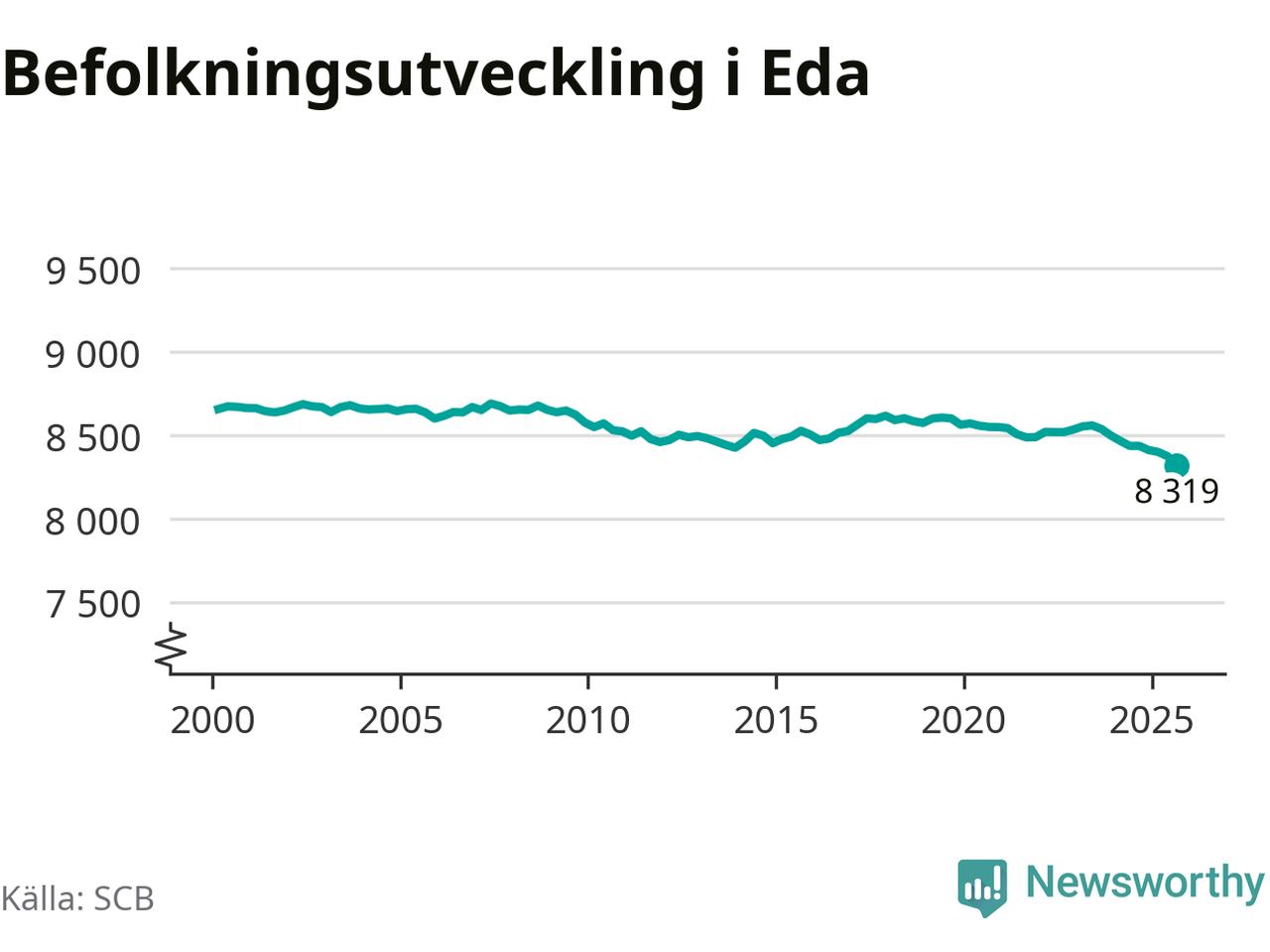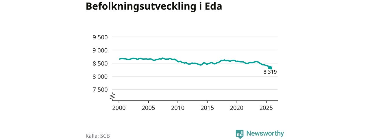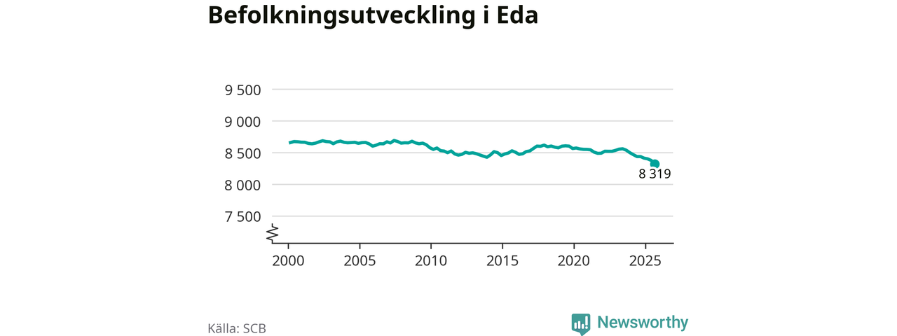 Befolkningen minskade i Eda kommun under det tredje kvartalet 2025. Den 30 september bodde enligt SCB:s senaste siffror 8 319 personer i kommunen, vilket är 57 färre än i slutet av andra kvartalet. Minskningen är den största i Värmland procentuellt sett.